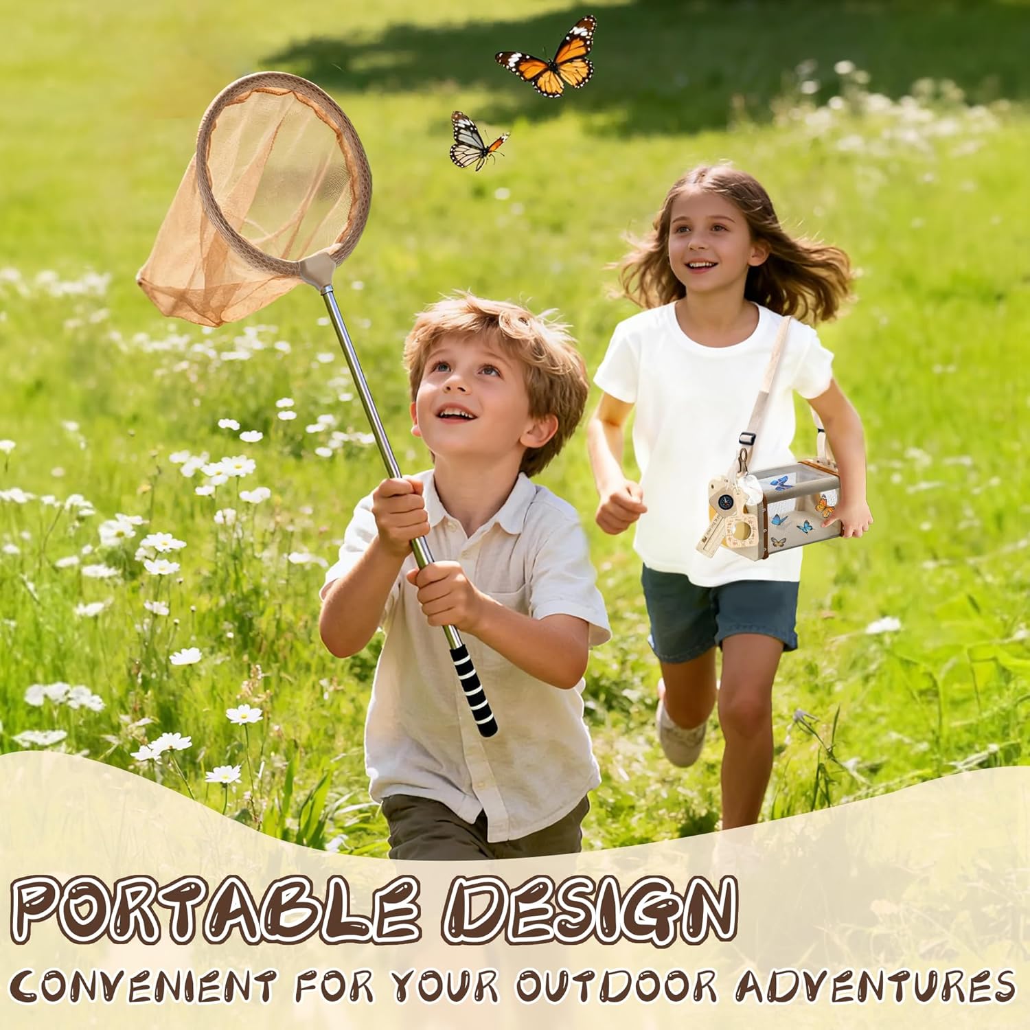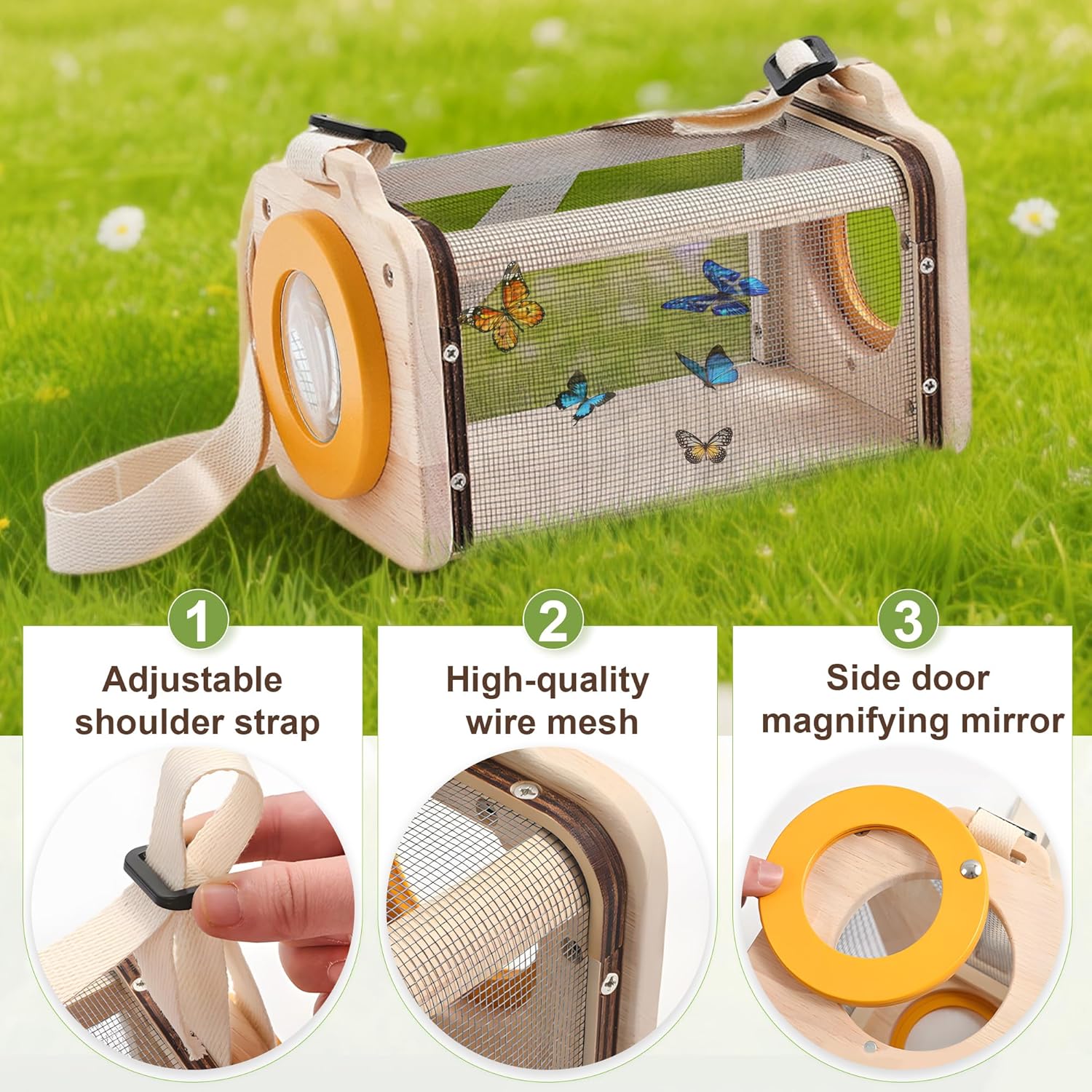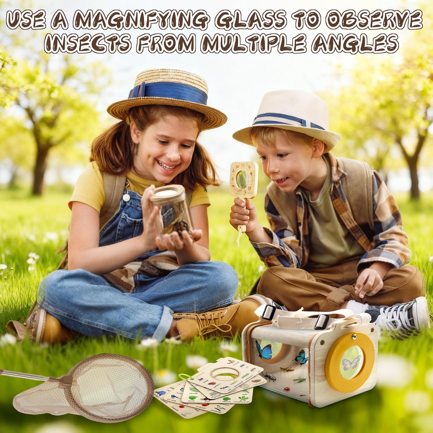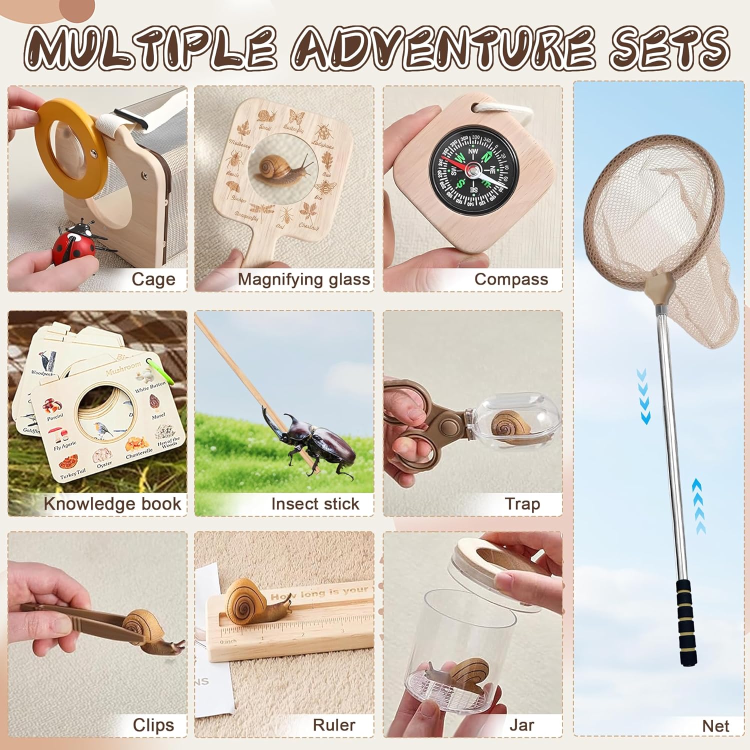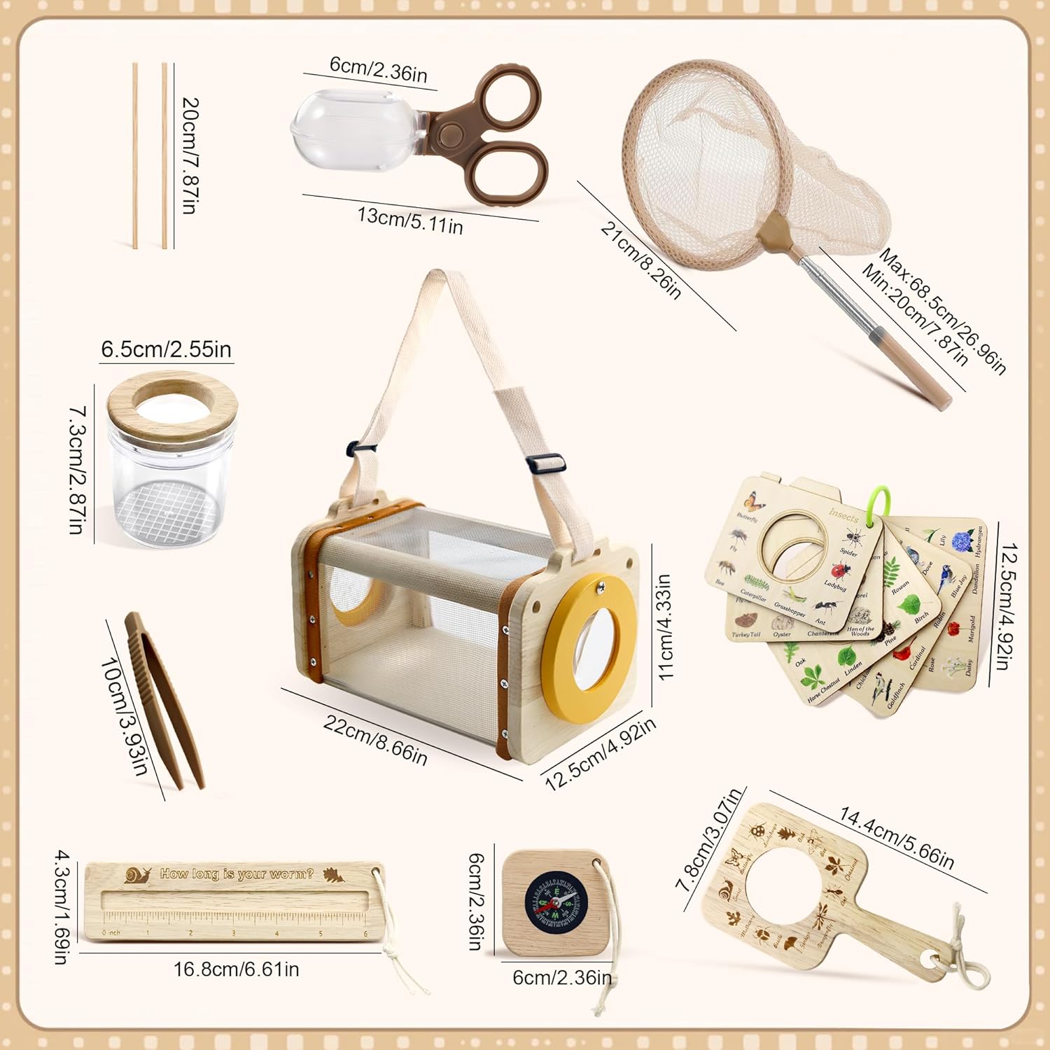 Set per l'esplorazione degli insetti per bambini: questo set comprende una gabbia per insetti in legno, una rete retrattile, una lente d'ingrandimento, una bacchetta per insetti, una trappola, un libro di conoscenze, una bussola, un righello di legno, un barattolo trasparente e trappole per insetti, fornendo ai bambini molti strumenti per esplorare la natura. Durevole: realizzato in legno di alta qualità, questo set da esplorazione all'aperto per bambini è robusto e affidabile, ideale per l'esplorazione e l'osservazione quotidiana all'aperto. Impara giocando, esplora la natura: i bambini sviluppano la loro manualità e la capacità di osservazione catturando e osservando gli insetti, approfondendo la loro comprensione del mondo naturale attraverso il gioco. Leggero e portatile, facile da trasportare: il nostro set di trappole per insetti per bambini ha un anello per appendere per fissare tutti gli elementi. La gabbia per insetti è dotata di maniglia, la rete è retrattile e gli accessori sono compatti, il che ne facilita l'utilizzo all'aperto o in giardino. Idea regalo ideale: questo set di trappole per insetti in legno per bambini è un fantastico regalo di compleanno o di vacanza, riducendo il tempo trascorso davanti allo schermo e incoraggiando i bambini a divertirsi ed esplorare la vita all'aria aperta.