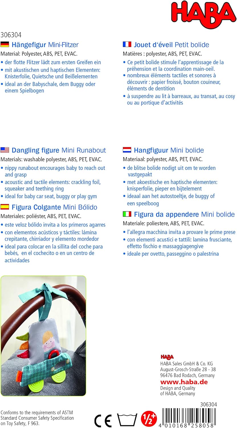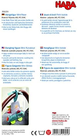 La statuetta sospesa Mini Flitzer di Haba è un ottimo giocattolo da appendere a passeggini, archi da gioco, passeggino e letto; dimensioni 35 x 15 cm. Progettato con amore con molti colori, pellicola frusciante, cigolio e pellicola a specchio invita i bambini a giocare Il divertente giocattolo in tessuto per bambini a partire dai 6 mesi favorisce la prima presa e stimola i sensi con effetti per sentire, ascoltare e vedere Giocattolo per bambini da viaggio e a casa: colorato ciondolo attivo per cambiare e divertirsi con suoni, movimento e diverse superfici Con elementi per la dentizione che aiutano la dentizione e massaggiano piacevolmente le gengive. Il giocattolo motorio è lavabile in lavatrice a 30 °C