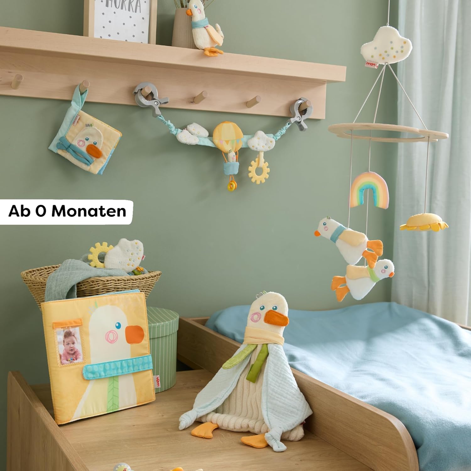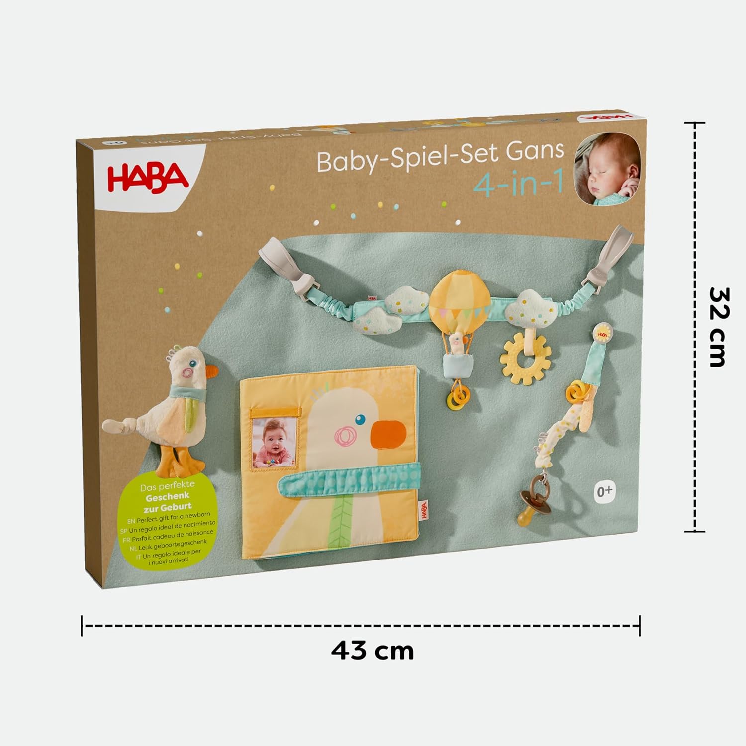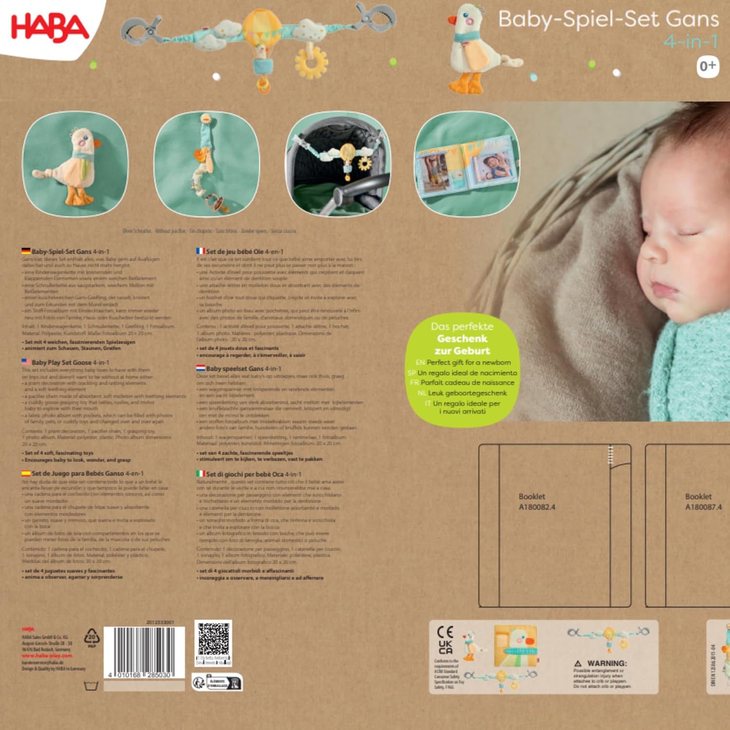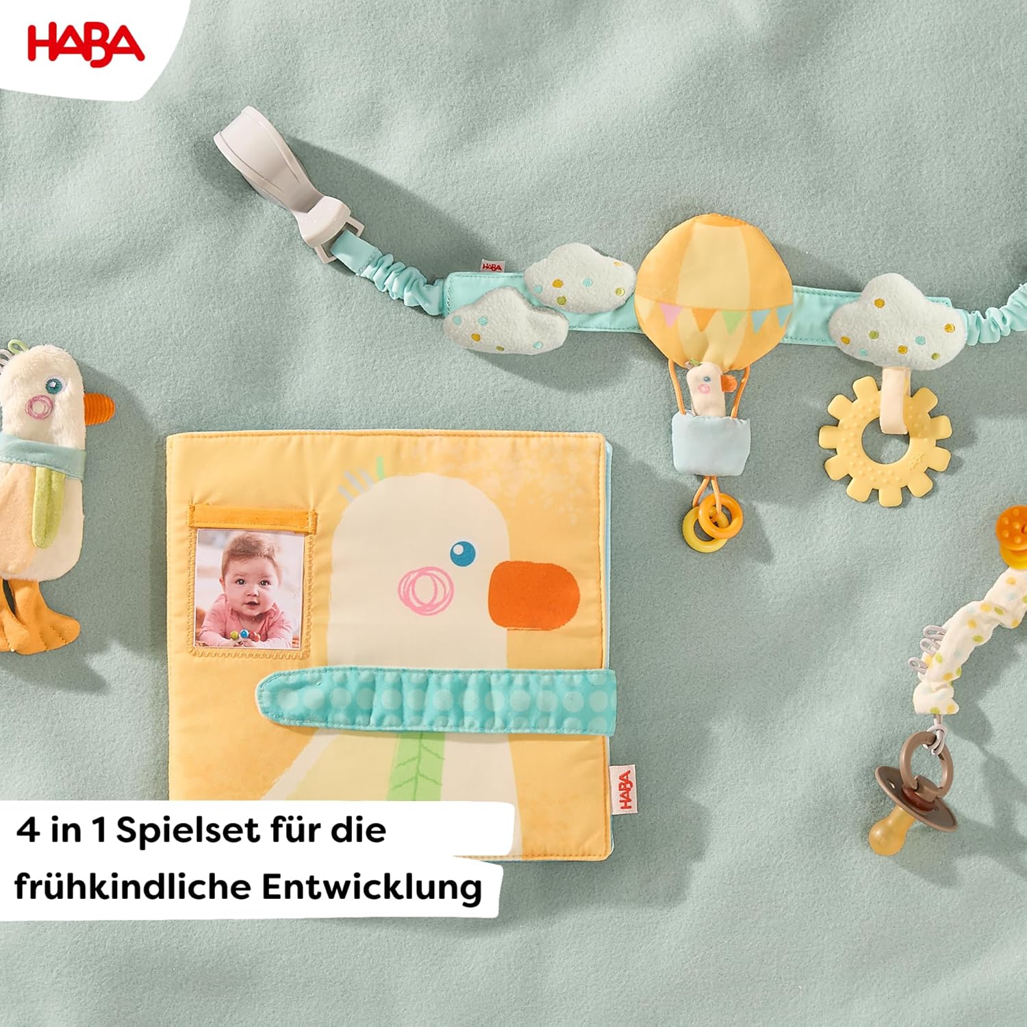 Set di giochi: set 4 in 1 con catenella per passeggino, catenella per ciuccio e album fotografico in tessuto, perfetto per lo sviluppo precoce del bambino. SVILUPPO SENSORICO: diverse trame, elementi scoppiettanti e suoni sonagli promuovono la percezione tattile e lo sviluppo sensoriale. CARATTERISTICHE PRATICHE: morbidi elementi per dentizione dei bambini, tessuto molton assorbente e catene facili da fissare per passeggini. Personalizzabile: l'album fotografico in tessuto con tasche consente di personalizzare con foto di famiglia, foto di animali domestici o motivi preferiti. Adatto all'età: appositamente progettato per i bambini dalla nascita, tutti i materiali sono adatti ai bambini e promuovono giocosamente lo sviluppo motorio.