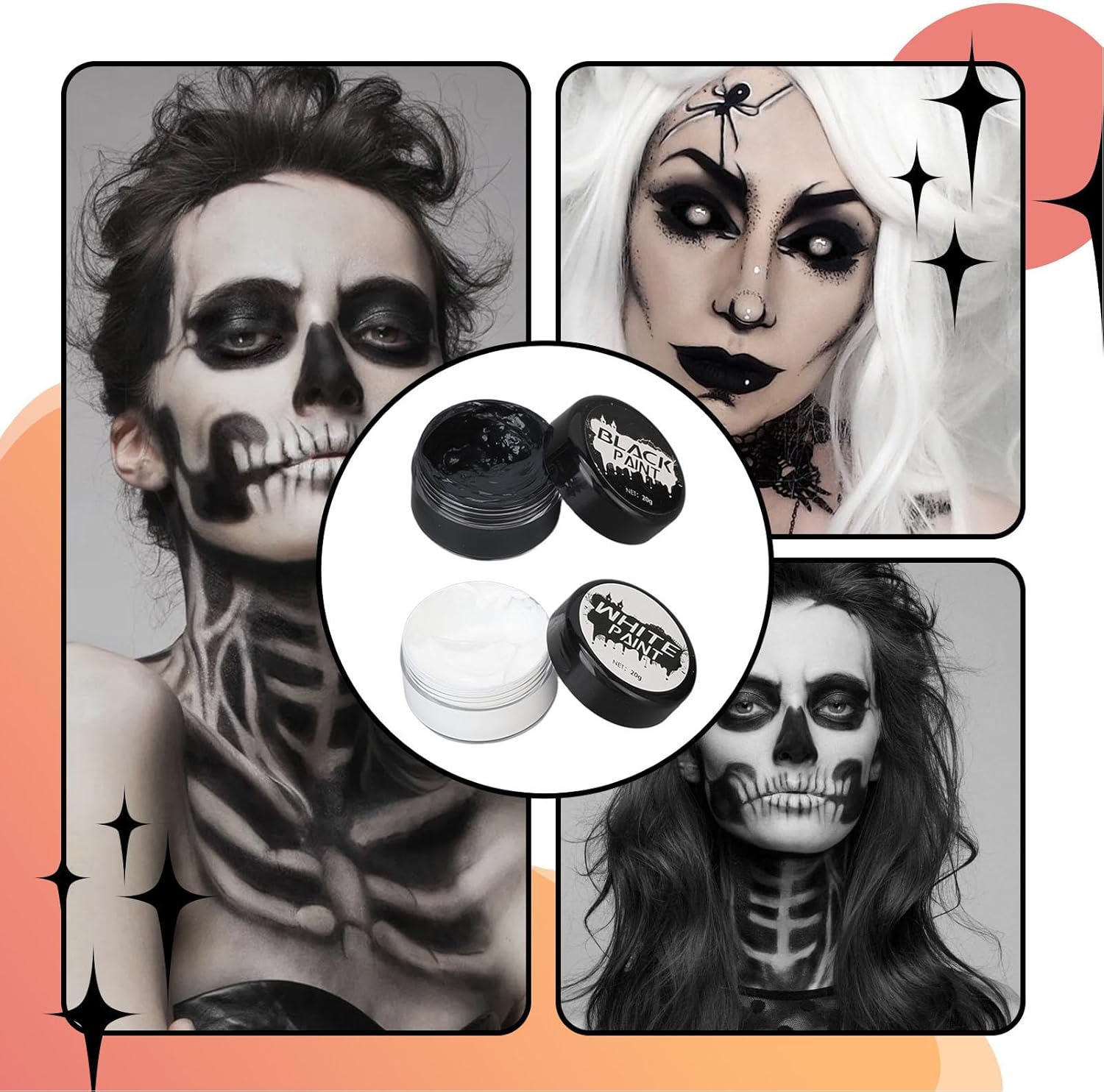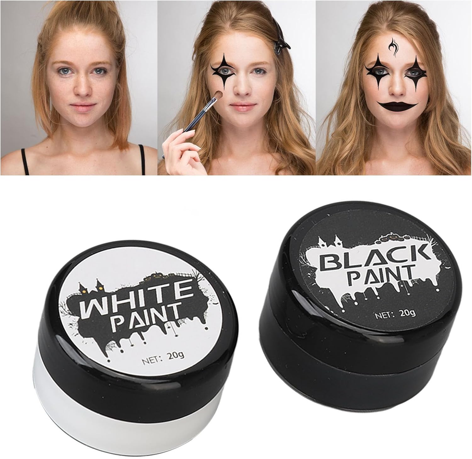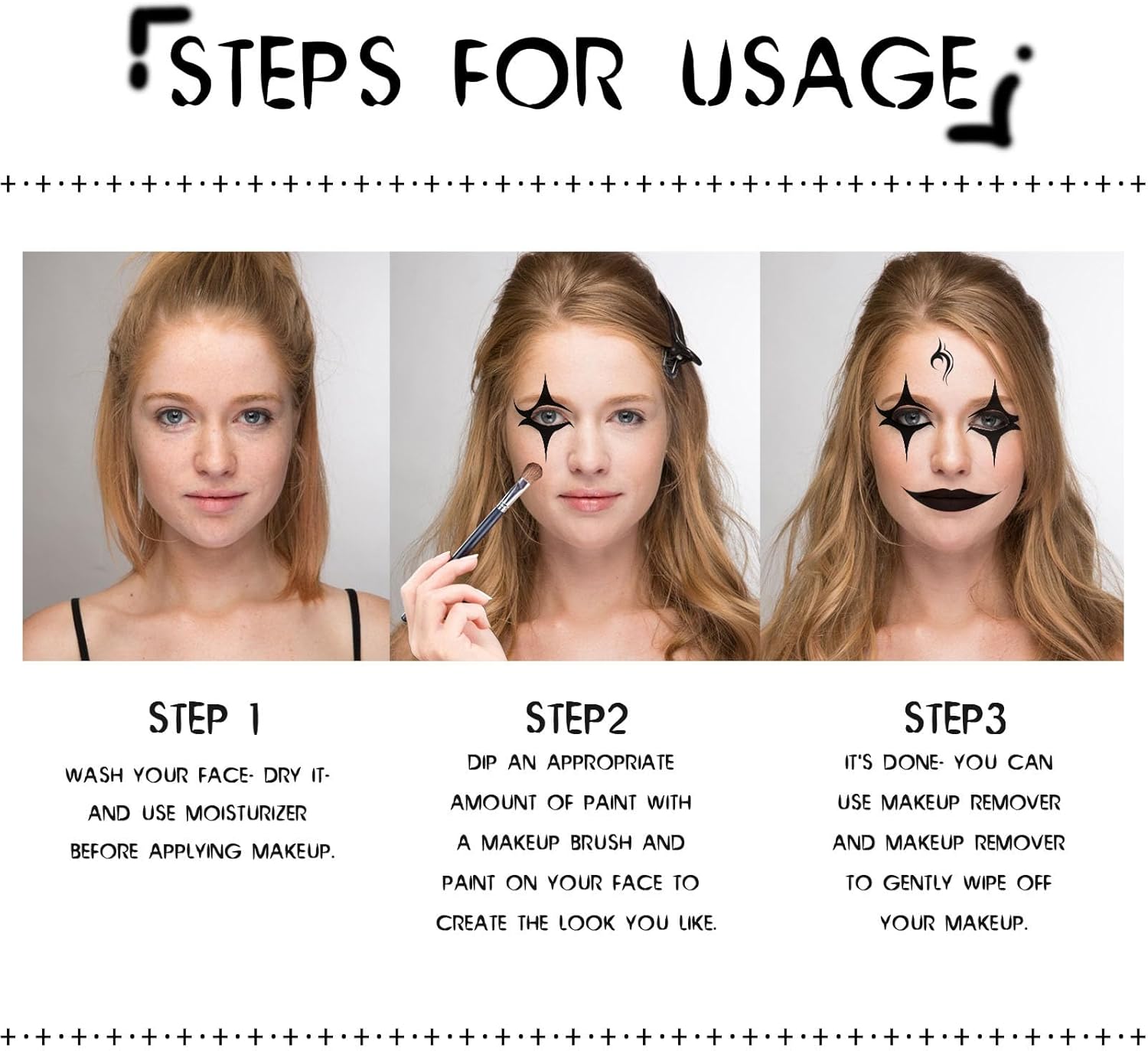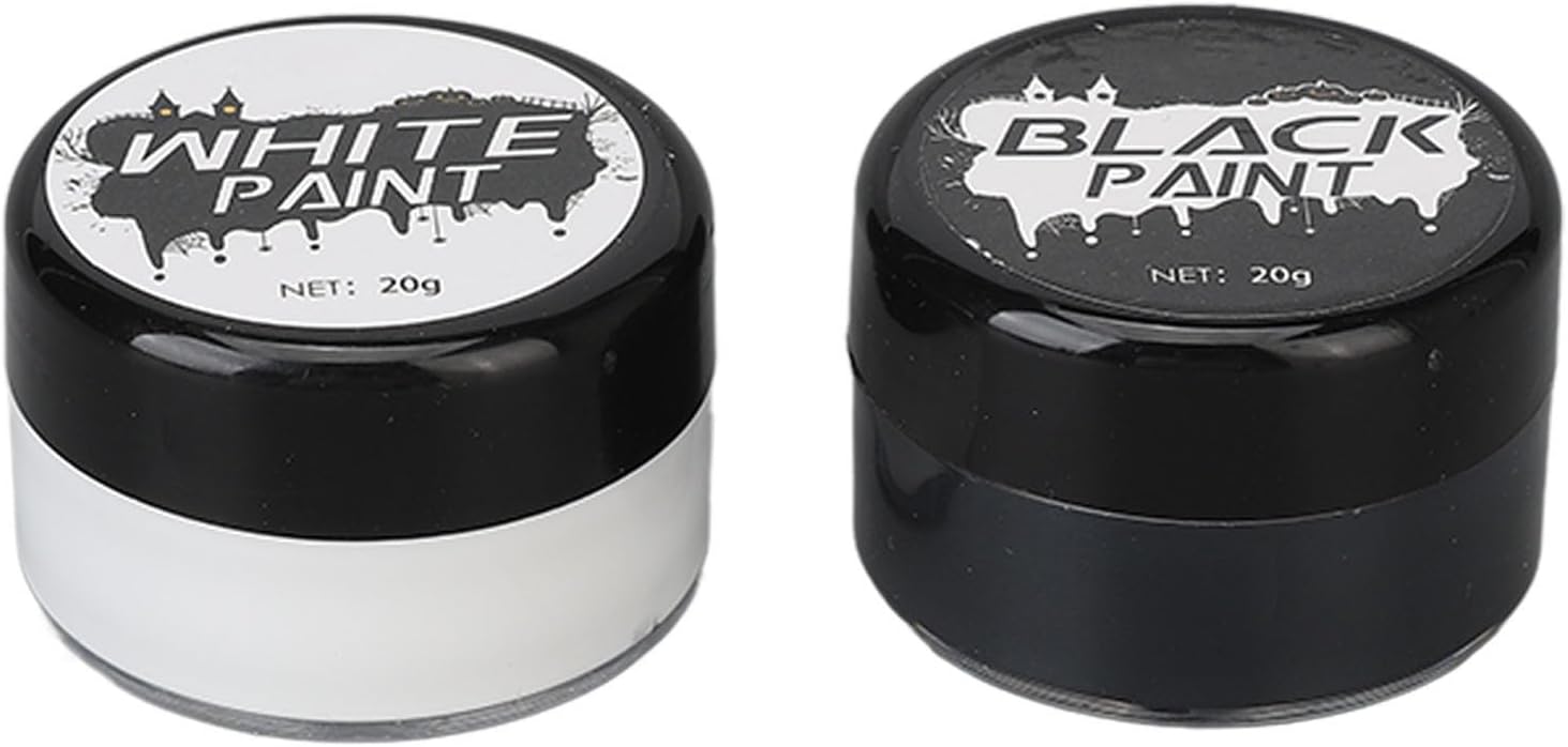 Sicuro e non irritante: è un prodotto di grado cosmetico che è basso allergenico, adatto alla pelle e non irritante. Può essere applicato direttamente alla pelle. Facile da usare: vernice per trucco nero, vernice per il trucco bianco e due pennelli per il trucco, strumenti completi, trucco semplice e veloce, effetto orribile e realistico, un set di trucco di Halloween necessario. Facile da rimuovere e pulire: prima rimuovi con il trucco e il pad di cotone, quindi puoi pulire il viso e il corpo con detergente per il viso senza lasciare alcun . Occasioni applicabili: Halloween, feste di atmosfera spaventose, spettacoli di trucco, carnevali, effetti speciali su vacanze o programmi TV, scherzi e altre scene, facili da creare forme realistiche e spaventose. Conservazione del trucco a lungo termine: dopo aver applicato il pigmento per il trucco al viso, non è necessario preoccuparsi che venga speso o scolorito. La vernice è resistente al sudore, e anche se giocato tutto il giorno, non toglierà il trucco.