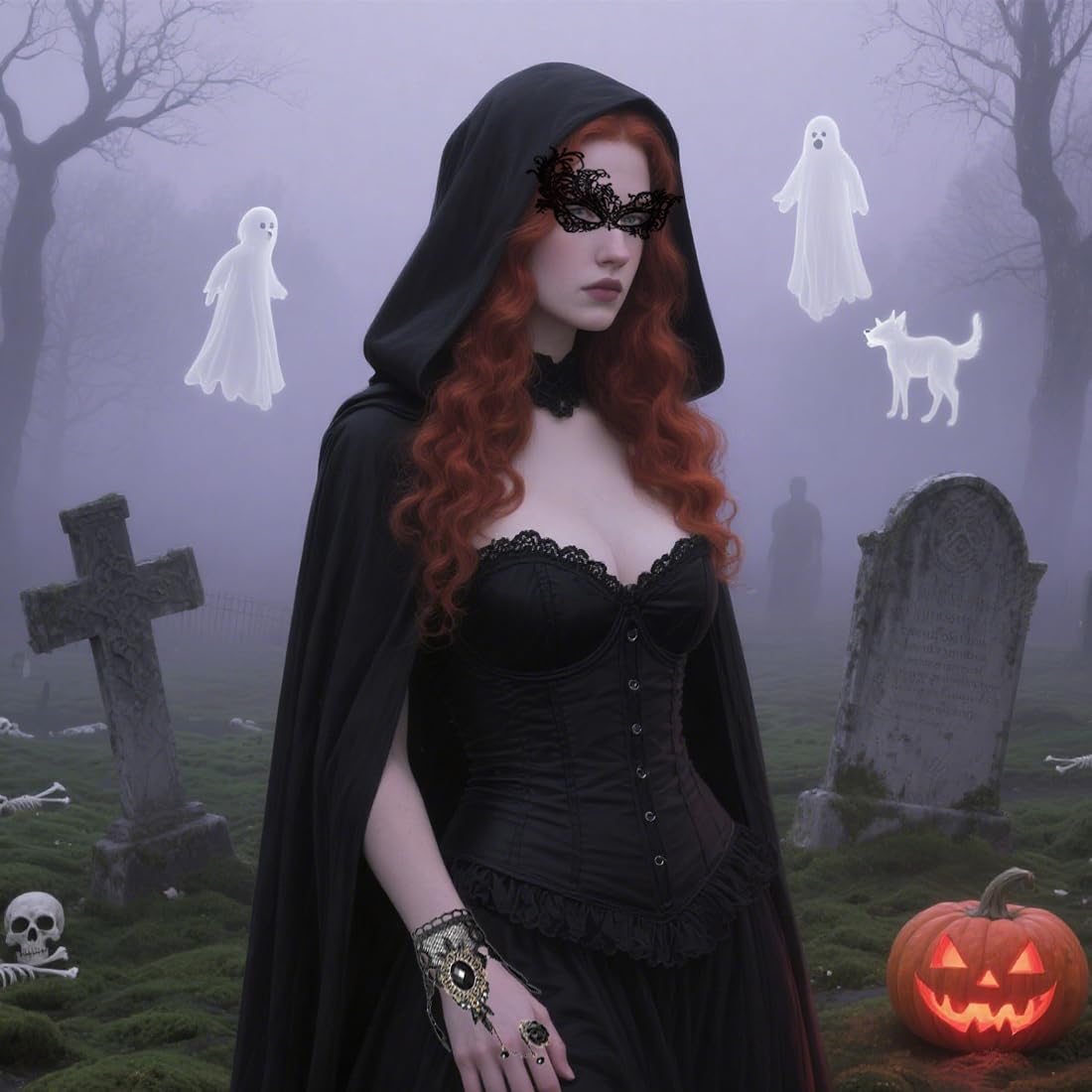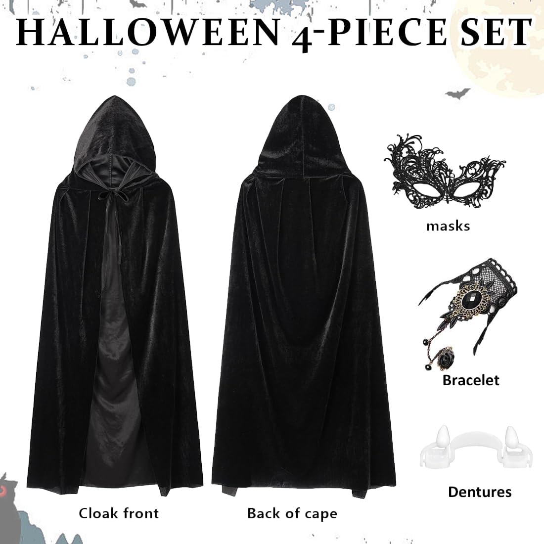 Descrizione prodotto Halloween Costume Signore Mantello Nero con Maschera Set, Halloween costume mantello set di 4, 140cm Halloween Costume Vampiro mantello nero cappotto per Halloween Carnevale Cosplay Party Avviso di sicurezza No