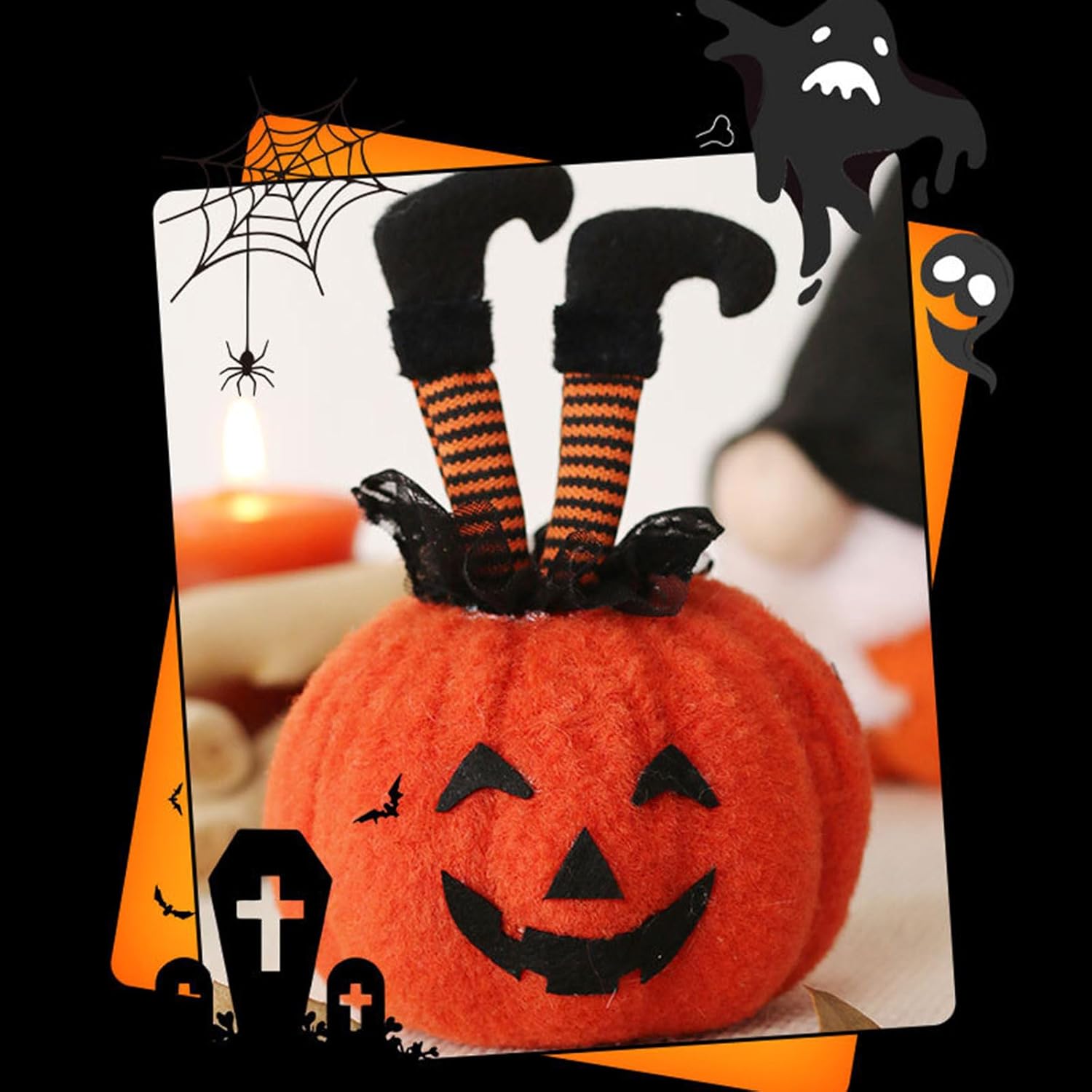 Lasciati avvolgere gli spiriti del festival con le gambe di strega ornamento di peluche, una grande aggiunta alle decorazioni di Halloween che aggiungono un tocco di fascino a qualsiasi stanza Realizzato in tessuto di alta qualità con colori chiari, accuratamente dettagliato e offre un display accattivante per la tua scrivania Perfetto per gli appassionati di Halloween, i collezionisti e coloro che amano le decorazioni stagionali, si rivolge ad adulti e bambini per decorare il proprio spazio Questi gioielli di peluche a forma di zucca non servono solo come decorazioni fantastiche, ma offrono anche un ottimo regalo o una festa per garantire che Halloween sia condiviso e apprezzato Migliorare l'impostazione del tavolo per feste di Halloween o aggiungere fascino alla scrivania dell'ufficio. Questi ornamenti creano un luogo incantevole ovunque si trovino