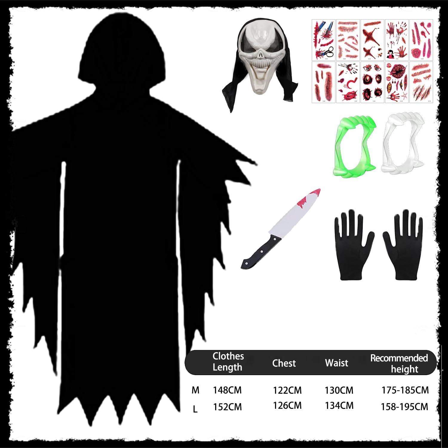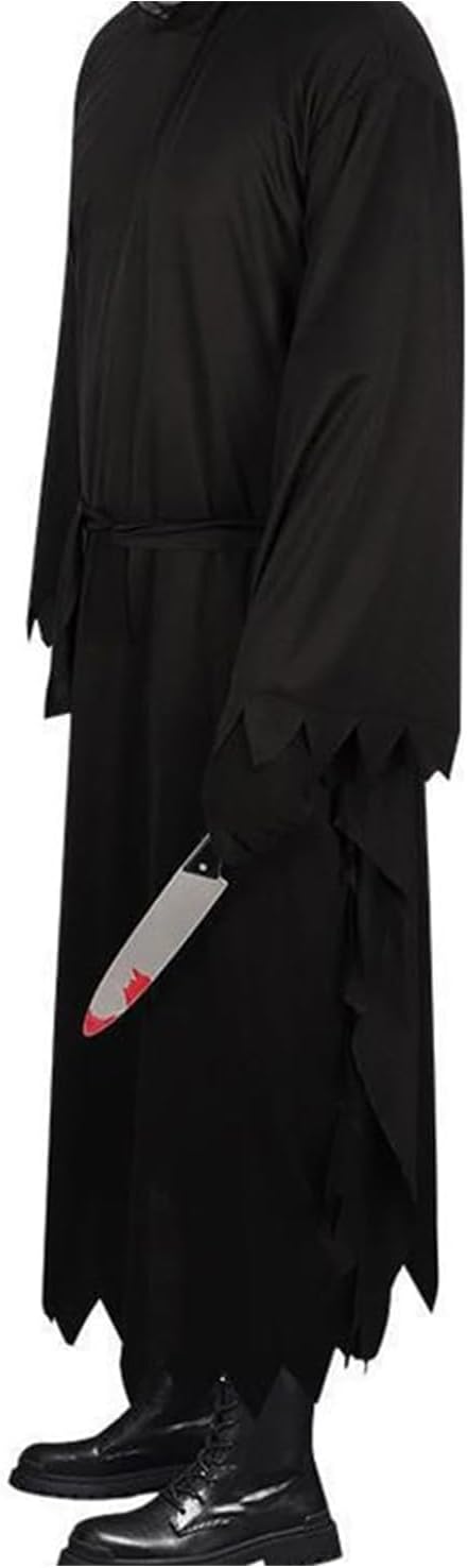 Descrizione prodotto Halloween Ghostface Costume, Scream Costume, Halloween Horror Dress Up con Scream Ghostface Mask, Veste Nera, Cintura, Coltello da Puntello, per Halloween Carnevale Cosplay Feste Avviso di sicurezza Contiene giocattolo. Si raccomanda la sorveglianza di un adulto
