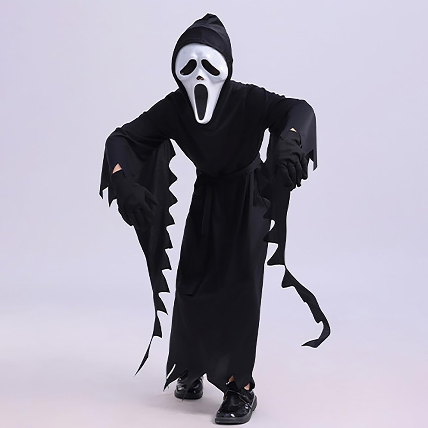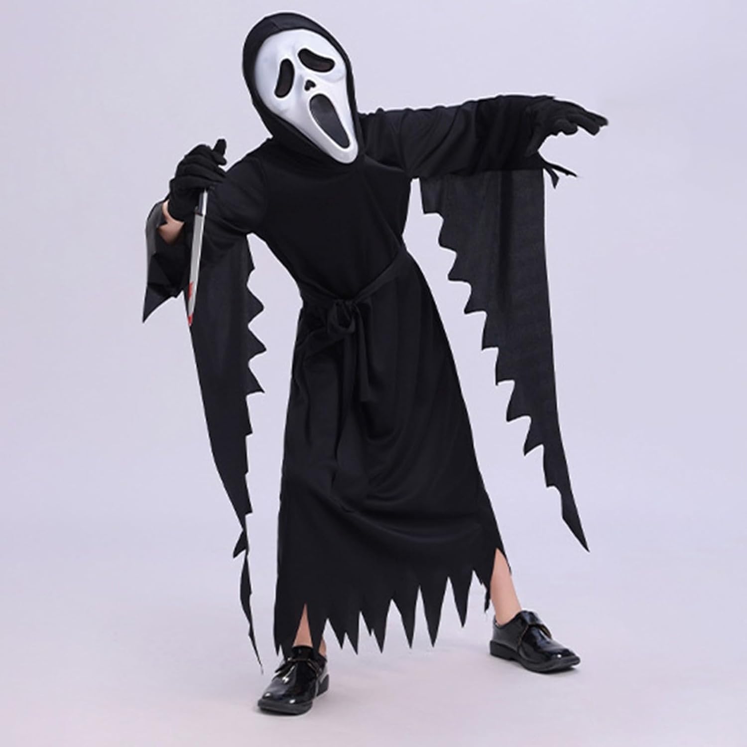 Halloween Scream Costume Bambini: Questo scream costume cosplay per bambini include 1 mantello da urlo per bambini, 1 maschera da fantasma Qualità Eccellente: Questo costume da mietitore di Halloween per bambini è realizzato in poliestere, garantendo una vestibilità comoda. Il design della maschera da fantasm si adatta al contorno del viso e può adattarsi a diverse dimensioni della testa. Il tessuto ultrasottile della maschera separata e l'apertura extra-large garantiscono il massimo comfort per i bambini! Design Classico: Il horror ghost face costume presenta un classico design con tunica nera, che lo rende uno stile classico per qualsiasi festa. Classica espressione urlante che lo rende ancora più spaventoso e spaventoso al buio. Con questo costume da urlo di Halloween, il tuo bambino si trasformerà nel protagonista di un costume da film di paura. Horror Ghost Face Costume per Bambini: Questo spaventoso costume da urlo di Halloween può essere utilizzato anche come costume da fantasma, facile da indossare, perfetto per feste di Halloween, feste a tema scream, costumi horror, Carnevale, feste a tema e altro ancora! Taglia: si prega di scegliere la taglia appropriata in base alla tabella delle taglie