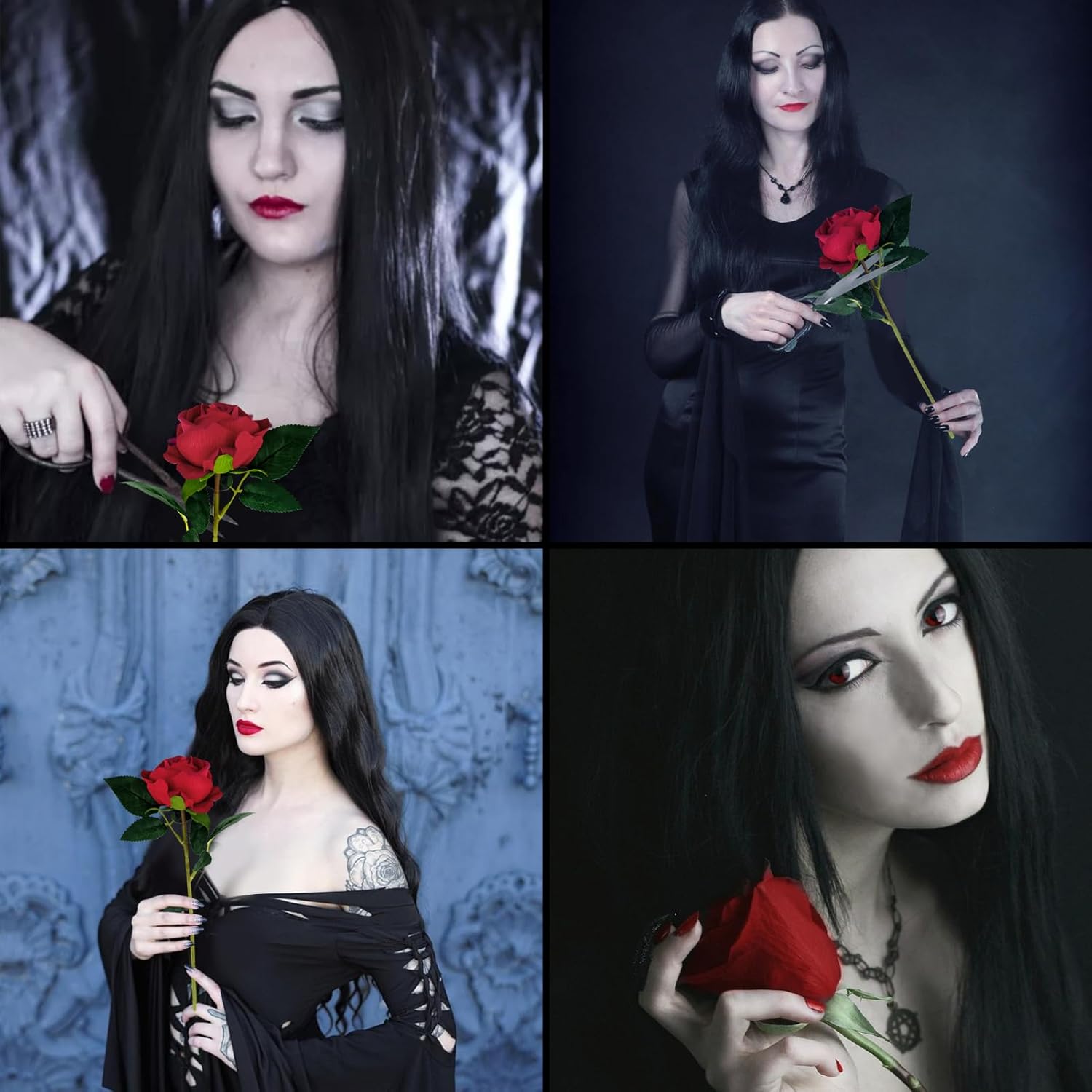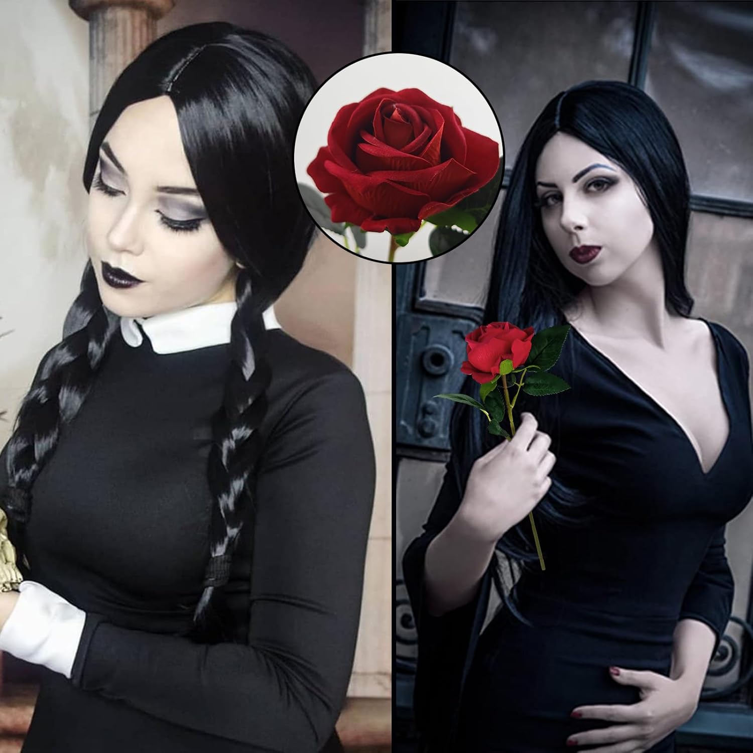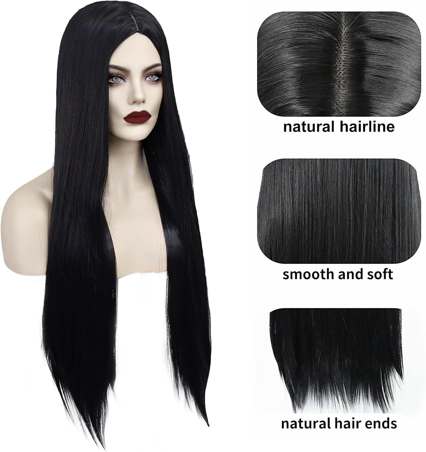 Set di rose per parrucca: riceverete 1 parrucca nera, 1 rete per parrucca e 1 rosa artificiale rossa. La parrucca nera misura circa 85 cm di lunghezza ed è particolarmente adatto per cosplay in vestiti di Halloween per ragazze. Materiale di alta qualità: la parrucca è realizzata con materiali di alta qualità, è di alta qualità, morbida e liscia, riduce i nodi e la caduta dei capelli, è inodore, facile da pulire e adatta per un uso a lungo termine. Sito web per parrucche: la rete per parrucca è realizzata in morbido nylon traspirante e dispone di una fascia elastica antiscivolo. Si può regolare in base alla circonferenza della testa per fissare i capelli e garantire una perfetta aderenza della parrucca Stile unico: una parrucca nera con una rosa artificiale rossa ti renderà accattivante. È adatto per quasi tutte le occasioni in cui è necessaria una parrucca ed è anche un ottimo regalo per mamme e amici. Ampia gamma di applicazioni: le parrucche lunghe nere sono adatte per diverse tonalità della pelle ed età e possono essere utilizzate nella vita quotidiana. Insieme alle rose sono particolarmente adatte per feste cosplay, Halloween, carnevale, feste a tema, feste in maschera, feste in costume e altre occasioni.