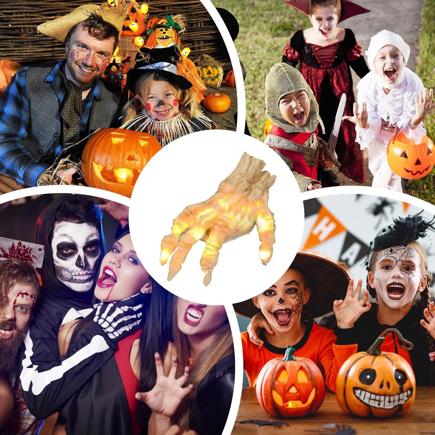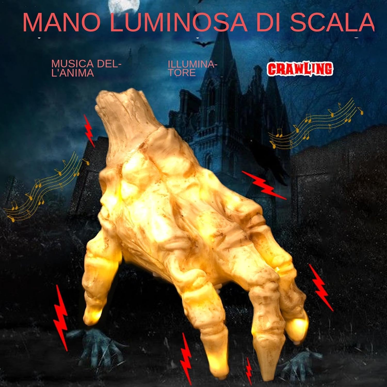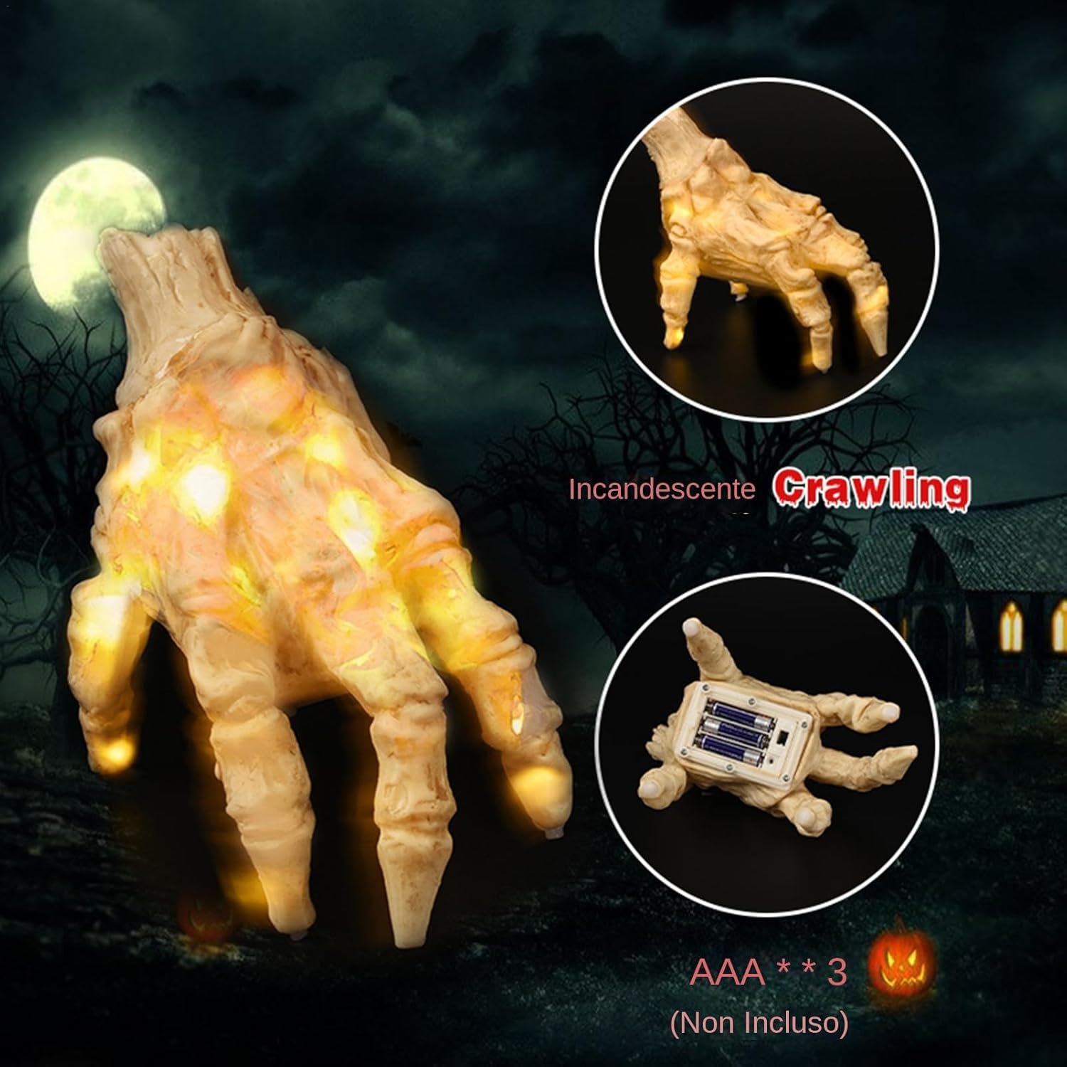 Realistic Design: Features detailed and lifelike skeleton hands that enhance any Halloween setting Sound and Light Effects: Equipped with sound and light features to create an eerie atmosphere Versatile Decor: Perfect for haunted houses, themed parties, and Gothic home decor Costume Accessory: Ideal for adding a spooky touch to Halloween costumes and props High-Quality Materials: Crafted from durable materials to ensure long-lasting use and