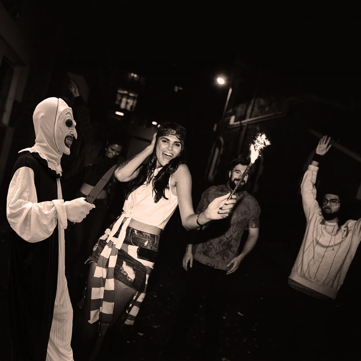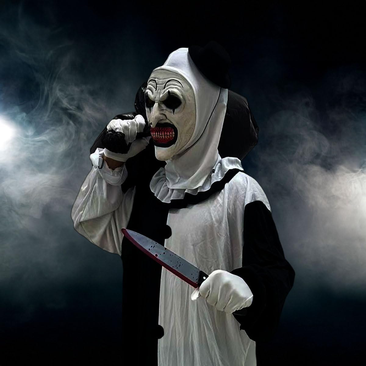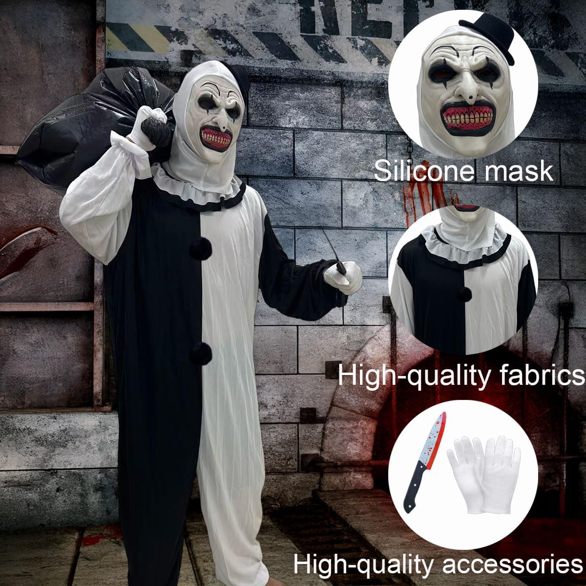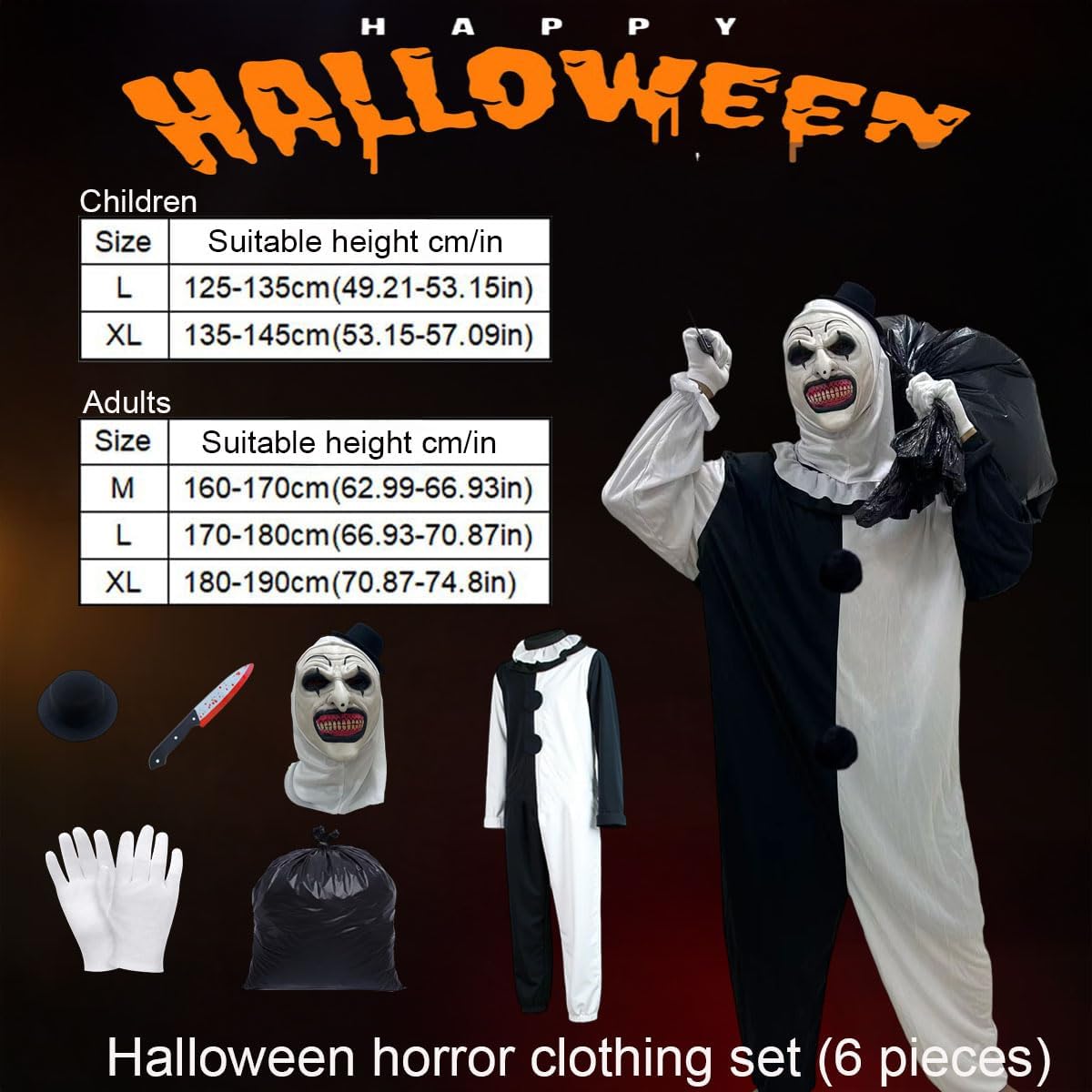 Descrizione prodotto Il costume da Clown Assassino con la Maschera del Terribile è uno dei preferiti dagli amanti dell'horror e non mancherà di attirare l'attenzione la notte di Halloween. Realizzato in tessuto spazzolato di alta qualità e seta di latte, questo costume è morbido, confortevole e resistente, mentre la maschera in lattice offre un'ottima visibilità. Ispirato ai personaggi dei film, il design realistico del costume presenta costumi horror in bianco e nero e una spaventosa maschera sanguinante, perfetta per interpretare il terrificante personaggio. Specifiche: Materiale: Seta di latte Taglie: Bambini L, XL, Adulti M, L, XL Il set include: 1* maschera in silicone, 1* cappello nero, 1* paio di guanti 1* costume clown terrifier, 1* coltello insanguinato di Halloween, 1* sacchetto di plastica nero Nota: ➤ Si prega di considerare una leggera differenza nelle dimensioni dovuta alle diverse misurazioni manuali. ➤ A causa della luce e delle impostazioni dello schermo, il colore dell'articolo potrebbe variare leggermente dalle immagini. Avviso di sicurezza NO