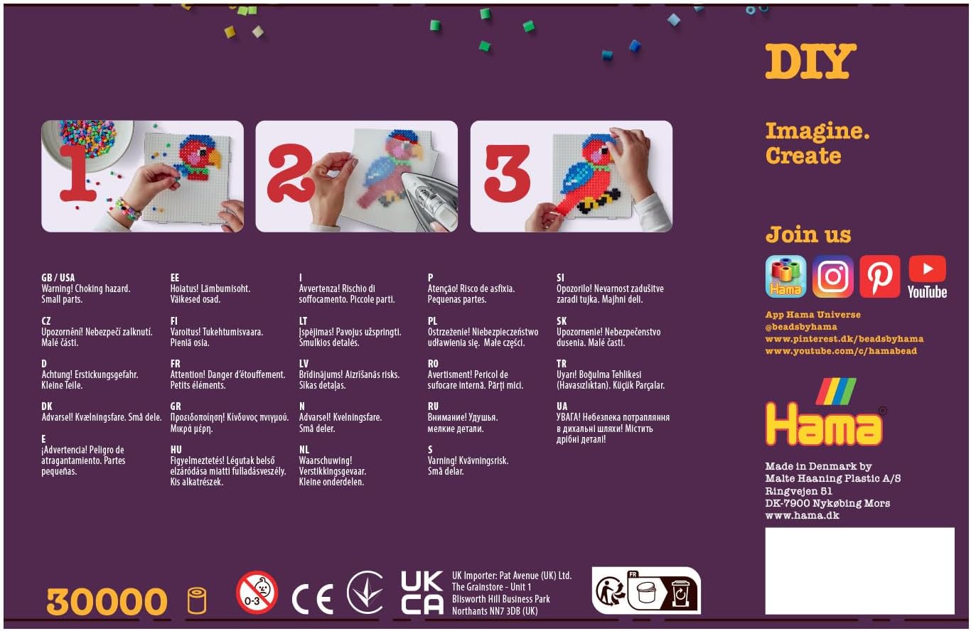 Perline da stirare nel secchio con circa Hama - 30.000 perline colorate da stirare in 22 colori Contiene perle di dimensioni medie con diametro di 5 mm, consigliate per bambini dai 5 anni in su, la stiratura dovrebbe essere utilizzata da un adulto Le perline sono versatili e sono adatte per la creazione di immagini pixel, piccole figure o per cucire e infilare Il fai da te con perline stimola la concentrazione, le abilità motorie e la creatività in modo giocoso Le perle e gli accessori originali Hama sono realizzati in plastica sicura (privi di plastificanti come BPA e ftalati)