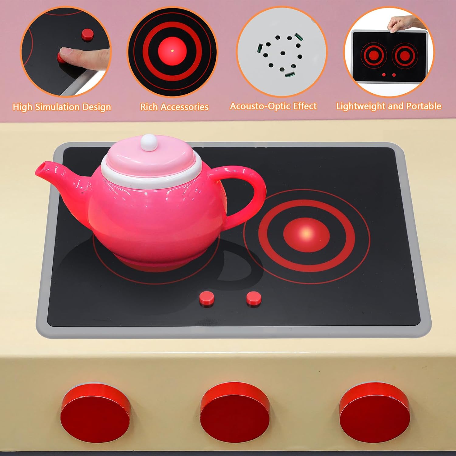 Varietà di opportunità di gioco: con ricchi accessori, favorisce l'interazione tra genitori e figli, creando indimenticabili momenti di gioco condiviso Giocattolo da cucina altamente realistico: il giocattolo per fornelli a induzione stimola la creatività dei bambini e stimola il loro interesse per la cucina con il suo design autentico. Leggero e portatile: questo giocattolo compatto è facile da trasportare ed è perfetto per giocare all'interno che all'esterno, a casa che al parco. Effetti sonori e luminosi interattivi: con suoni e realistici, questo giocattolo offre un'esperienza di cucina immersiva che rende il gioco di ruolo più emozionante Giocattolo didattico per bambini: le funzioni simulate del fornello a induzione aiutano i bambini a comprendere le pratiche di sicurezza di base in cucina e ad agire in modo responsabile