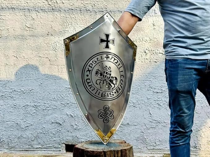 - Finitura: argento lucido - Dimensioni: 27 "x 18" pollici circa. - Materiale: Acciaio calibro 18 e ottone - Scudo fatto a mano di alta qualità ✔ Fatto a mano: lo scudo pronto per la battaglia è completamente funzionale e offre grande comfort. Perfetto per club e società di rievocazione. Tutti i prodotti Armor sono realizzati con i migliori materiali con particolare attenzione a fornire dettagli intricati in ogni pezzo.