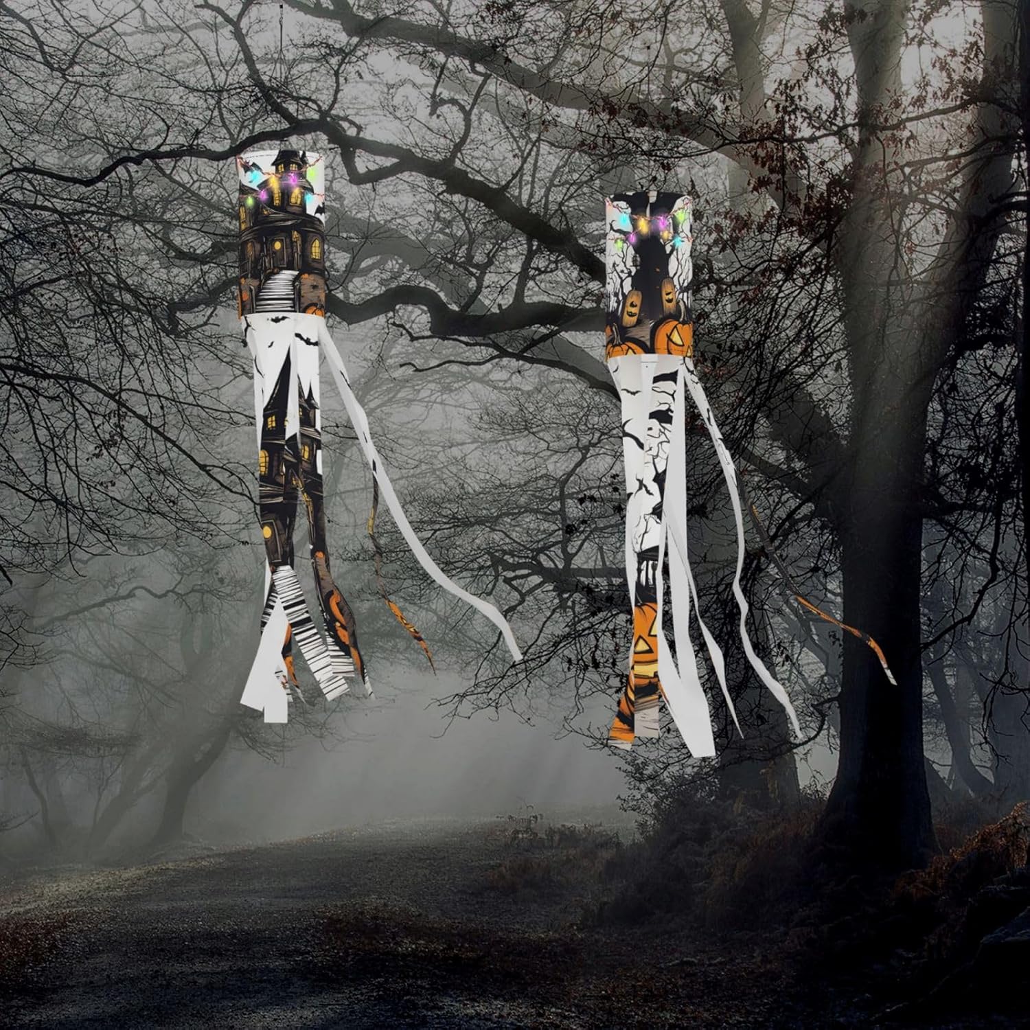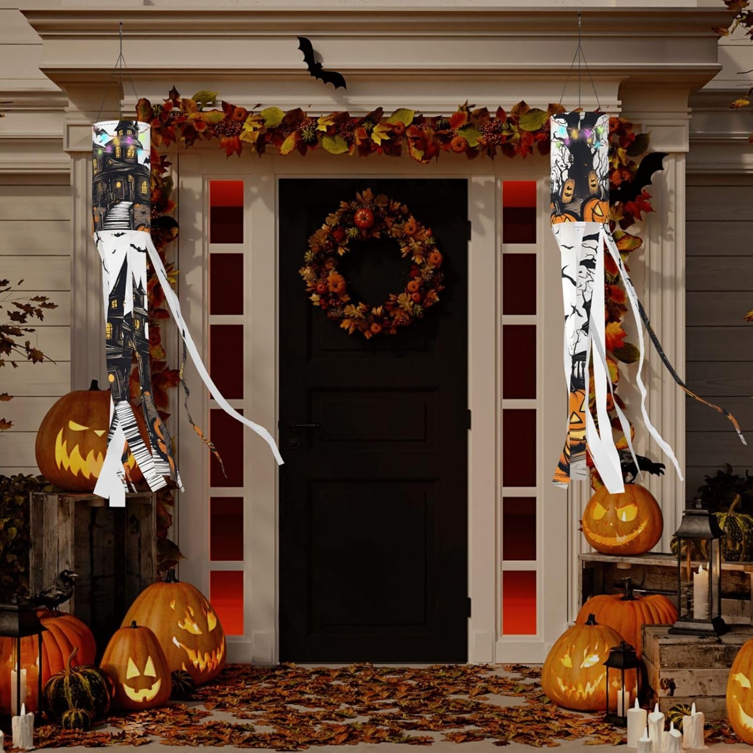 Happy-Halloween-Vector Deliziosa illuminazione esterna festiva: calze a vento da strega di Halloween per esposizione stagionale mozzafiato