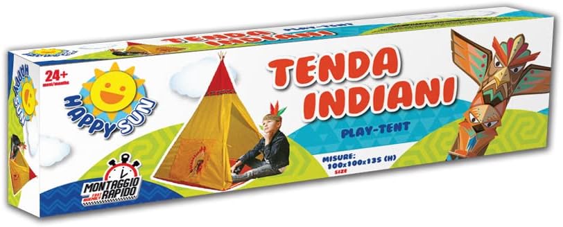 Tenda indiana e cowboy: con la tenda da gioco per bambini Happy Sun i vostri bambini potranno vivere fantastiche avventure comodamente nel salotto di casa o nella cameretta dei bambini. Montaggio rapido: la tenda indiana per bambini è dotata di un sistema di montaggio rapido che permette a mamme e papà di allestire un'area gioco in pochi secondi e in tutta sicurezza Leggera e facile da trasportare: grazie al tessuto stampato sottile ma resistente e al telaio con aste in plastica leggera, questa tenda per bambini può essere portata facilmente ovunque Feste e giochi con gli amici: le tende indiane per bambini Happy Sun dalle dimensioni generose sono perfette per organizzare feste e festeggiamenti in casa Dimensioni generose: la tenda da gioco per bambini misura 100 x 100 x 135 cm assemblato. Una volta smontato l'ingombro sarà solo di pochi centimetri