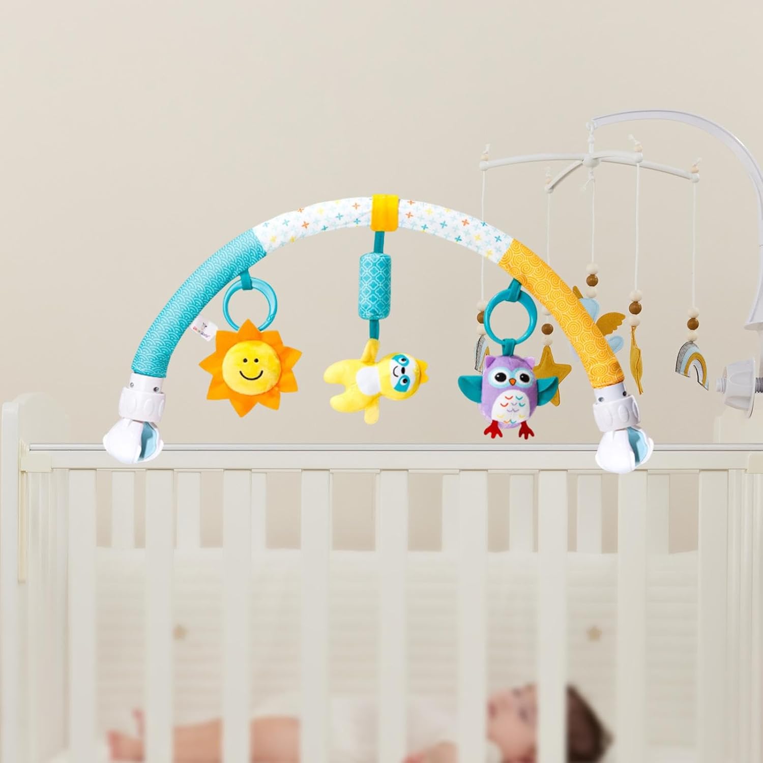 【Giocattoli multifunzionali per bambini】: il ciondolo del giocattolo sonaglio appeso per bambini può essere rimosso separatamente per consentire al bambino di giocarci, con un dispositivo sonoro incorporato, che emetterà un suono quando viene scosso o premuto delicatamente 【Materiale】: l'arco per attività da viaggio è realizzato in materiale morbido e l'imbottitura è morbida, consentendo al bambino di toccarlo in modo sicuro e confortevole 【Clip regolabili】: Mobile è dotato di due robuste clip regolabili per una facile installazione e regolazione 【Design unico e flessibile】: il design staccabile del giocattolo ad arco per passeggino consente un utilizzo flessibile e il giocattolo può essere installato su , passeggini, culle, sedie a dondolo per bambini, culle e maniglie del carrello della spesa 【Regalo per neonati】: il mobile ad arco con clip è un giocattolo adatto ai bambini da 0 a 3 anni. Sarà un'ottima idea regalo, adatta per feste, compleanni, Ringraziamento e Capodanno per bambini e bambine.