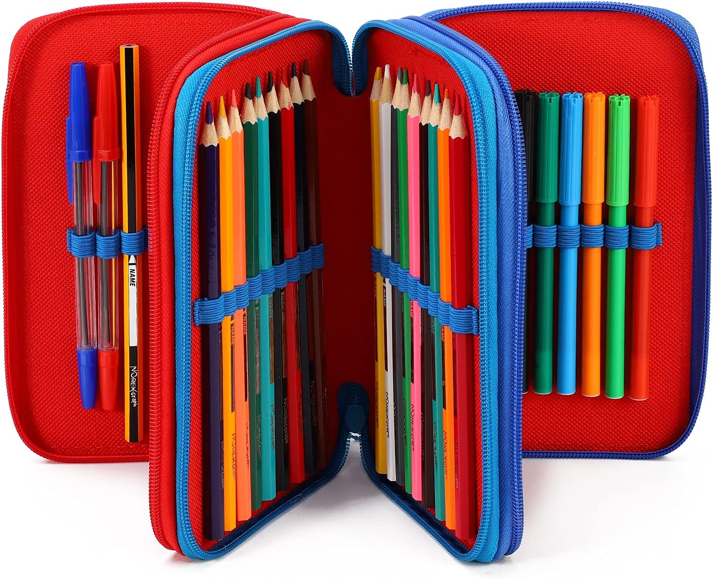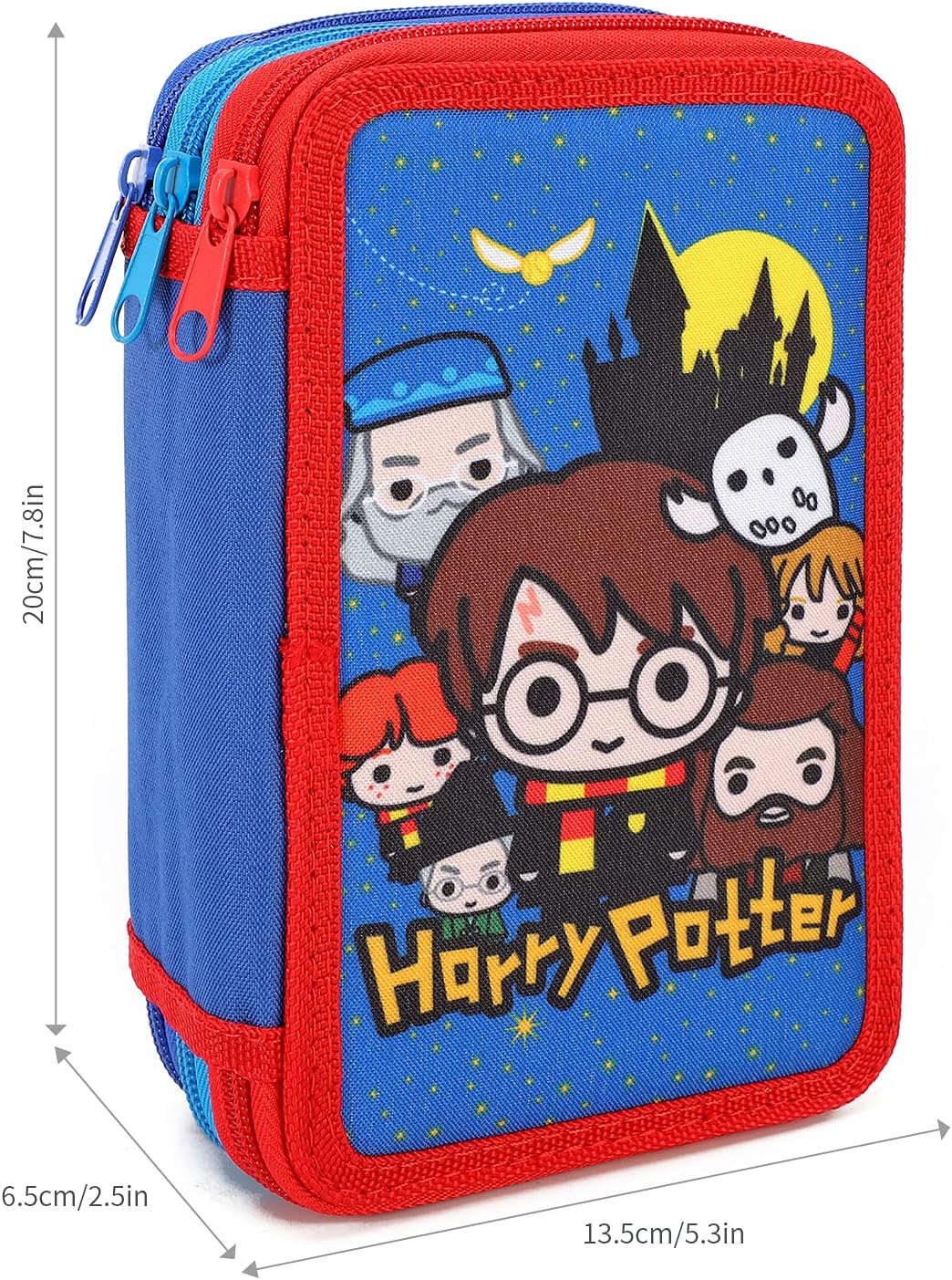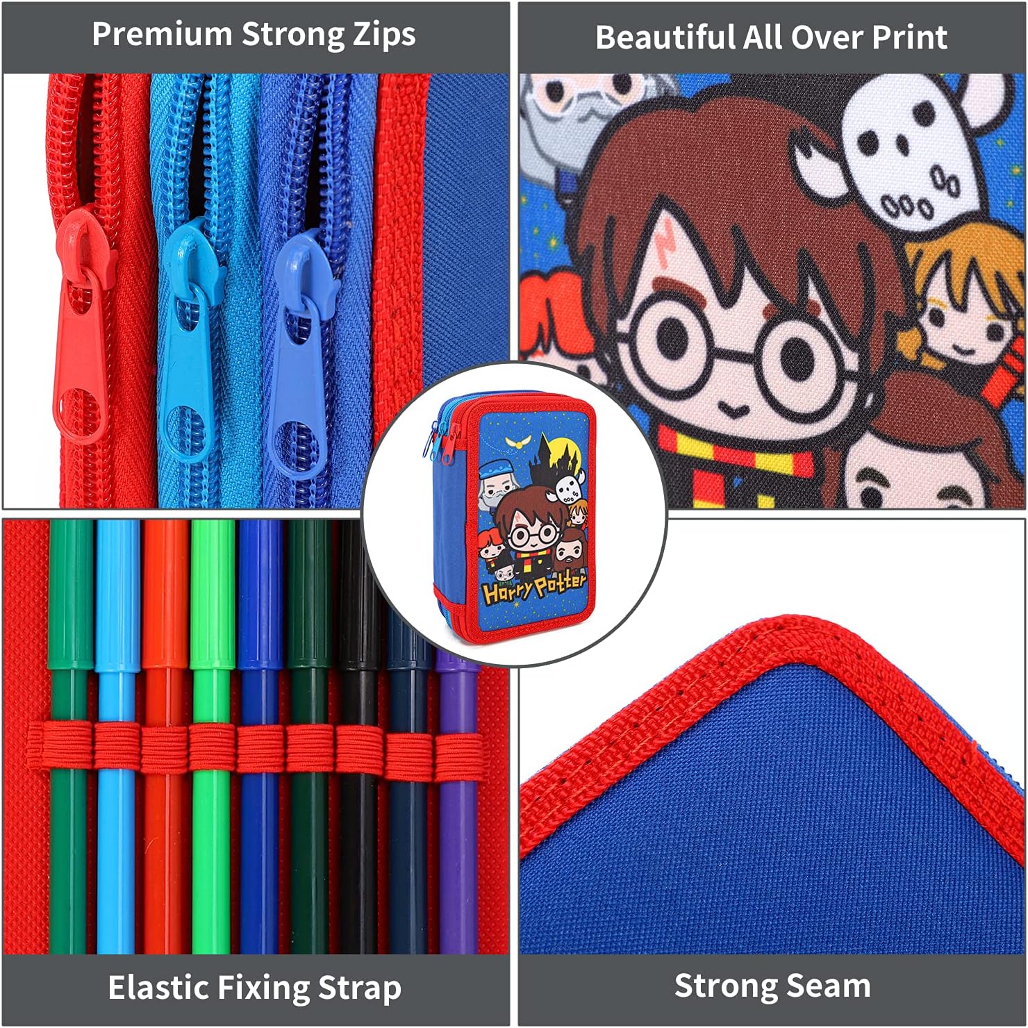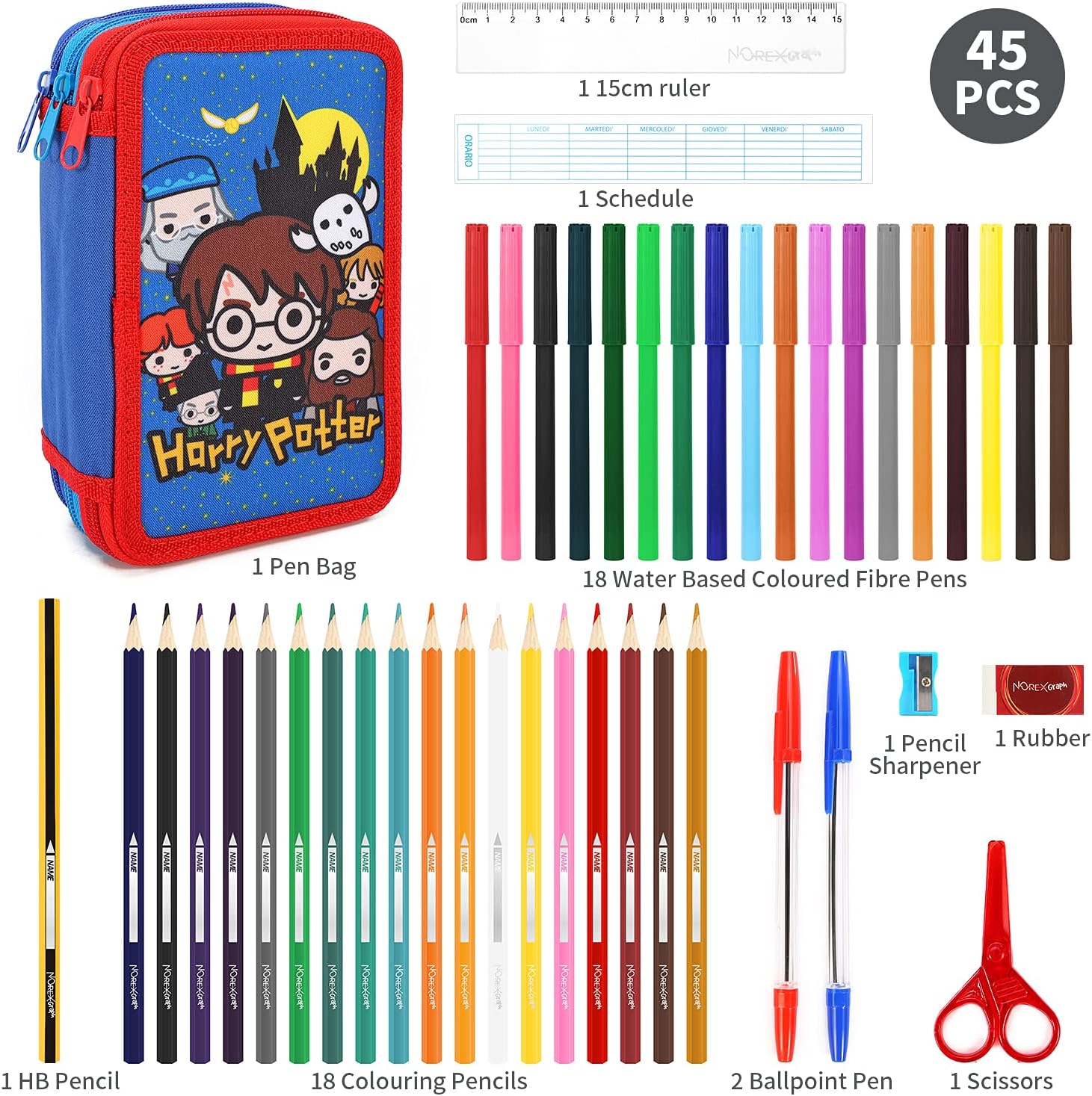 L'astuccio si compone di 3 scomparti, rifinito ognuno con una chiusura a zip. Harry Nel primo reparto troverete 1 matita, 1 penna Rossa, 1 penna Blu, 1 gomma, 1 temperamatite, 1 righello, 1 paio di forbici e 1 tabella con lo schema delle ore e dei giorni della settimana in cui poter appuntare l'orario scolastico. Nel secondo 18 matite colorate Norex. Nel terzo infine 18 pennarelli colorati marcati Giotto Turbo Color. Tela
