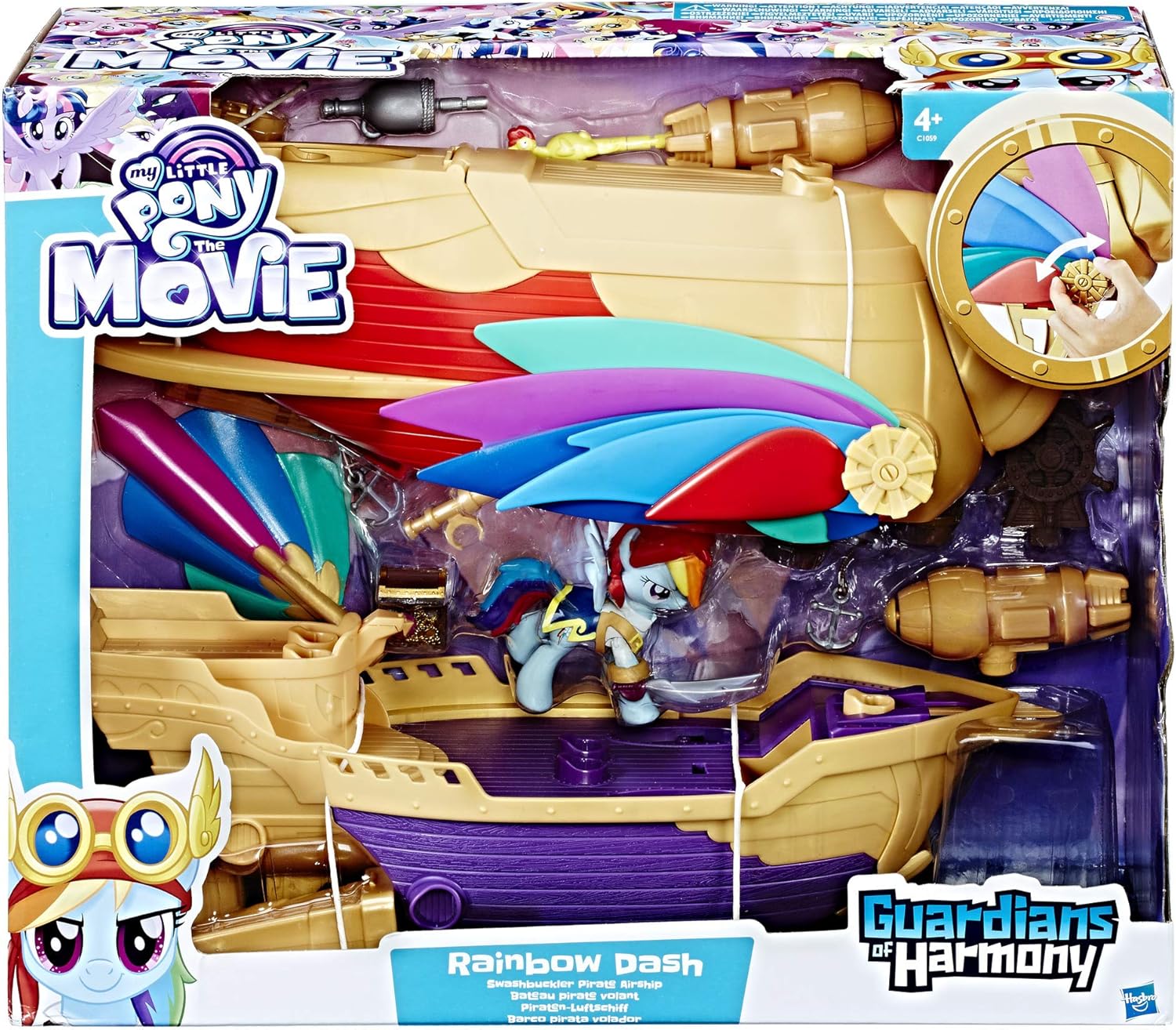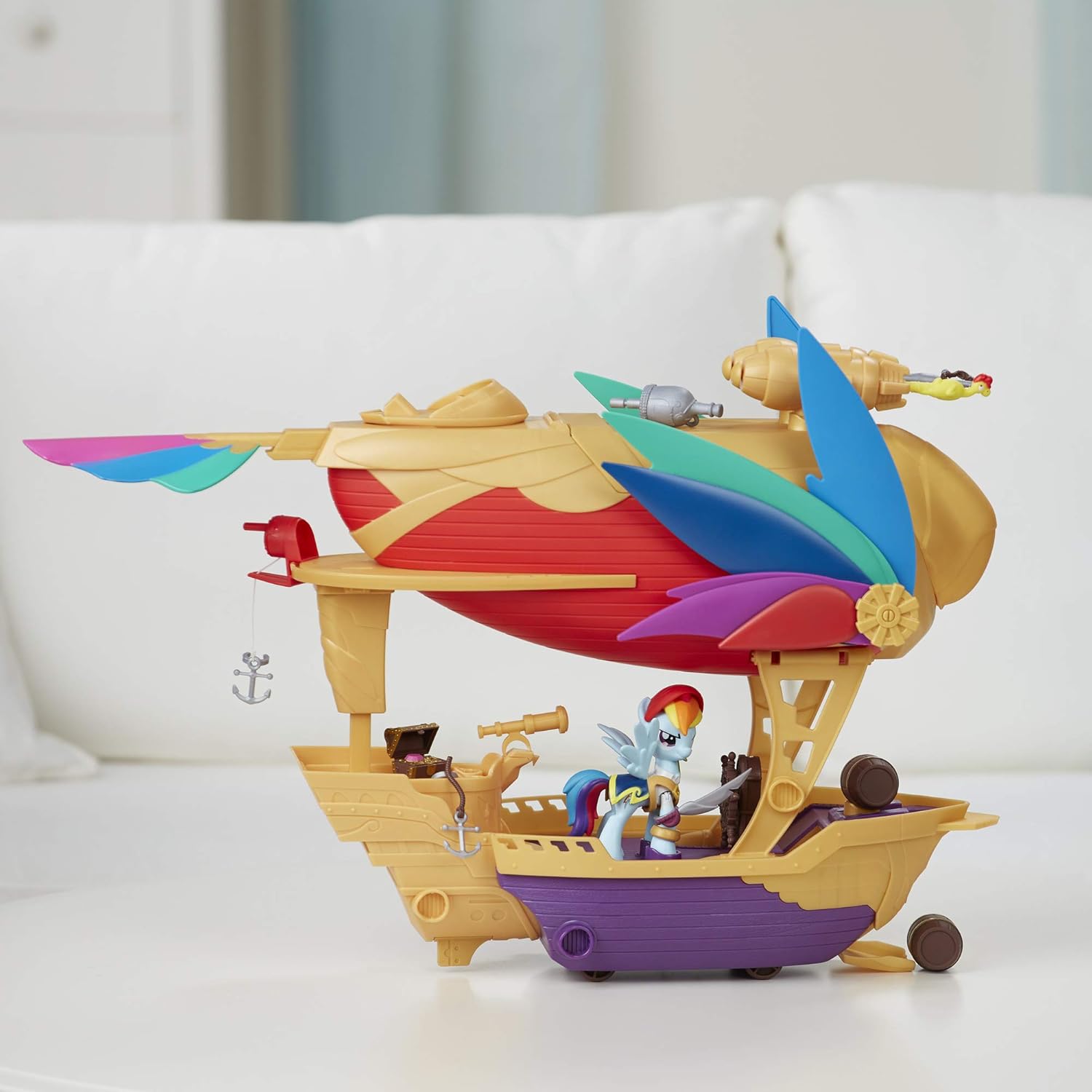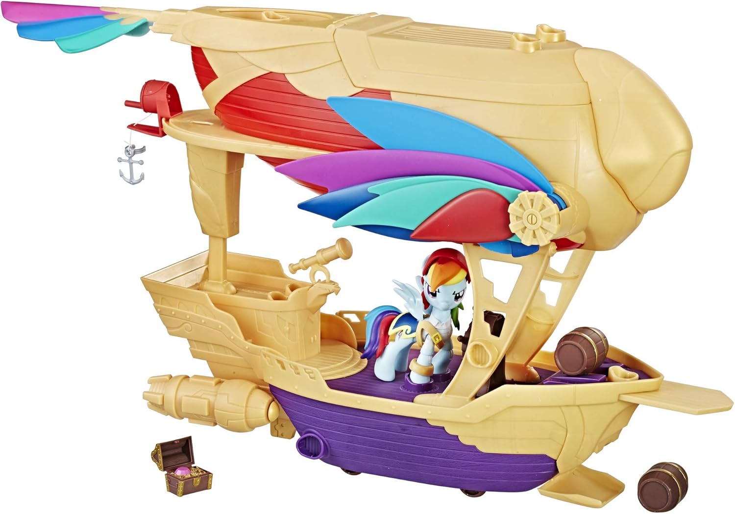 Avvia proiettili da cannoni che raddoppiano come motori Doppia vele, plancia e rifugio del tesoro 12 accessori a tema pirata, tra cui spada, ancora e scrigno del tesoro Viene fornito con Rainbow Dash pirata pony figura