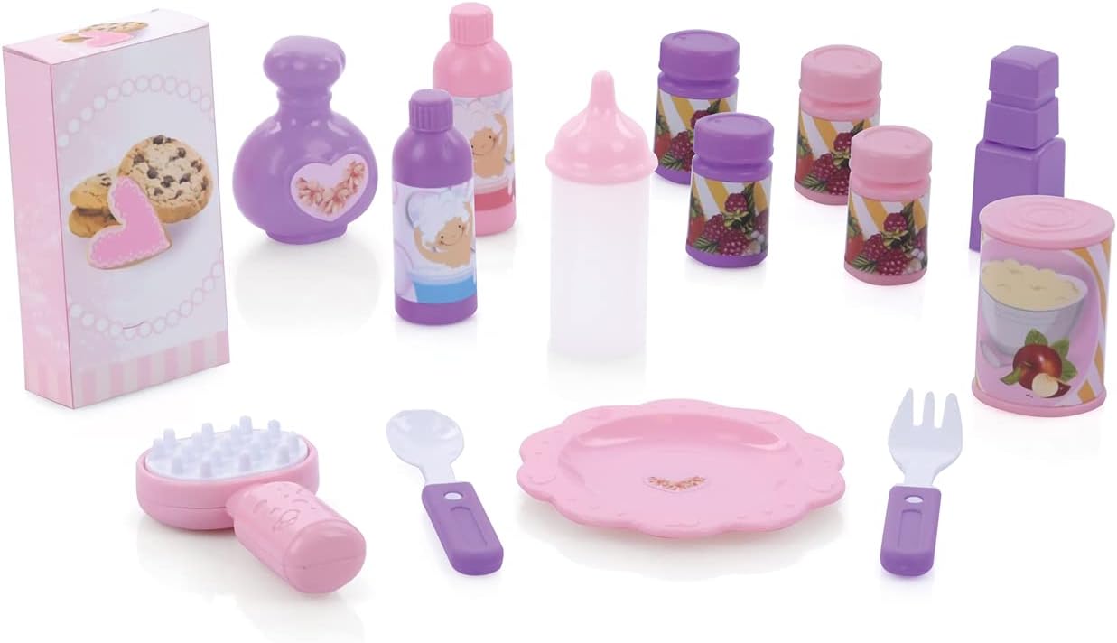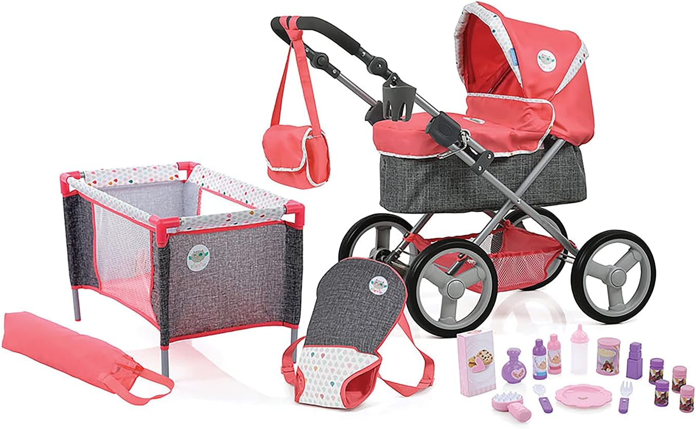 SET PER BAMBOLE DA 20 PEZZI: Il set Angie è composto da carrozzina, borsa fasciatoio, lettino, marsupio portabebè e 15 accessori piccoli DIVERTIRSI INDOOR E OUTDOOR: Il grande set permette molte possibilità di gioco in casa o all'esterno per tutti i genitori di bambole a partire da 3 anni UNIVERSALE: Il set è adatto per bambole e bambolotti piccoli e grandi, fino a 46 cm ed è fabbricato in tessuti e materiali facili da pulire CARROZZINA TRENDY: Il passeggino ha una navicella con cappotta parasole, borsa fasciatio, telaio robusto, portabottiglie, maniglione regolabile in altezza (49 - 67,5 cm) e chiusura piccola LETTINO ULTRALEGGERO: Il lettino da viaggio è pieghevole compatto e può essere trasportato nella borsa inclusa. Le grandi finestre in rete permettono un'ottimale vista sulla bambola