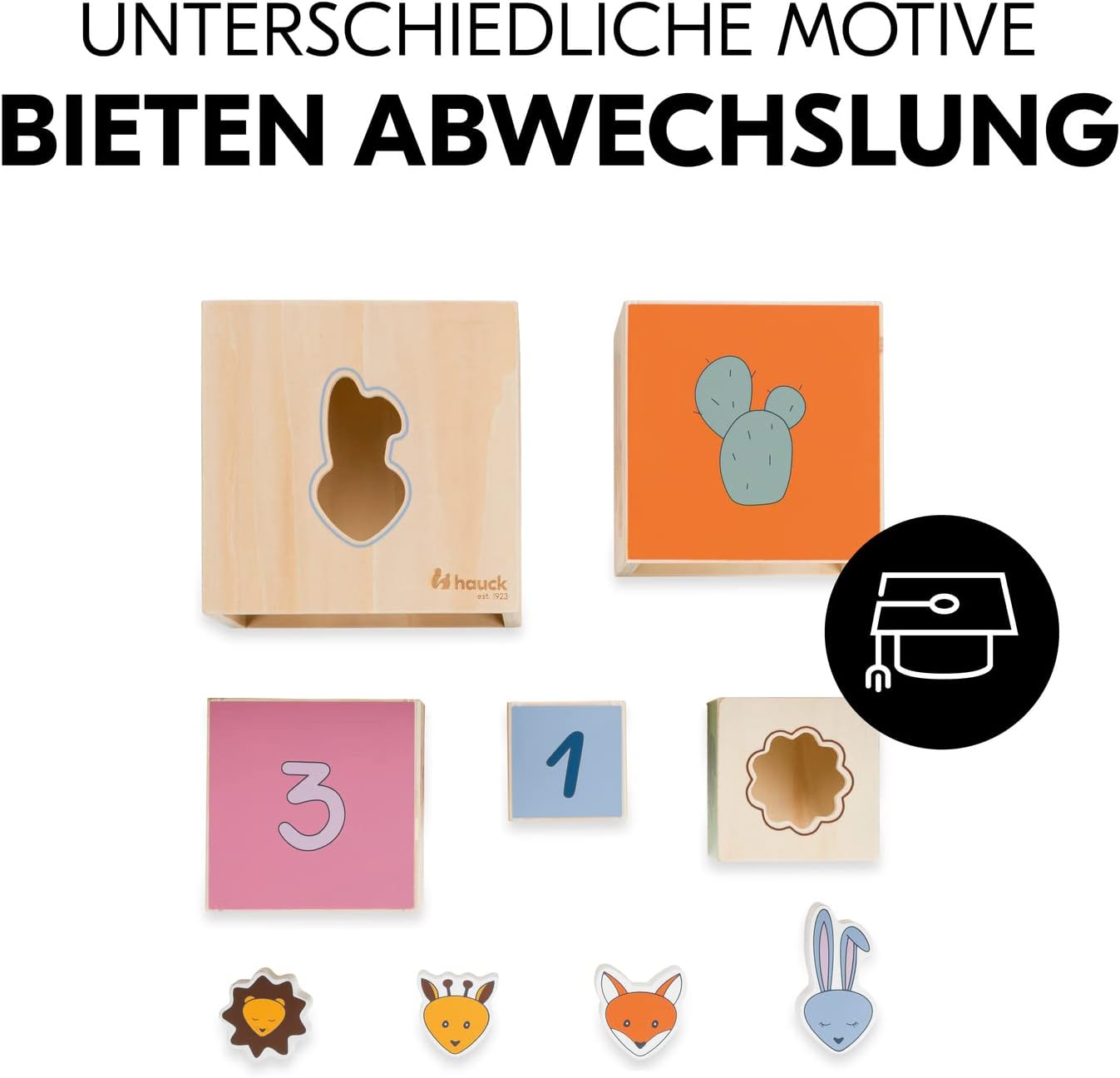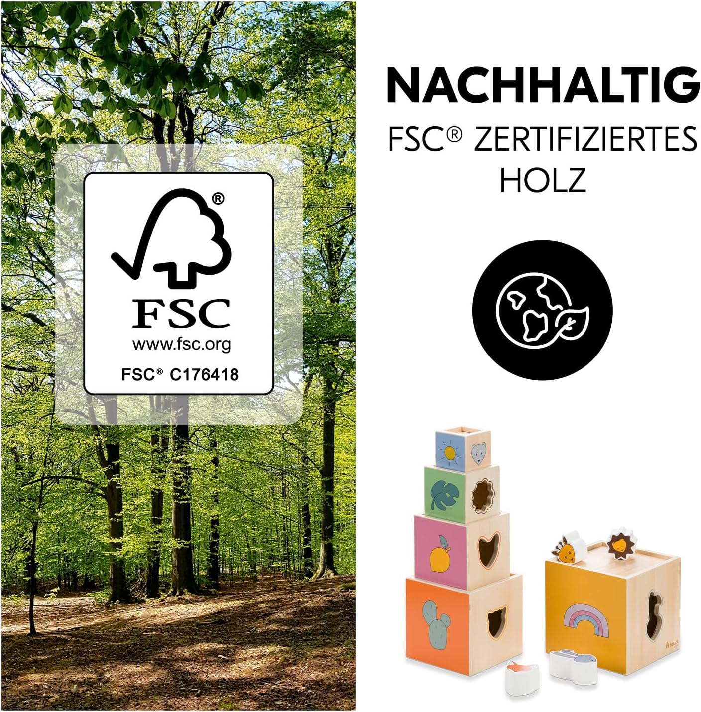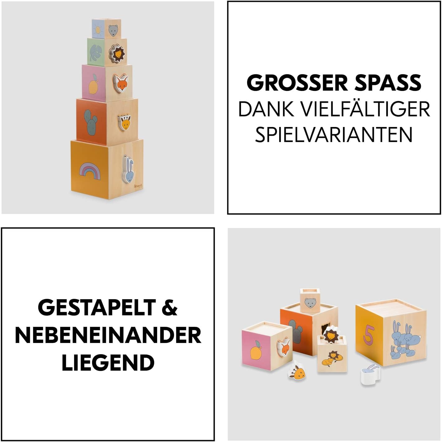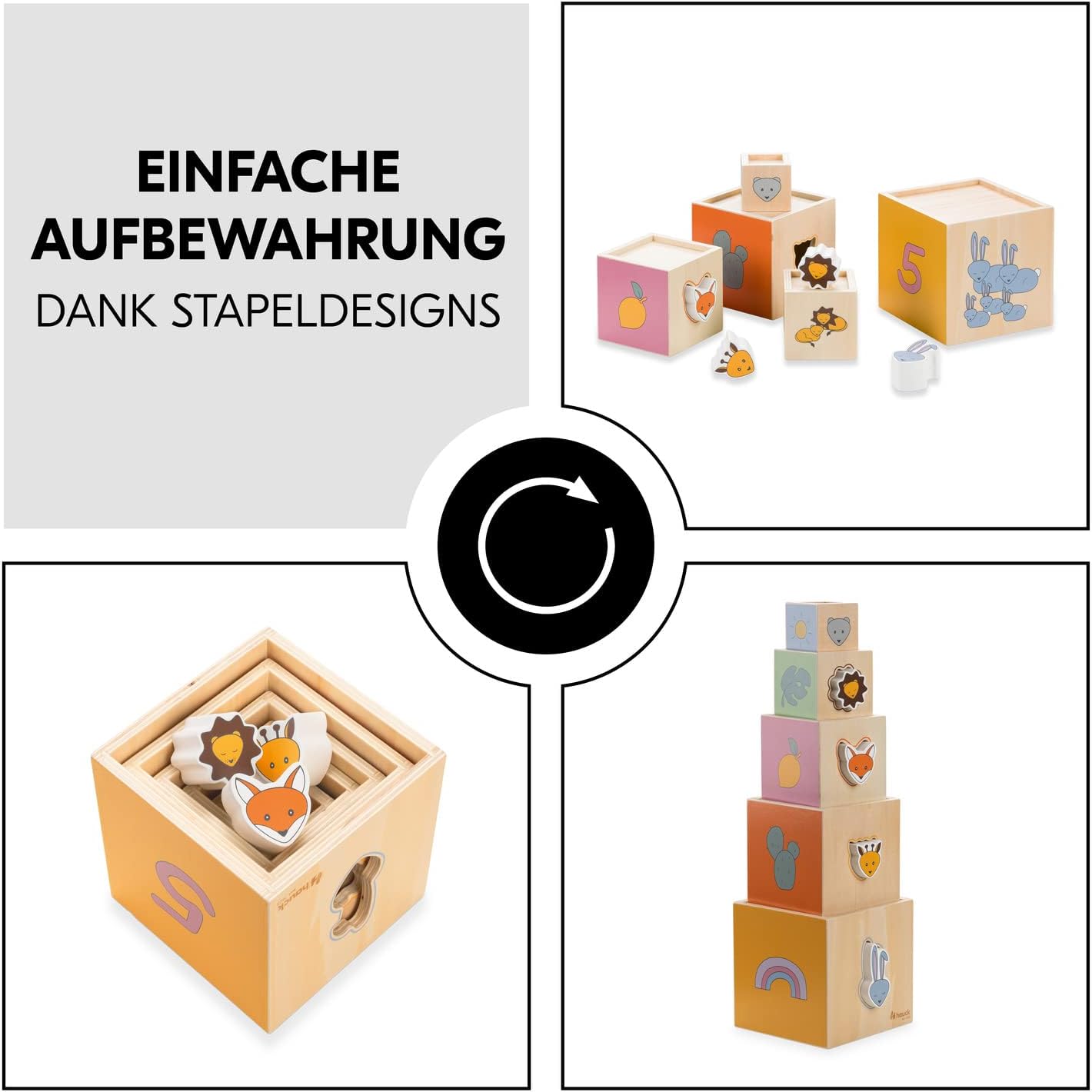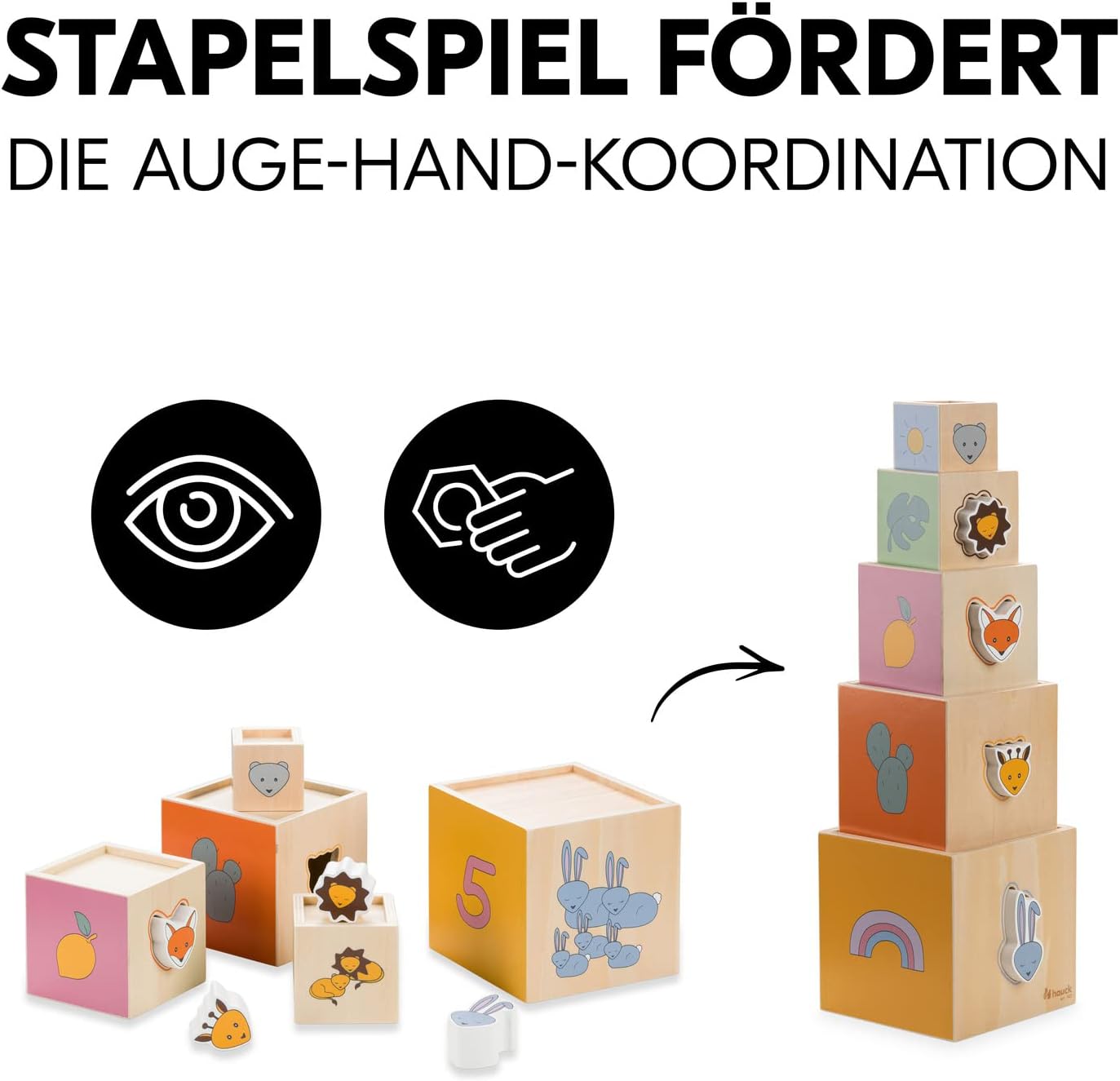👶 Divertimento a partire da 1 anno: la torre impilabile in legno promuove giocosamente la coordinazione occhio-mano, le capacità motorie e il riconoscimento di colori, forme e dimensioni 🌱 In legno FSC: giocattolo sostenibile da silvicoltura certificata - durevole, sicuro e prodotto nel rispetto dell'ambiente 🧩 Cubi impilabili e forme di animali: i cubi possono essere impilati uno sopra l'altro e gli animali possono essere ordinati in aperture adatte - ideale per promuovere abilità e concentrazione 🔢 Primo conteggio e riconoscimento: attraverso gli animali mostrati, il vostro bambino imparerà a distinguere le quantità, a riconoscere i primi numeri e a distinguere gli animali svegli da quelli che dormono 🧺 Praticamente riponibile: i cubi possono essere impilati uno dentro l'altro per risparmiare spazio, gli animali possono essere riposti al loro interno - perfetto per riordinare dopo aver giocato