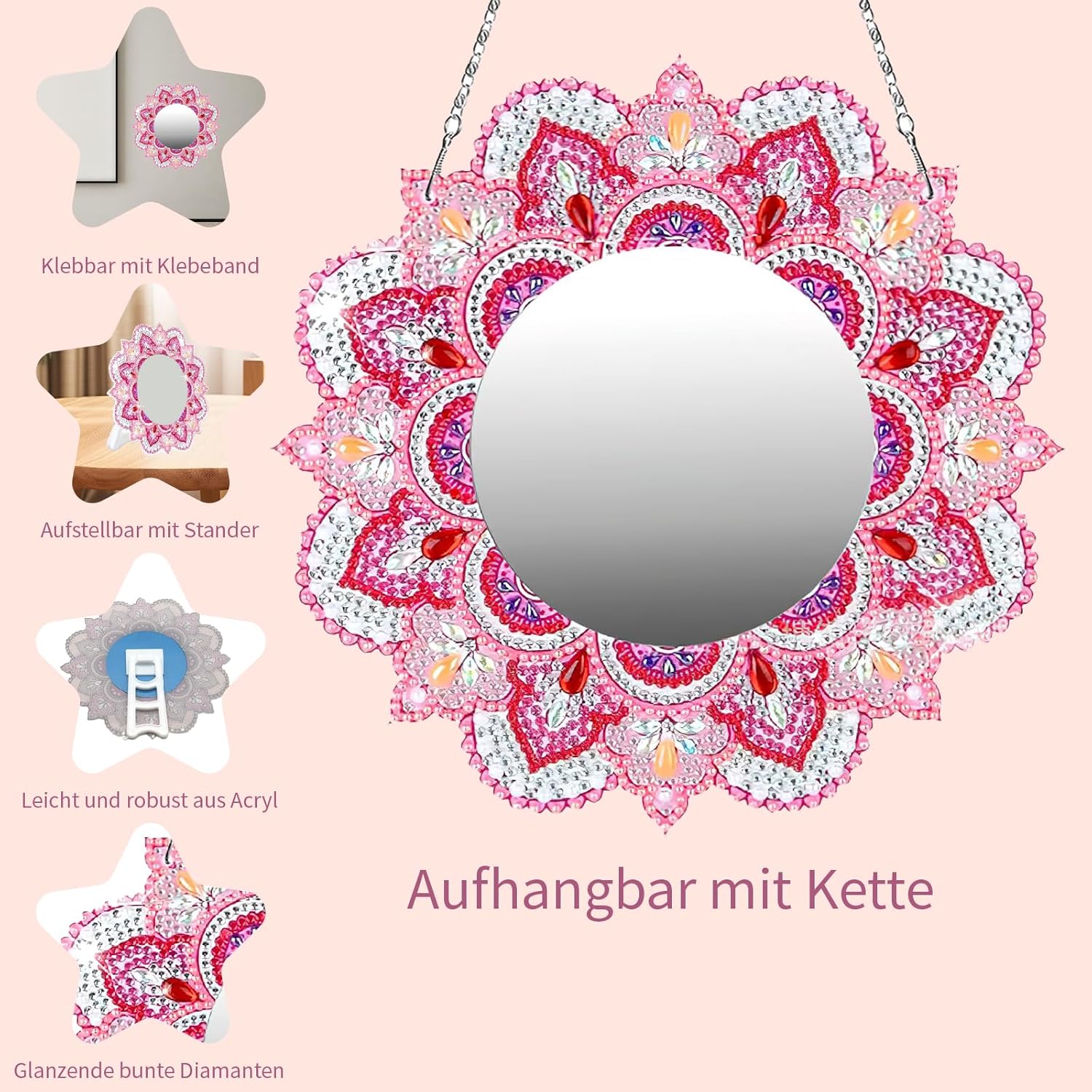 Specchio con Diamond Painting: Tutto incluso nel kitIl nostro kit ha tutto: 1 pannello in acrilico, 1 specchio, colla, penna per posizionare i diamanti, vassoio per diamanti, diamanti colorati, supporto in plastica + catena per appendino. Nessun acquisto aggiuntivo necessario: Inizia subito a fare e divertiti DIY semplice per principianti: Superficie con lettere/cifre chiare. Scegli diamanti corrispondenti con la penna, incolla sui segni, togli la pellicola protettiva del specchio, monta supporto per il tavolo o catena per il muro – pronto in pochi passaggi Materiali sicuri e adatti ai bambini: Tutti i componenti sono non tossici e adatti ai bambini: pannello in acrilico robusto/liscio, diamanti brillanti/pratici da tenere, colla forte e non irritante. Genitori tranquilli, bambini creativi Sviluppa creatività e capacità: Il kit stimola l'immaginazione, la coordinazione occhio-mano e la concentrazione dei bambini. Ideale per il tempo quotidiano di fai-da-te o progetti genitori-bambini – divertimento e sviluppo insieme Ideale come regalo di compleanno: Regalo popolare per ragazze, adatto per compleanni, feste e occasioni speciali. Il specchio con diamanti finito bell'elemento decorativo: con il supporto sullo scrittoio o con la catena sulla parete del soggiorno – opera di cui essere fieri e gioia quotidiana