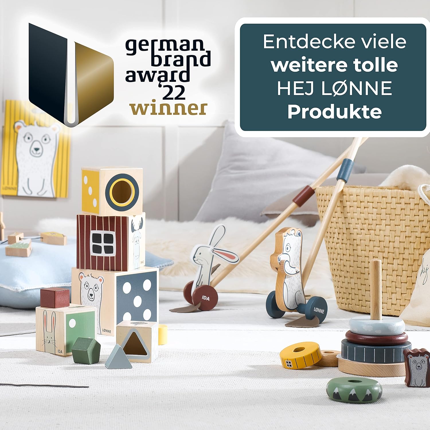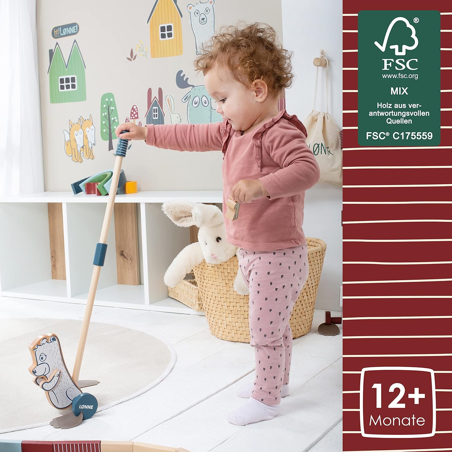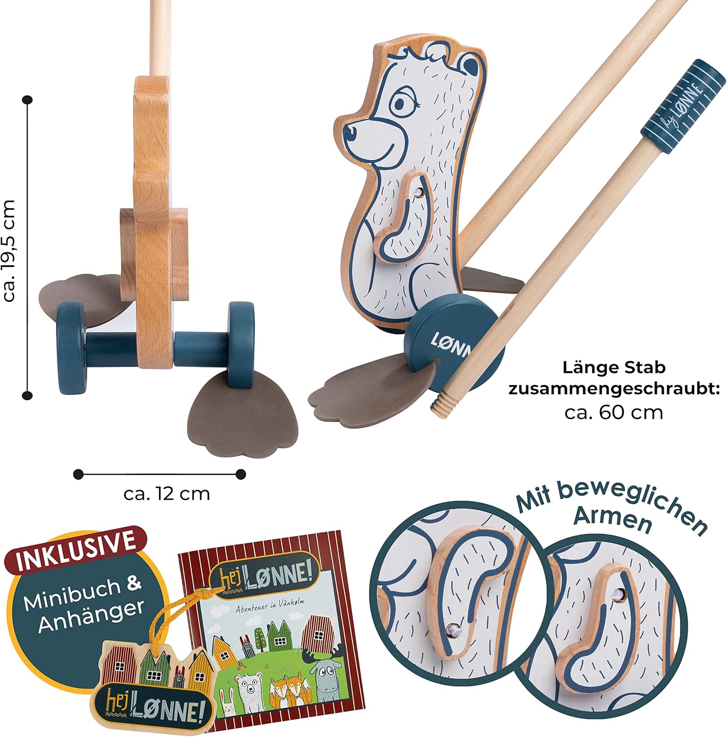 TUTTO DA AMARE - Giocattolo da tirare e spingere con narrazione, per bambini a partire da 1 anno, orso polare oscillante LØNNE e confezione visivamente allegri, include libretto e ciondolo portachiavi BEN CONGENIATO - Giocattolo per imparare a correre nel grazioso stile "Hej LØNNE!", 12 x 12 x 11 cm + bastone da 56 cm, piedi oscillanti estraibili per pulirli facilmente, bastone di trasporto svitabile, anche come originale decorazione da cameretta GIOCANDO SI IMPARA - Impara a correre giocando con questo animale da spingere, progettato con cura, della serie ""Hej LØNNE!"". Concetto integrato, design scandinavo, forte impatto didattico. Perfetto per promuovere le capacità motorie PER I NOSTRI PICCOLI - Giocattolo genderneutral in legno di faccio e ginepro di qualità privo di sostanze nocive, piedi in silicone, forme adatte ai bambini e colori a base d'acqua selezionati con cura, quindi assolutamente innocui INCANTEVOLE IDEA REGALO - Promuove logica e sviluppo, in una confezione stabile e incantevole, ottimo regalo di genitori e parenti, padrini, madrine e amici, perfetto anche per l'asilo nido