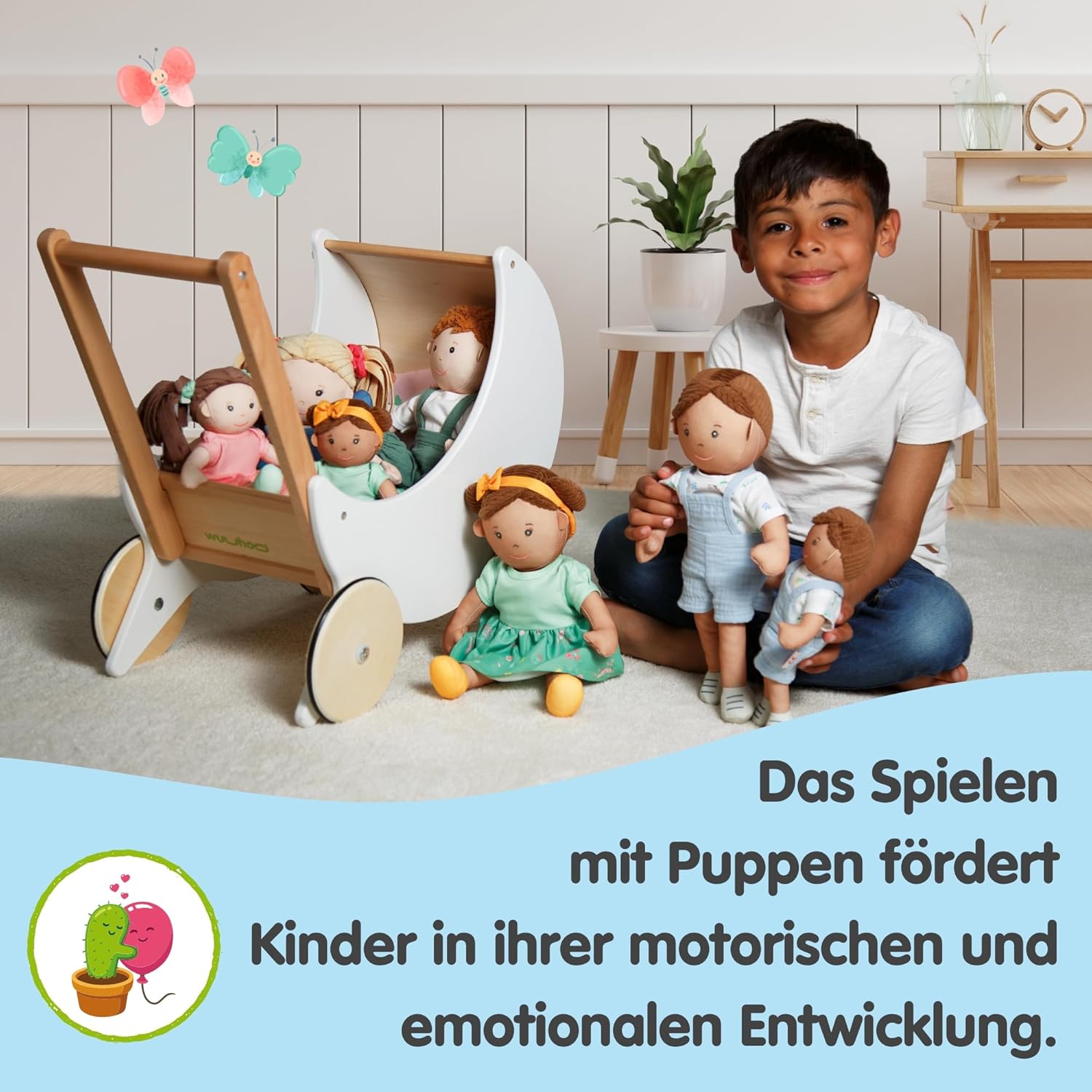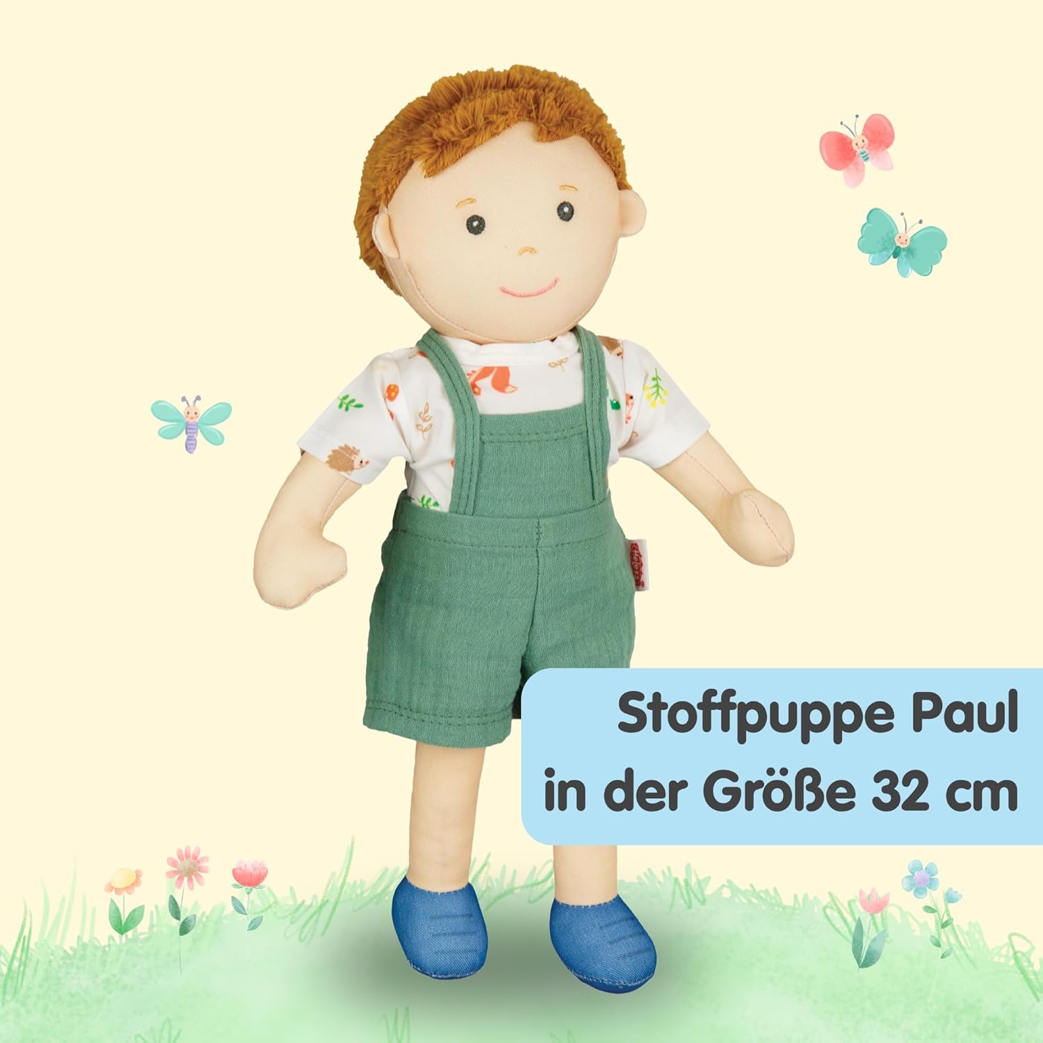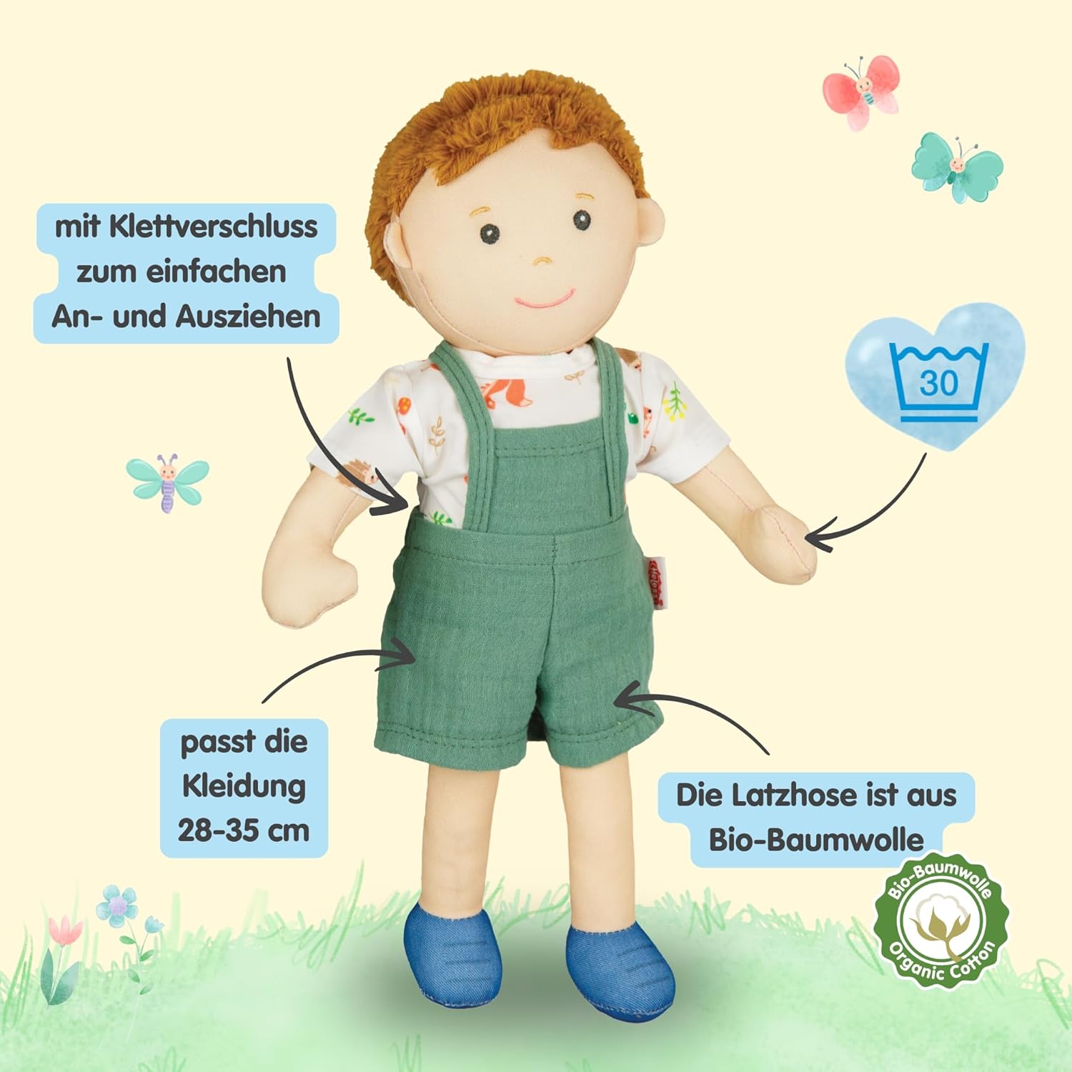 La bambola di stoffa Paul è vestita con una morbida maglietta fantasia e una salopette verde in cotone biologico che può essere indossata e tolta. Il vestito è molto facile da indossare e da togliere grazie alla chiusura in velcro, che rende molto divertente il gioco dei bambini. La bambola è di ca. È alto 32 cm e ha un corpo morbido e coccoloso. Tutti i capi di abbigliamento e gli accessori nella taglia 28 - 35 cm dell'ampio assortimento di abbigliamento di Heless sono adatti a te. Come azienda tradizionale, Heless presta grande attenzione all'alta qualità e, naturalmente, al rispetto di tutti i requisiti legali di sicurezza. I giocattoli Heless sono sviluppati con attenzione al design e ai dettagli, tutti i prodotti supportano il gioco di ruolo creativo e stimolano l'immaginazione del gioco, giocare con bambole e animali di peluche promuove l'empatia e le capacità motorie dei bambini