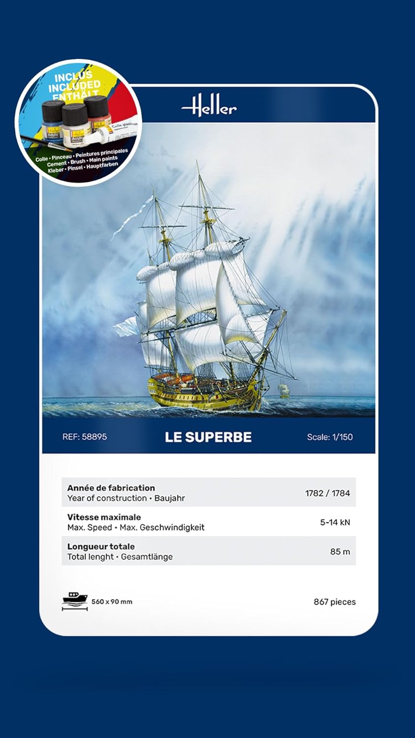 Heller - 1/150 Starter Kit Le Superbehel58895( 3279510588958) comes from Heller. Category – Modelbouw Kits, Number of pieces:, Difficolty Level: , Minimum age years, Tipo di prodotto: Boats & Ships, Subtype:, Scale: 1:150 , Assembly time (hours), , Color - , Dimensioni -
