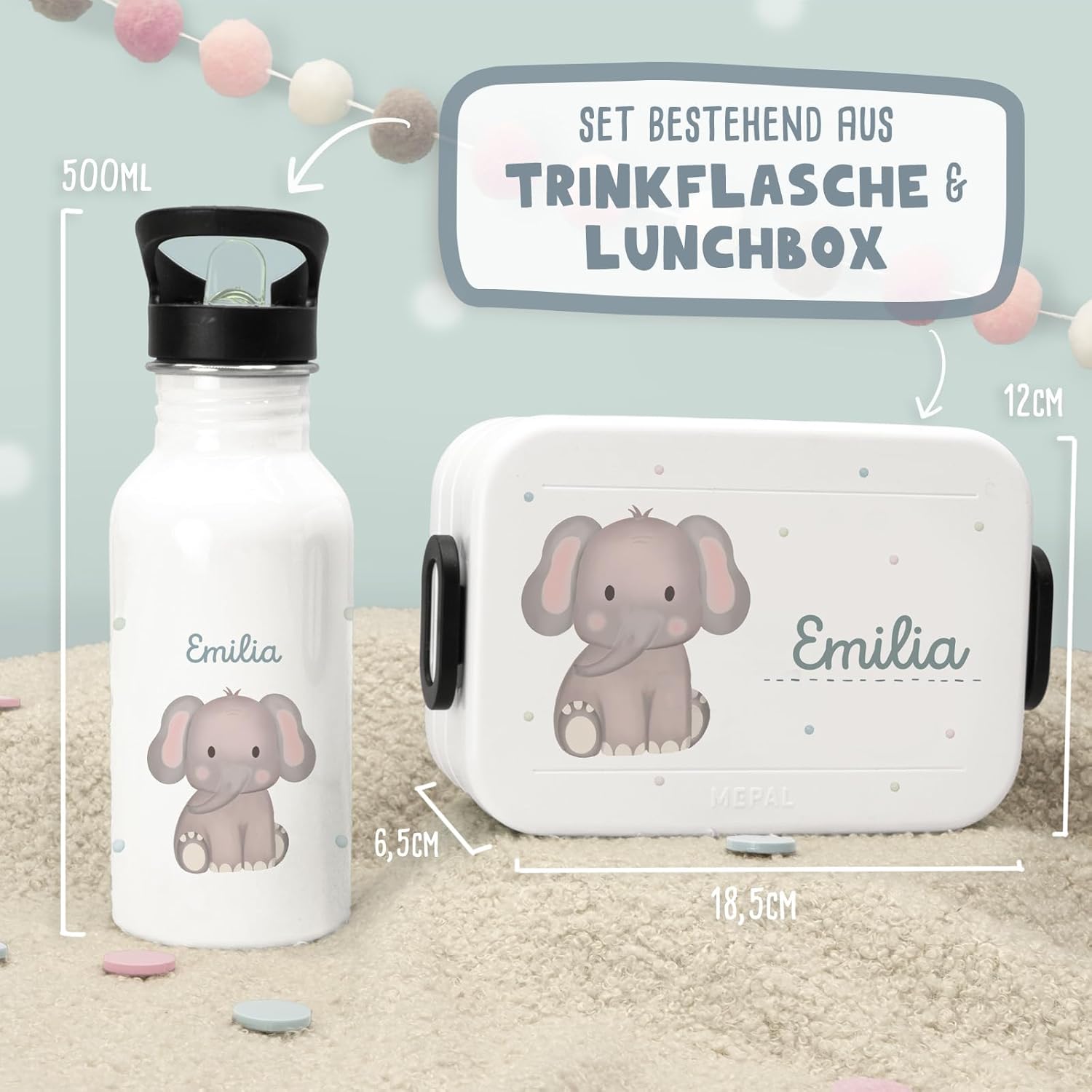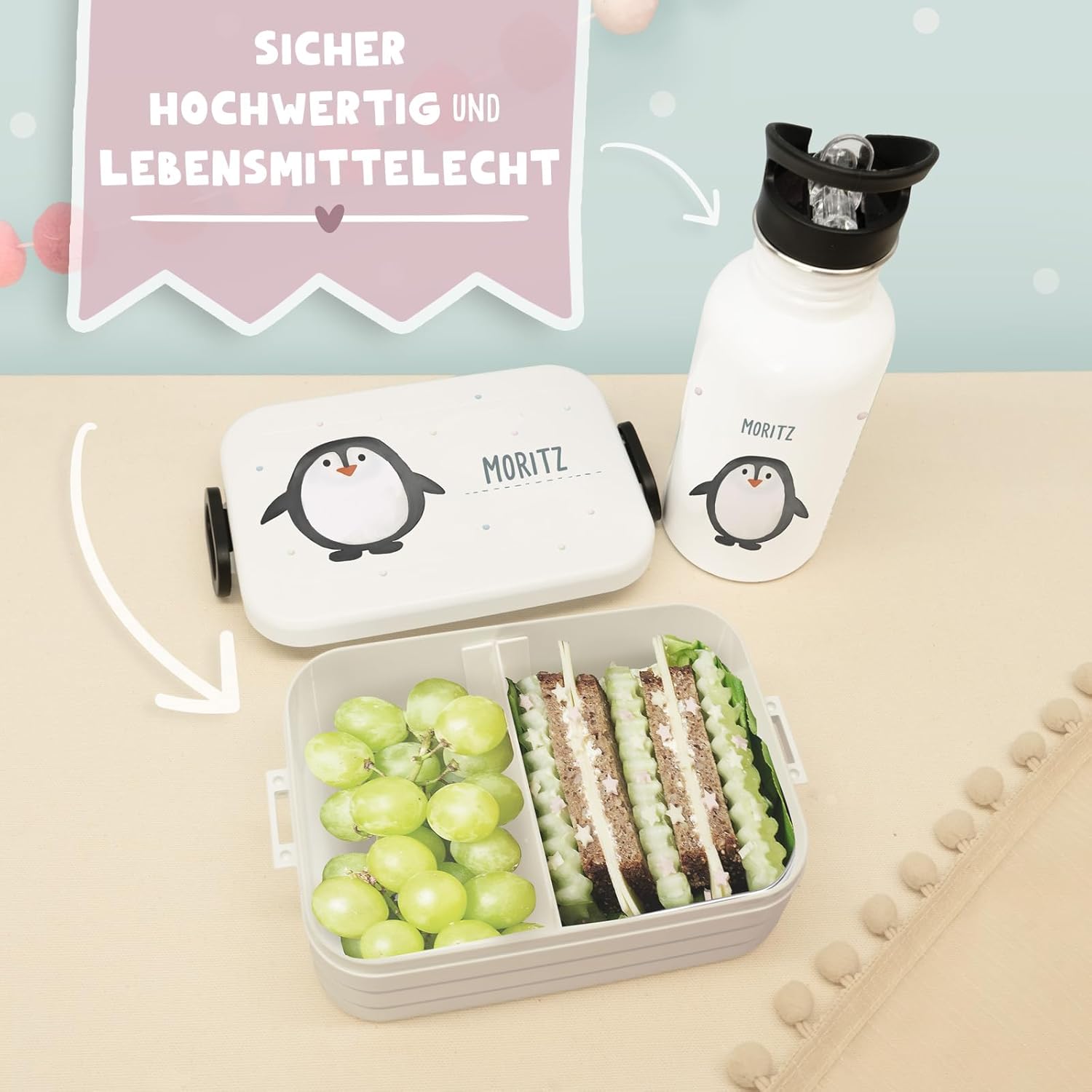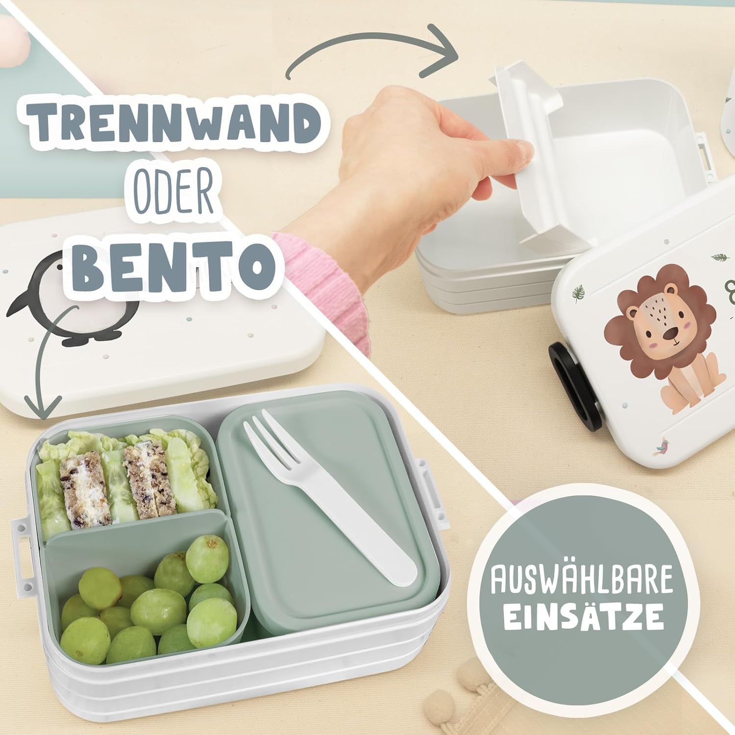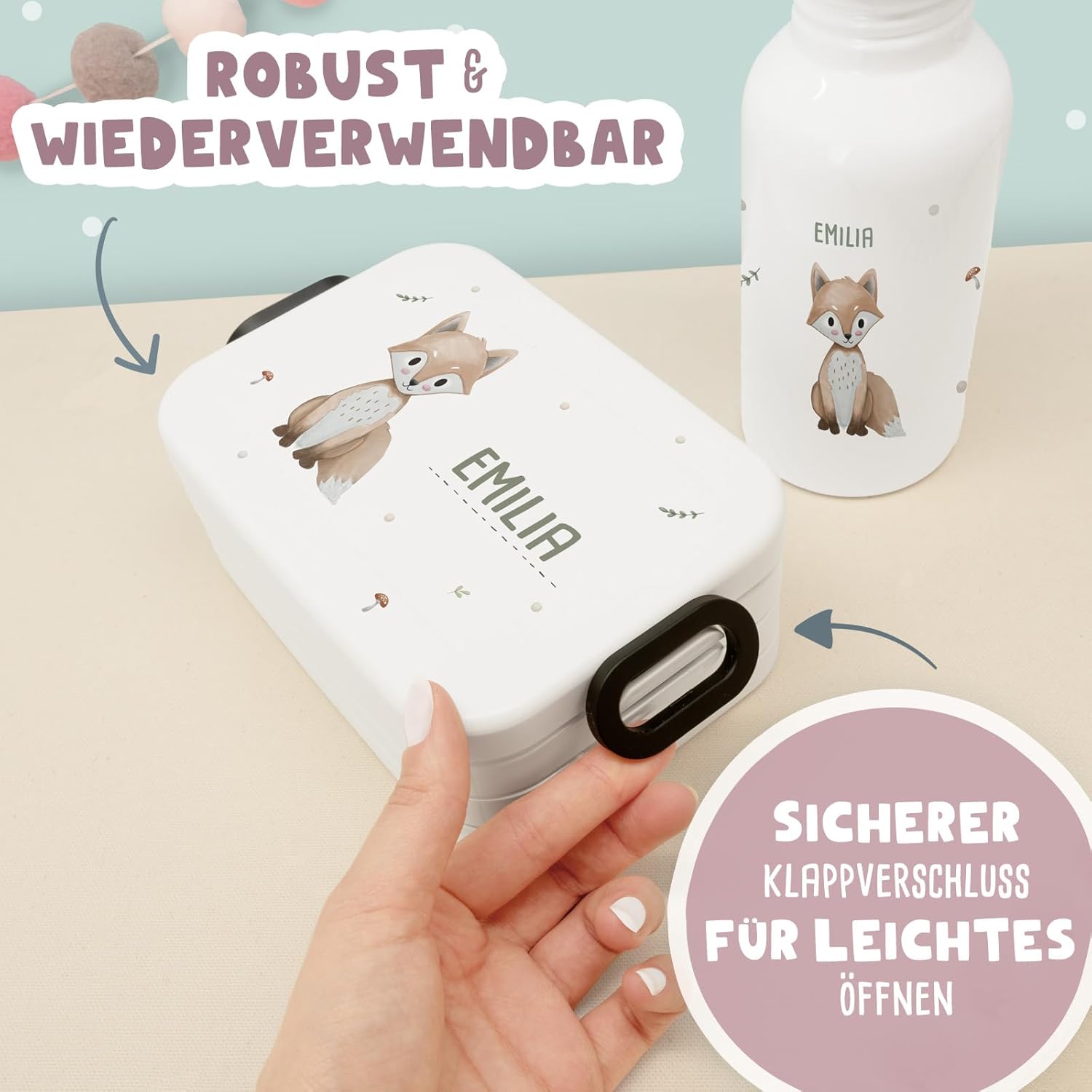 🎁 Individuale e unico: set di borraccia in acciaio inox (500 ml) e contenitore per il pranzo Mepal - personalizzato con il nome desiderato e il motivo preferito. 🐻 Tanti graziosi disegni di animali tra cui scegliere: dalla volpe al coniglio al leone – motivi adatti ai bambini per ragazzi e ragazze. 🏫 Ideale per l'asilo nido e la scuola: contenitore per il pranzo con pratica chiusura a clip e divisorio - borraccia con coperchio in cannuccia a tenuta stagna. 💧 Materiali di alta qualità: acciaio inossidabile senza BPA e plastica resistente: robusti, sicuri e sostenibili. 🎉 Idea regalo perfetta: per l'inizio della scuola, per i compleanni, per Natale o semplicemente perché - progettata con amore.