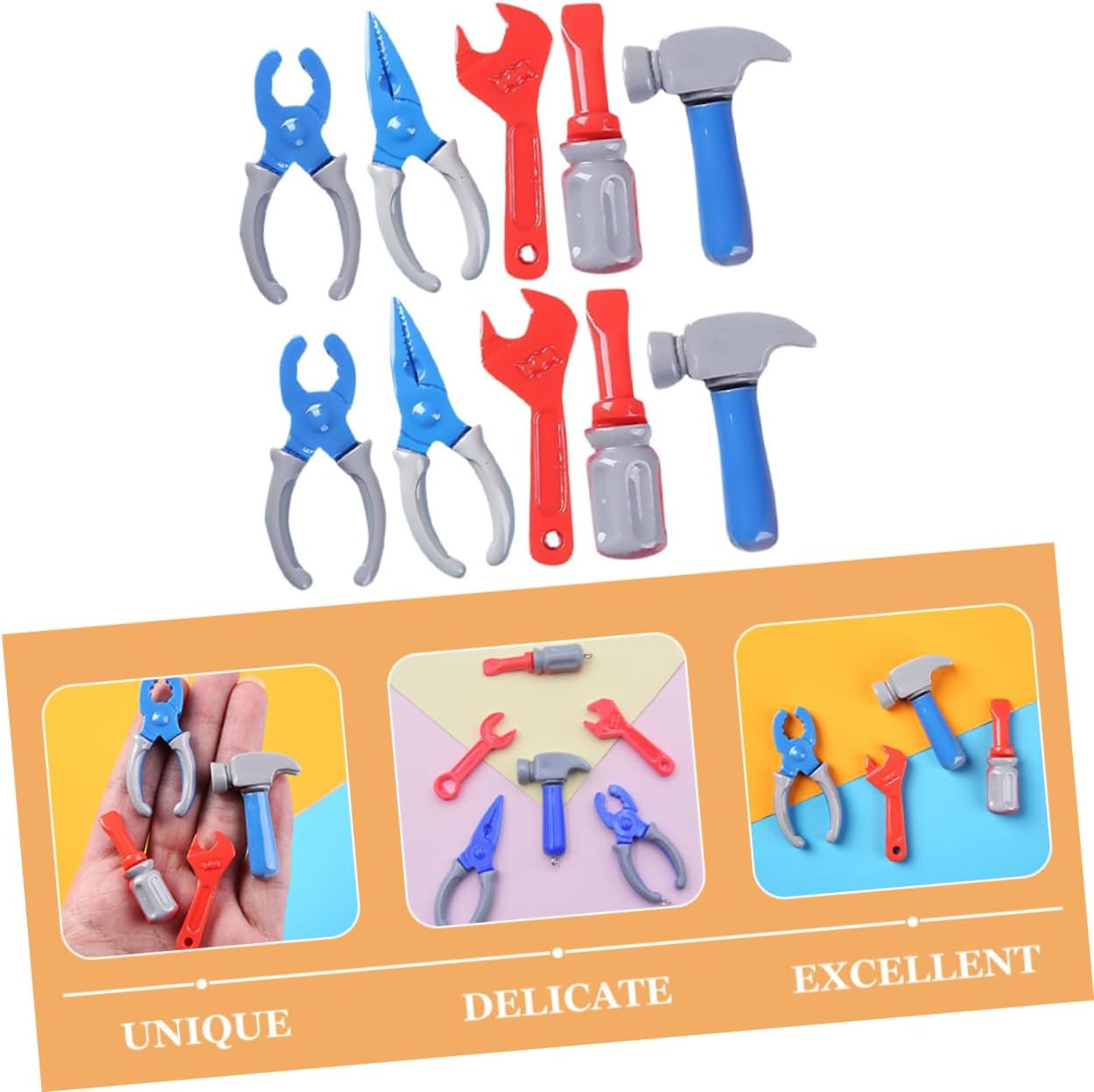 Accessori in miniatura: realizzati con materiali sicuri, effetto altamente simulato, questi strumenti in miniatura con giocattoli per cassette degli attrezzi sono adatti per essere posizionati nella casa delle bambole dei tuoi bambini, giocattolo per bambini Strumenti per bambini: usati con altri mini ornamenti per la casa per ottenere un migliore effetto decorativo, rendendo i bambini più divertenti, fingendo giocattoli Mini accessori per case delle bambole: dimensioni compatte, facili da usare e anche da riporre, possono coltivare meglio le capacità pratiche dei tuoi bambini attraverso il gioco di finzione, strumenti in miniatura Giocattoli con strumenti di simulazione: puoi inviare queste miniature per case delle bambole come regalo speciale ai tuoi bambini per il compleanno, la festa dei bambini, il capodanno, ecc., accessori per miniature per case delle bambole Giocattoli di gioco di simulazione: realizzati con materiali eccellenti e leggeri, questi ornamenti di strumenti in miniatura sono sicuri, supportano l'uso prolungato, strumenti giocattolo