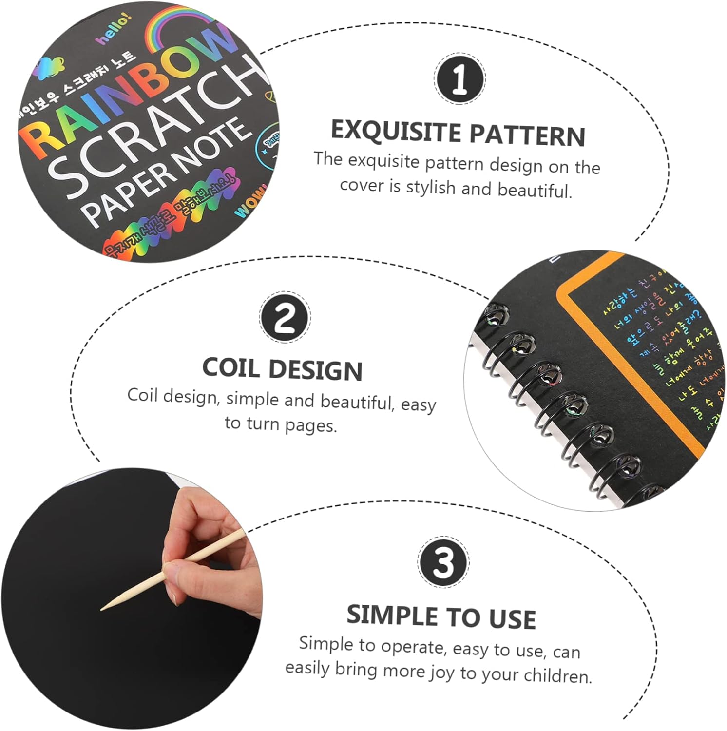Gratta e vinci: aiuta efficacemente i bambini a trascorrere il tempo libero e ad imparare divertendosi. Quaderno da disegno per bambini: ottimo per i graffiti fai-da-te dei bambini, il disegno a mano, lo sviluppo dell'intelligenza, nonché il tempo libero e l'intrattenimento degli adulti. Carta da pittura per bambini: semplice da usare, facile da usare, può facilmente portare più gioia ai tuoi bambini. Quaderni da grattare dal design arcobaleno: può essere utilizzato come giocattolo per gli impiegati adulti per decomprimere l'intrattenimento e anche un buon giocattolo genitore-figlio. Disegno da grattare per bambini: leggero e portatile, più comodo da riporre e trasportare.