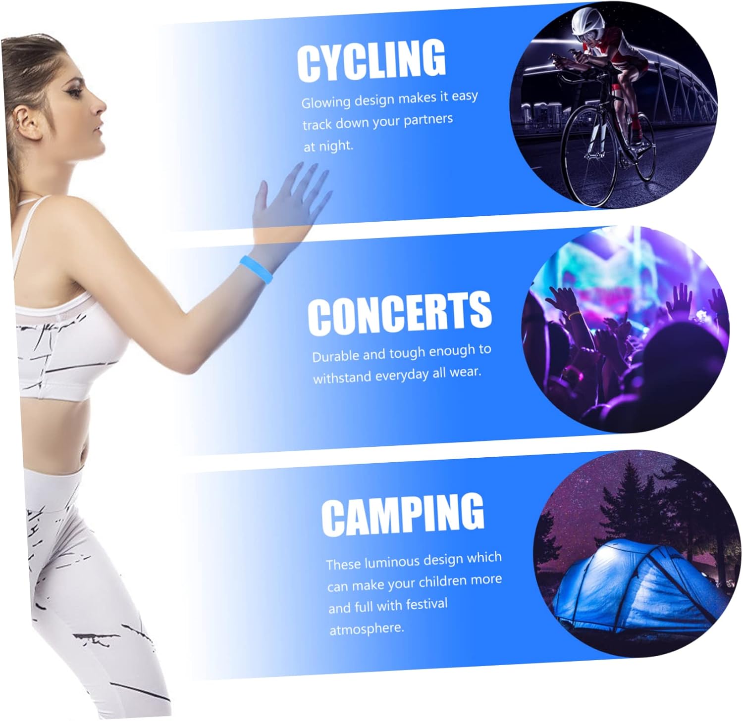 Braccialetto LED ricaricabile: adatto per la corsa, le passeggiate con il cane, il ciclismo, l'arrampicata, l'escursionismo, il jogging e altro ancora, braccialetto luminoso che si tiene per mano Braccialetto luminoso a led: un braccialetto sportivo a LED bello e pratico per i tuoi amici e familiari. Braccialetti lampeggianti: ampiamente utilizzati negli sport all'aria aperta, nella corsa mattutina e serale, nel cross-country, nel ciclismo, nel campeggio e adatti anche per bar, concerti e altri luoghi di intrattenimento, giocattoli luminosi alla moda Braccialetti per eventi: ricarica tramite cavo dati usb. questo prodotto include un cavo dati USB e braccialetti luminescenti al buio. Comoda illuminazione da polso: realizzata in materiale per un uso duraturo, braccialetti ricaricabili a LED