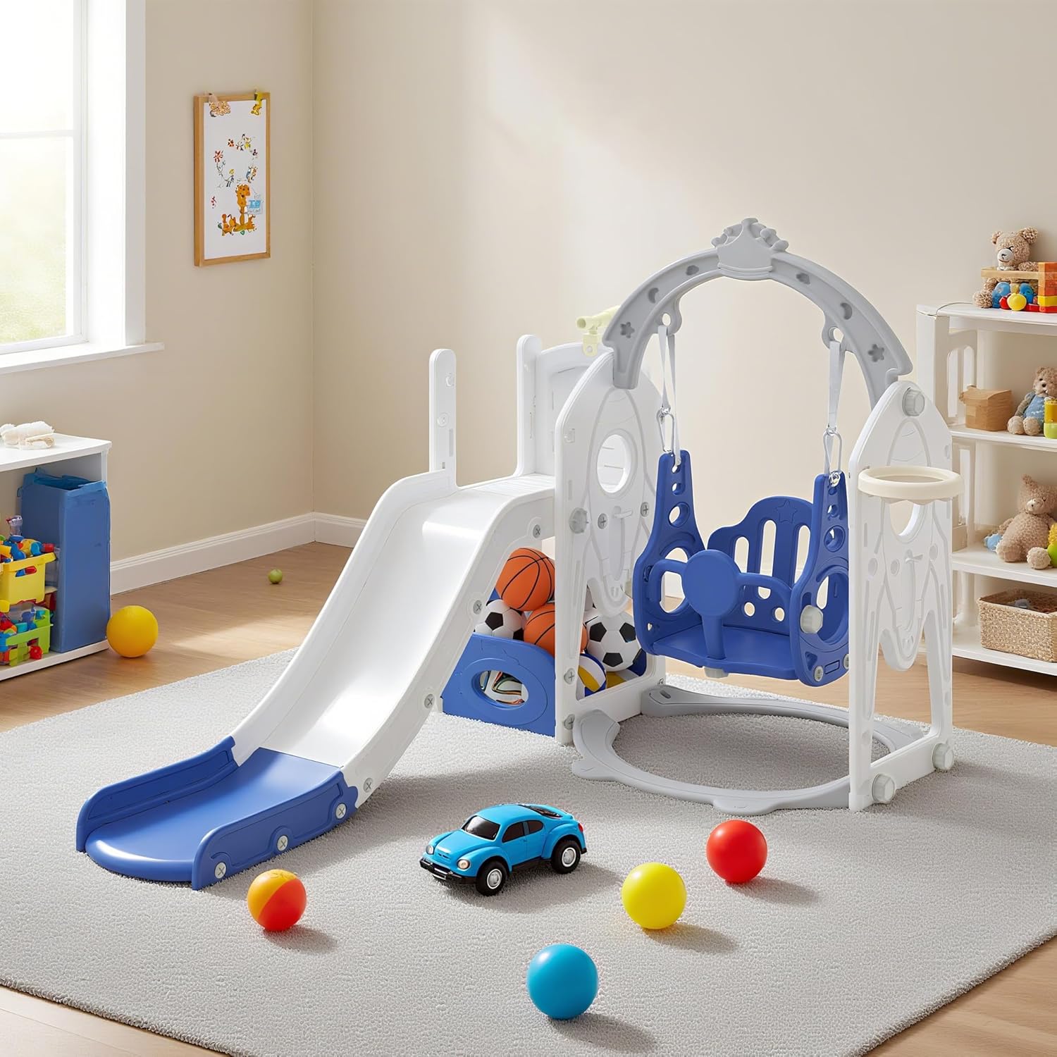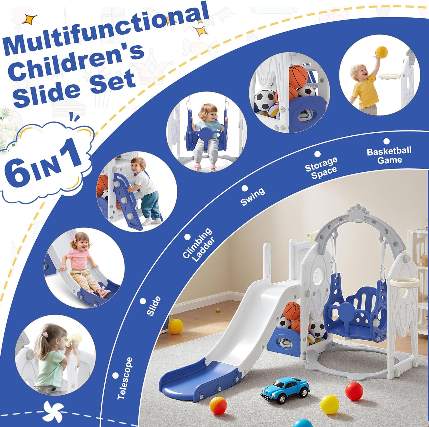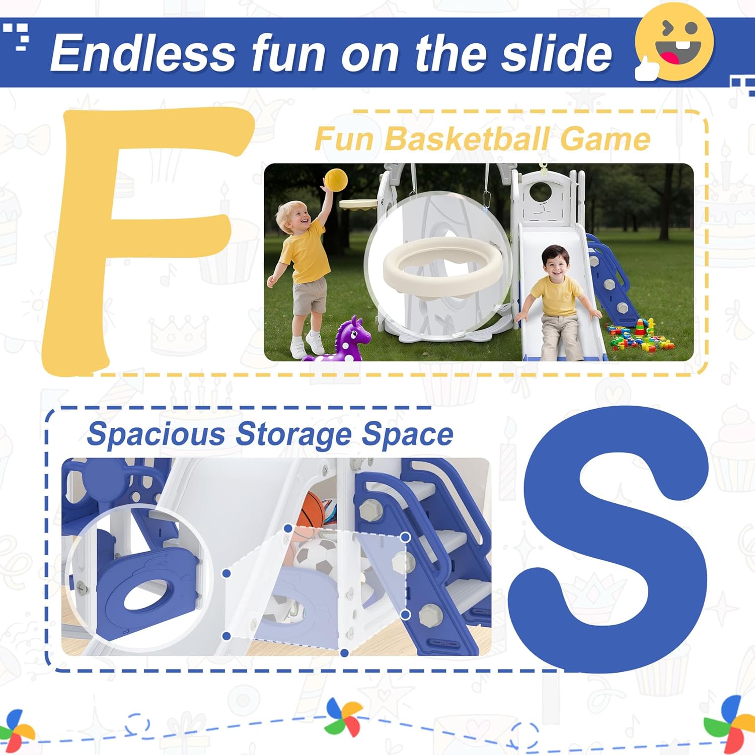 PARCO GIOCO MULTIFUNZIONALE PER BAMBINI: integra scivolo, scaletta, area giochi nascondiglio, ringhiera di sicurezza e altre funzioni. Un unico dispositivo offre molteplici possibilità di gioco come scivoli, arrampicata, lancio di basket e nascondino, rendendolo molto più conveniente rispetto ai singoli giocattoli. STRUTTURA ESTREMAMENTE RESISTENTE E STABILE: lo scivolo per bambini dispone di una base antiscivolo allargata e di una struttura meccanica triangolare con una capacità di carico fino a 50 kg. I pioli della scala da arrampicata sono dotati di una superficie strutturata per evitare scivolamenti durante l'arrampicata. MANUBRI ANTISCIVOLO PER UNA PROTEZIONE COMPLETA: scivoli combinati e la scala da arrampicata sono dotati di corrimano di sicurezza su entrambi i lati, e su entrambi i lati dello scivolo si trovano ringhiere rialzate per consentire ai bambini di aggrapparsi in qualsiasi momento durante la salita e la discesa e l'arrampicata per evitare incidenti dovuti a cadute. MATERIALI SICURI ED ECOLOGICO: lo scivolo da giardino è realizzato in materiale ecologico HDPE e PP di alta qualità, non tossico e inodore, ha una superficie liscia, non contiene sostanze nocive ed è morbido e piacevole al tatto. Crea un'area giochi speciale e sicura per i bambini, in modo che i genitori possano essere rassicurati e i bambini si divertono più a giocare. Facile da pulire, materiale anti-sporco: la superficie è dotata di un rivestimento antimacchia in modo che le macchie di succhi di frutta, terra ecc. possano essere pulite con un panno umido senza dover smontare e pulire il dispositivo. Manutenzione semplice e semplice che facilita la pulizia dei genitori.