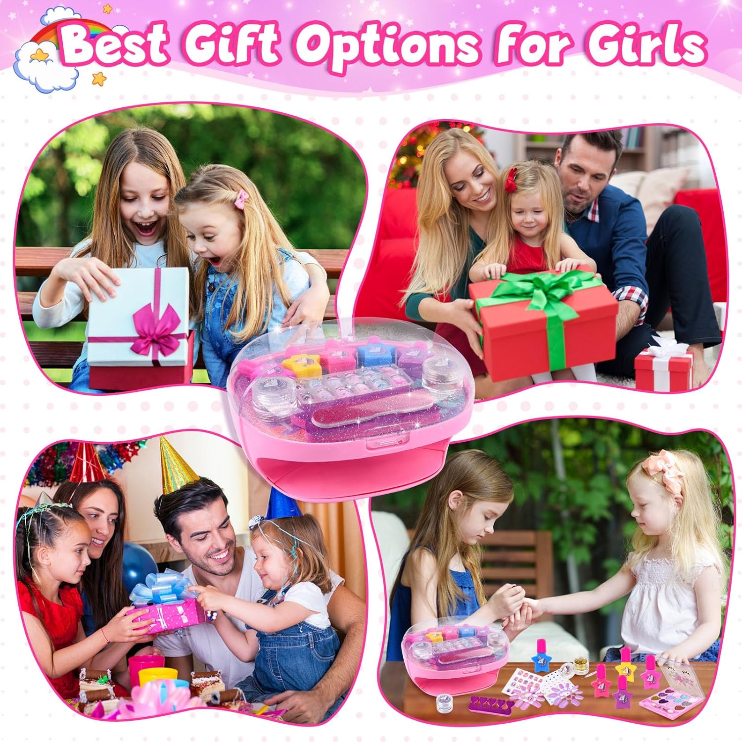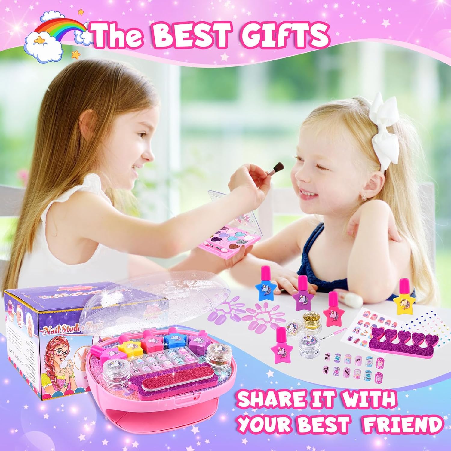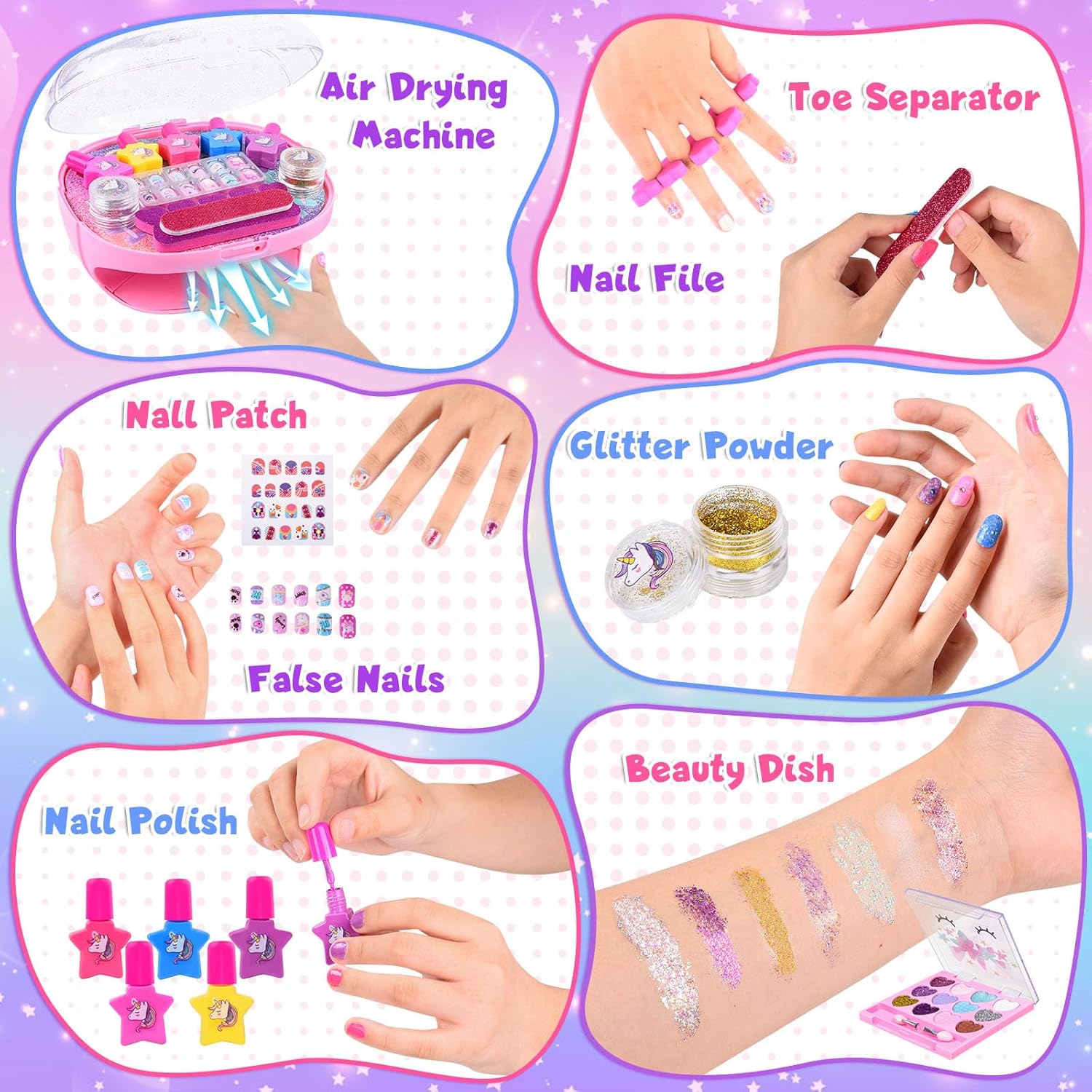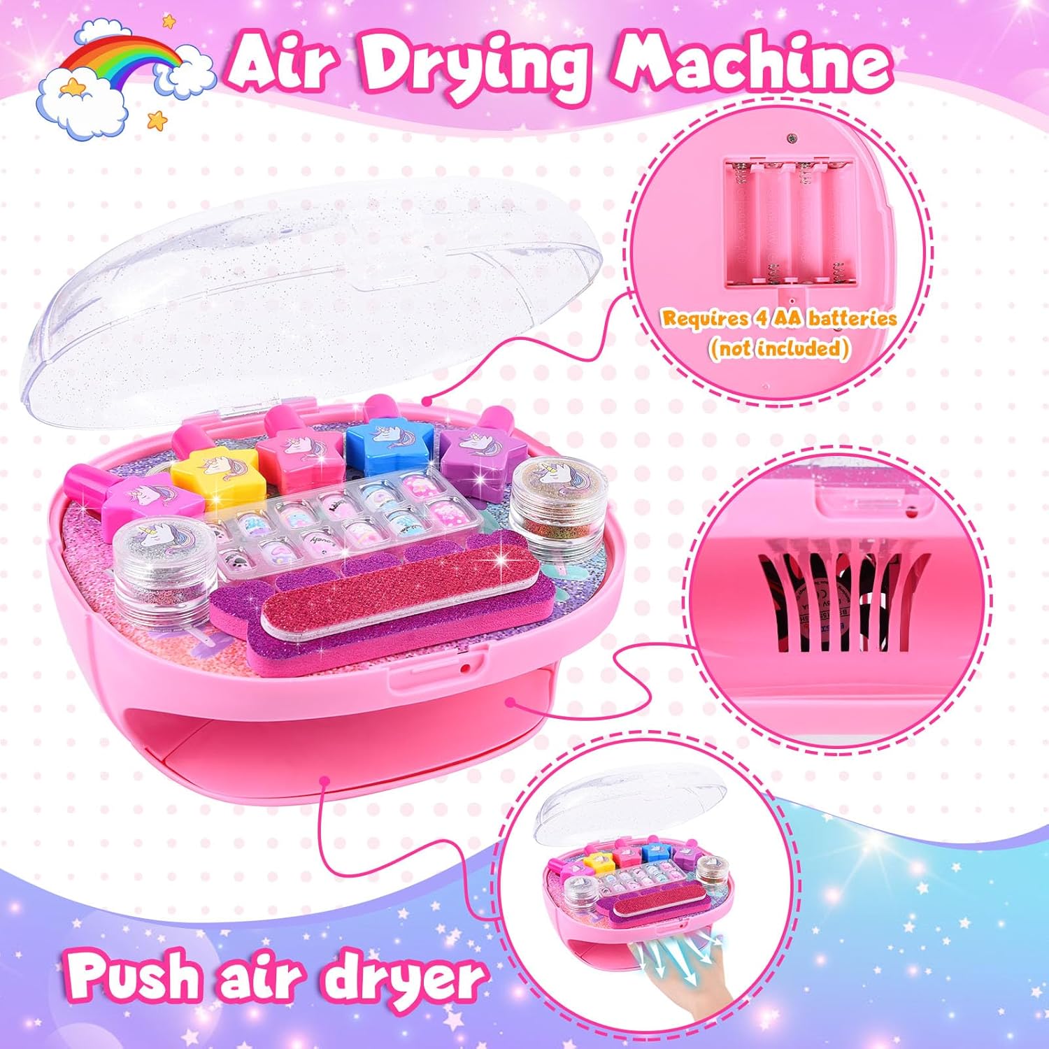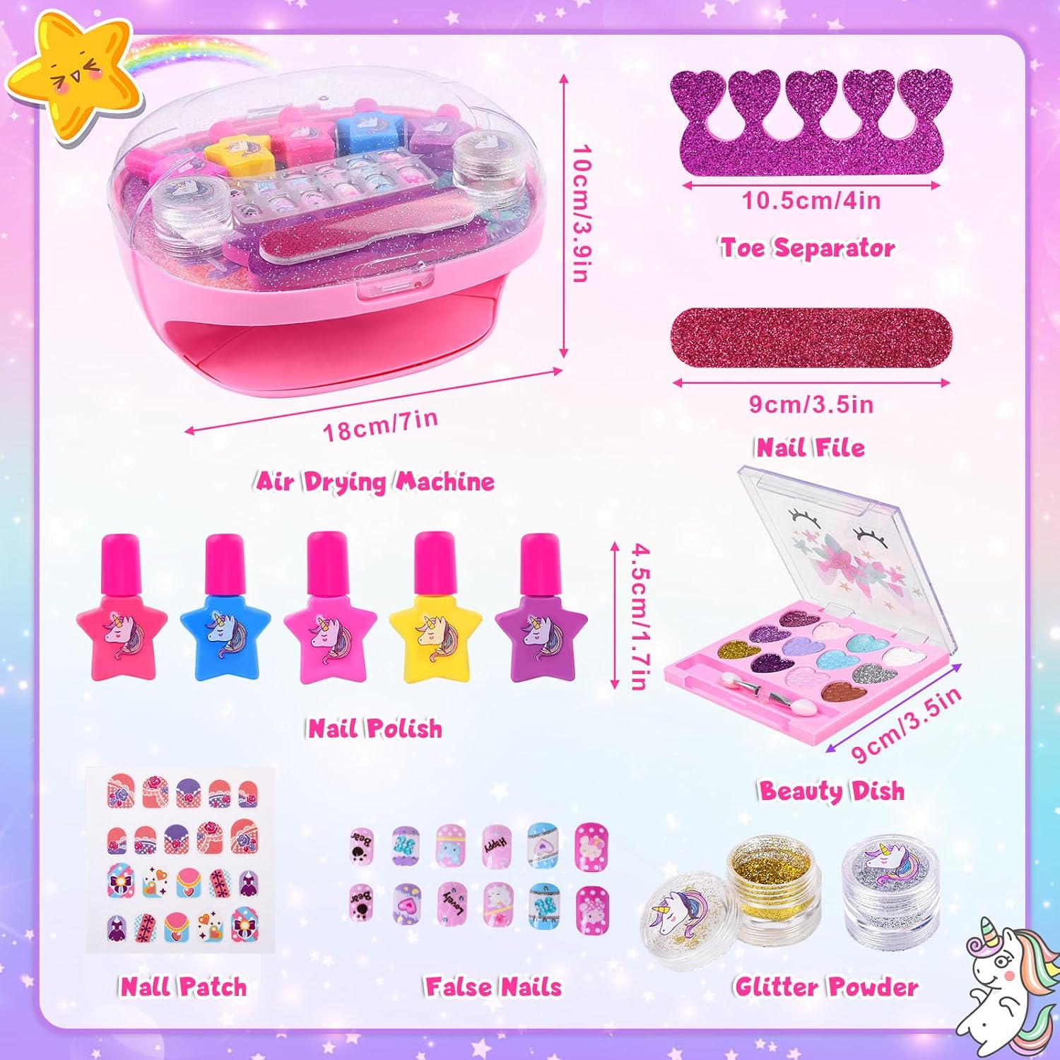 Ricco kit per salone di bellezza per bambini: 1 asciuga unghie, 5 smalti per unghie a forma di cuore, 1 lima per unghie, 1 separatore per dita dei piedi, 2 glitter per unghie, 1 tavolozza di bellezza, 1 adesivo per unghie, 12 unghie finte da attaccare. Con una funzione di stoccaggio sull'asciugacapelli, tutto può essere riposto sopra l'asciugatrice. È uno degli articoli preferiti dai bambini da sempre. Asciuga unghie per bambini: è facile da usare, posiziona le dita sul cuscinetto dell'asciuga unghie, direttamente sotto il soffiatore, e premi verso il basso per un'asciugatura rapida. Questa macchina per asciugare le unghie soffia aria a temperatura ambiente, quindi non devi preoccuparti di ustioni troppo calde o mani nere. L'asciuga unghie può essere utilizzato più e più volte per tutti i comuni smalti e vernici. Smalto lavabile e staccabile: non è necessario alcun solvente per unghie, facile da rimuovere dalla pelle e dalle unghie. Realizzato con materiale BAP di alta qualità. Sicurezza e non tossico, facile da lavare con acqua e sapone. A differenza dello smalto tradizionale, è più adatto ai bambini. Sicuro, non tossico, innocuo per la pelle e i tuoi bambini possono cambiare lo stile delle unghie a loro piacimento ed esplorare la nail art, divertirsi in vacanza. Regali per ragazze: set regalo perfetto per la tua principessa. Questo regalo perfetto per un salone di bellezza per ragazze di 5 6 7 8 9 10 11 anni. I bambini possono mostrare la loro grande creatività e abilità pratiche attraverso i disegni di nail art! Perfetto per compleanni, feste, vacanze, Natale, Festa dei bambini, rientro a scuola, Pasqua, Capodanno e altri eventi speciali. Gioco per unghie per ragazze: i bambini possono invitare gli amici a partecipare alla festa di nail art e gestire il tuo piccolo salone di bellezza. I vasetti glitterati contengono colori oro e argento e adesivi di cartoni animati alla moda, tavolozza di bellezza (disponibile in 12 colori), consentendo alle ragazze di progettare le proprie unghie di bellezza dallo stile unico con fantasia e creatività illimitate e migliorare le proprie capacità motorie e l'estetica visiva.