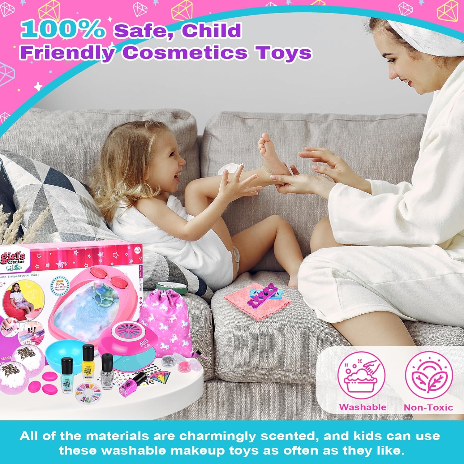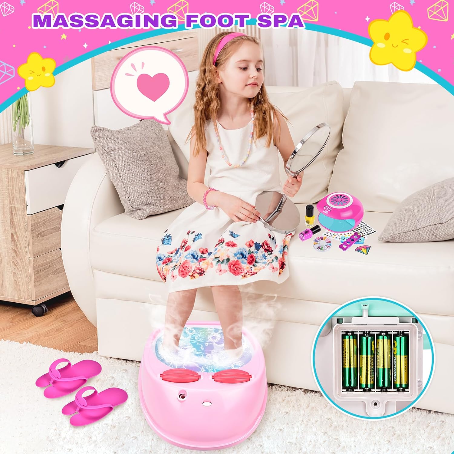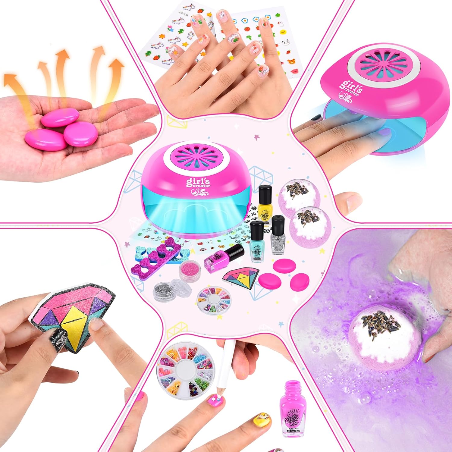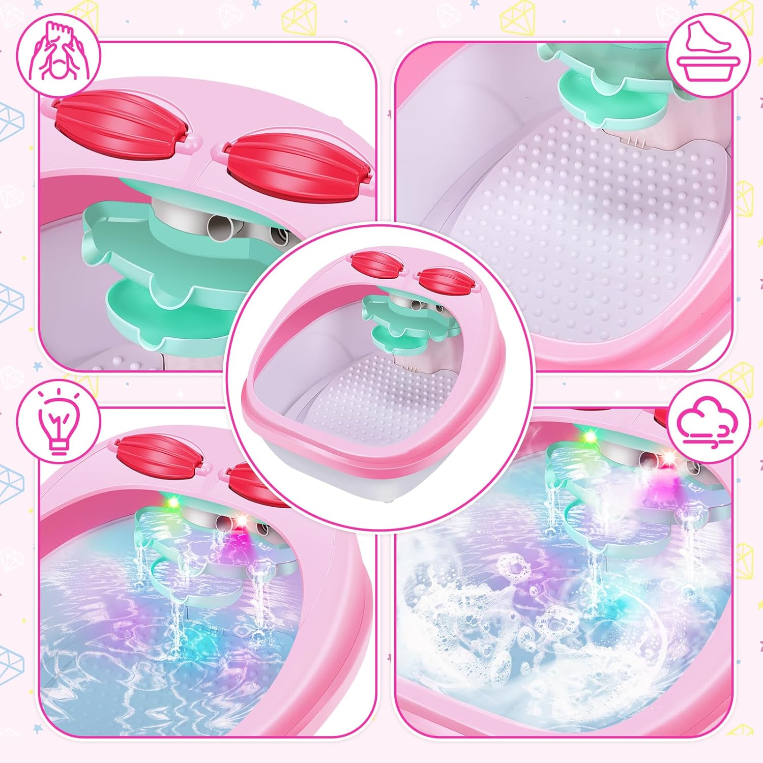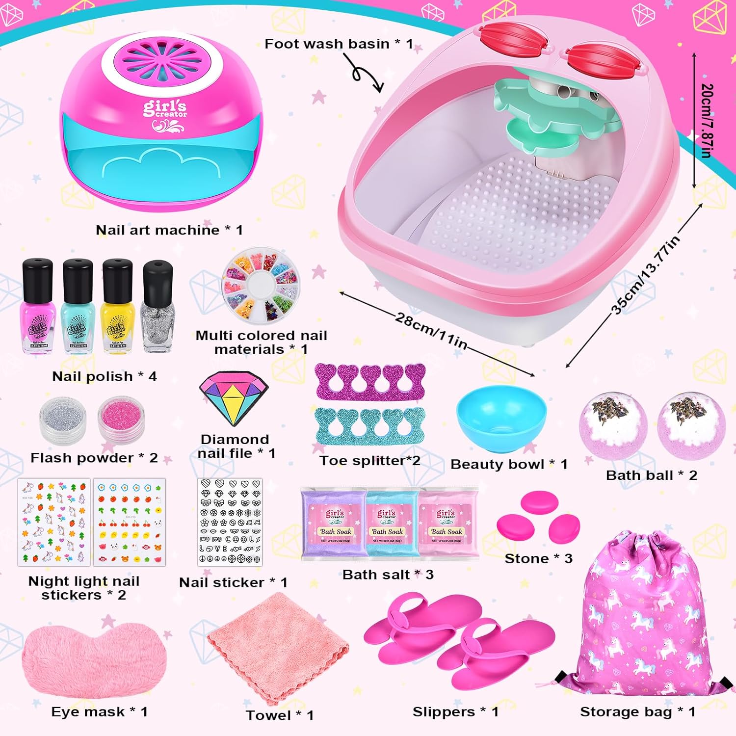 Massaggiatore per pedicure per bambini: il set per pedicure per pedicure per bambini comprende vaschetta per i piedi, bomba da bagno, paillettes per unghie in 12 colori, adesivi per unghie fosforescenti, custodia, maschera per gli occhi, smalto per unghie, adesivi per unghie, sali da bagno, asciugamano, dispenser per manicure, polvere glitterata, lima per unghie diamantata, ciotola, pantofole, pietre per massaggio, separatori per dita dei piedi. Questo set spa per ragazze ha tutto ciò di cui una ragazza ha bisogno, dallo smalto per unghie e un set per asciugare le unghie per ragazze a una rilassante spa per i piedi per ragazze. Pietre da massaggio riscaldate: le pietre da massaggio possono essere utilizzate per un massaggio rilassante. Le ragazze possono riempire una vaschetta per i piedi con bolle di sapone, riscaldare le pietre da massaggio con acqua calda e godersi un massaggio con pietre calde, dove le bolle e le protuberanze sul pavimento forniscono anche un massaggio delicato. Goditi una coccola pedicure per bambini nel comfort di casa tua. In questo modo potrai goderti un'esperienza spa autentica e rilassante. Non utilizzare acqua troppo calda. Stai attento. I bambini devono essere accompagnati da un adulto quando utilizzano le pietre calde. Set smalti per ragazze: il set smalti per ragazze comprende un asciuga unghie, una lima per unghie, un separatore per le dita dei piedi e uno smalto colorato. Le ragazze possono divertirsi a progettare una varietà di stili di nail art posizionando le dita sul tampone per asciugare le unghie e premendo per un'asciugatura rapida. Abbiamo anche unghie finte per ragazze facili da applicare e rimuovere, basta scegliere le unghie finte giuste e attaccarle. I tuoi bambini possono creare i propri disegni per unghie che si adattano alla loro personalità e al loro stile. Perfetto per la giornata alla spa dei bambini: quando l'interruttore è acceso, la luce si accende e la nebbia si diffonde. Tutte le bombe da bagno hanno un profumo meraviglioso e gorgogliano nell'acqua con aromi rilassanti. Le ragazze possono indossare una maschera per gli occhi e godersi un'esperienza spa nel comfort di casa propria. Le ragazze sognano una giornata alla spa, il nostro kit spa permette loro di godersi la spa per piedi e unghie con gli amici a casa. Regalo perfetto per ragazze: set per unghie per trucco per bambini adatto per regali di Natale, regali di compleanno e bomboniere. Mentre si godono la bellezza, diventeranno più concentrati e pazienti, permettendo loro di imparare l'arte del relax con questo set per manicure e pedicure. Dopo il divertimento, tutto entra nella borsa rosa con coulisse. Con questo set spa per ragazze, mettere in ordine è facile e nulla va perduto!