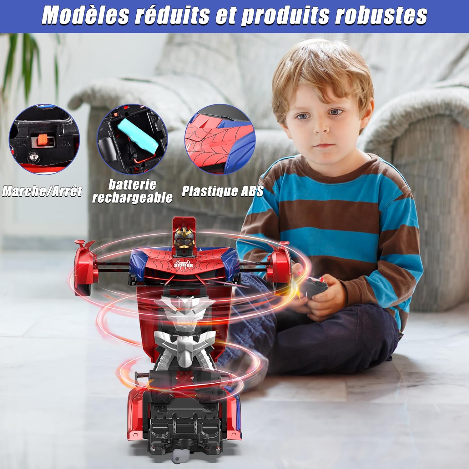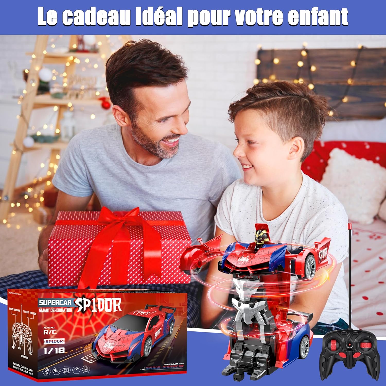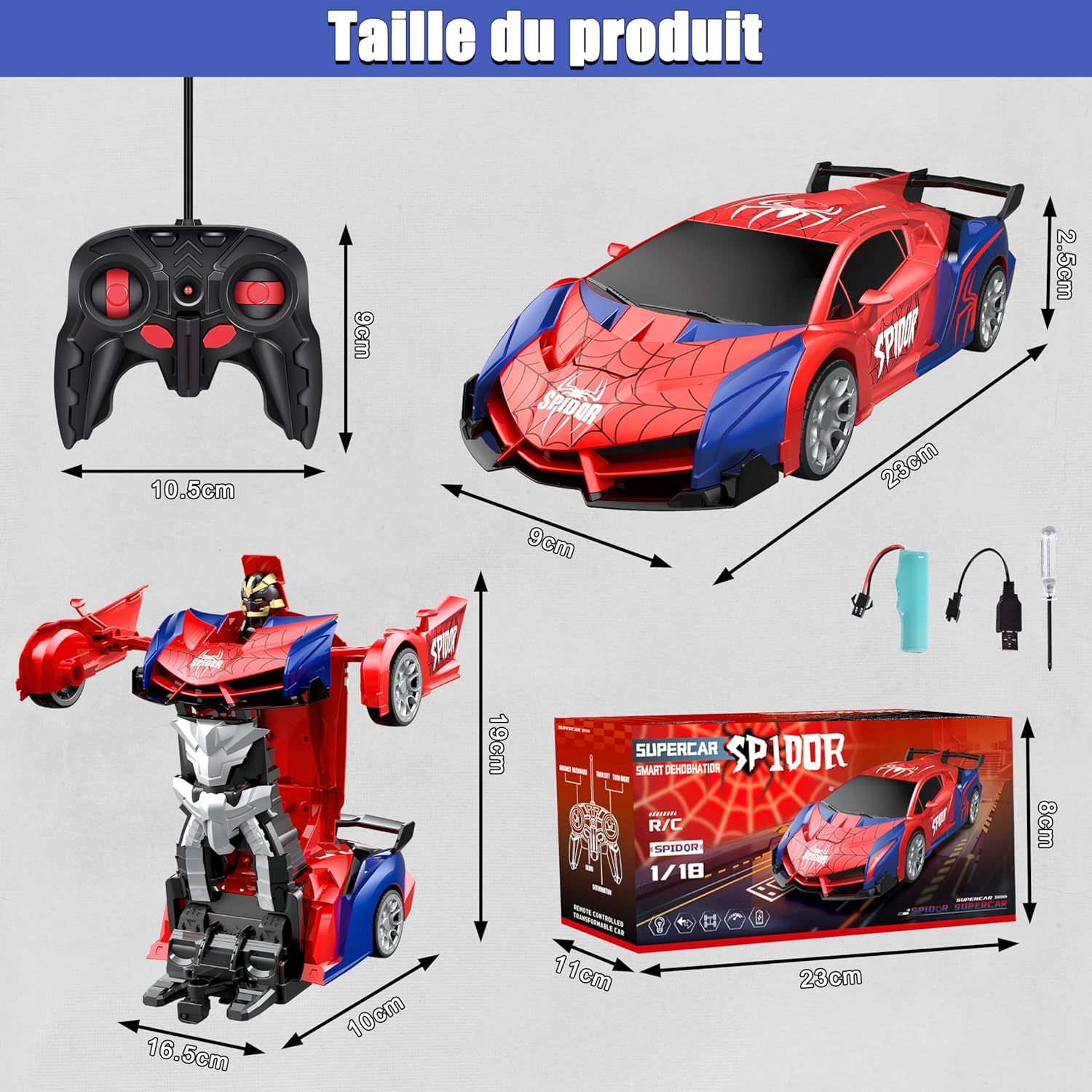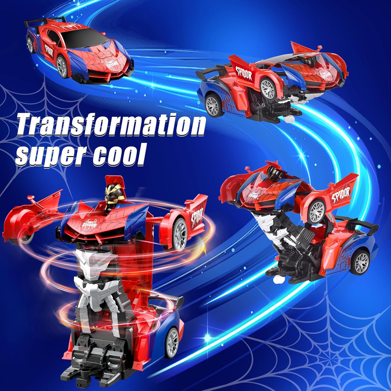 Giocattolo per auto trasformatore 2 in 1: questo giocattolo per auto telecomandato trasformatore combina un'auto e un robot, può passare dall'auto al robot. Presenta un fantastico design a ragno rosso e blu, può attirare l'attenzione dei bambini. Materiali di alta qualità: questa macchina robot rc è realizzata con materiali di alta qualità, resistenti agli urti e durevoli. Maggiore durata riducendo i danni dovuti a cadute accidentali durante l'uso. L'auto telecomandata è alimentata da una batteria ricaricabile (inclusa) e viene fornita con un cavo di ricarica e un cacciavite. Il telecomando richiede 2 batterie AA (NON INCLUSE). Semplice e facile da usare: il robot giocattolo per auto con telecomando Transformer basta tenere premuto un pulsante per passare dall'auto al robot. Tieni premuto l'altro pulsante del telecomando dell'auto per muoverti da solo per giocare. Funzionamento del telecomando per far muovere l'auto o il robot avanti, indietro, girare a destra e girare a sinistra. Ha una ruota omnidirezionale flessibile sul fondo ed è possibile la rotazione a 360°. Scenari applicabili: l'auto telecomandata RC può essere utilizzata all'interno, all'esterno e in altre situazioni di gioco. Può essere utilizzato con genitori e amici per una vera ed emozionante gara automobilistica. Può essere utilizzato anche come decorazione per l'ufficio o la cameretta dei bambini. Il miglior regalo per i bambini: questa auto giocattolo telecomandata ha un aspetto accattivante, adatto a giovani e ragazze a cui piacciono i robot e le auto. Regalo ideale per il compleanno di un bambino, Natale o qualsiasi altro regalo festivo.