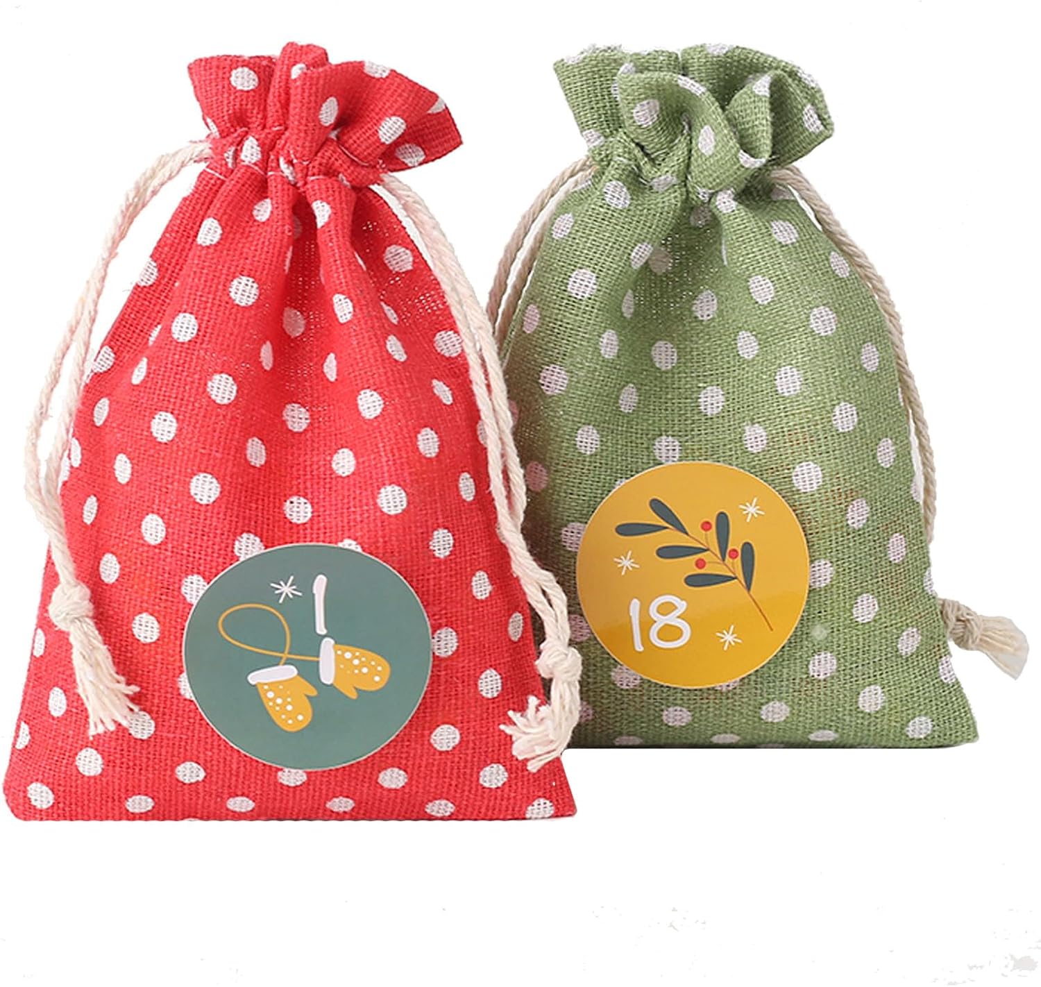 24 pezzi di calendario dell'Avvento da riempire + 24 pezzi di sacchetti di cotone adesivi per calendario dell'Avvento Dimensioni: ca. Bustine 10*14cm Materiale: cotone Ogni bustina in tessuto è dotata di doppia coulisse che ne consente una facile apertura e chiusura. Ciò garantisce che i tuoi articoli siano tenuti al sicuro e non cadano facilmente. Quantità di consegna: 24 calendari dell'Avvento da riempire + 24 adesivi per calendario dell'Avvento