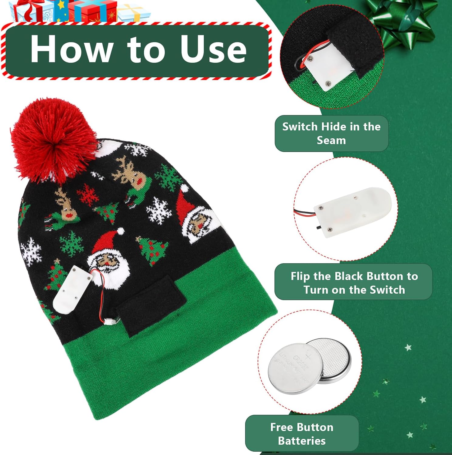 Materiale: il cappello da festa a Led è realizzato in tessuto a maglia superiore, delicato sulla pelle, morbido, sicuro e confortevole, non devi preoccuparti di sentirti a disagio. Dimensione universale: cappello beanie unisex cappello LED può adattarsi alla maggior parte dei tipi di dimensioni della testa di persone, bambini, bambini, uomini o donne con il suo alto elastico. Regalo aggiuntivo: ti verrà inviata una batteria sostituibile da 2 pezzi, puoi facilmente sostituire la batteria aprendo leggermente il vano batteria. Alimentato: I nostri fari a LED a luce calda con torcia a LED alimentati da 2 pile a bottone al litio CR2032 (incluse), possono durare circa 36 ore. Adatto per: cappello leggero a led Beanie Knit Cap è un regalo perfetto per Natale, compleanno, Capodanno o festa per la tua famiglia, gli amici, l'amante oi bambini e così via.