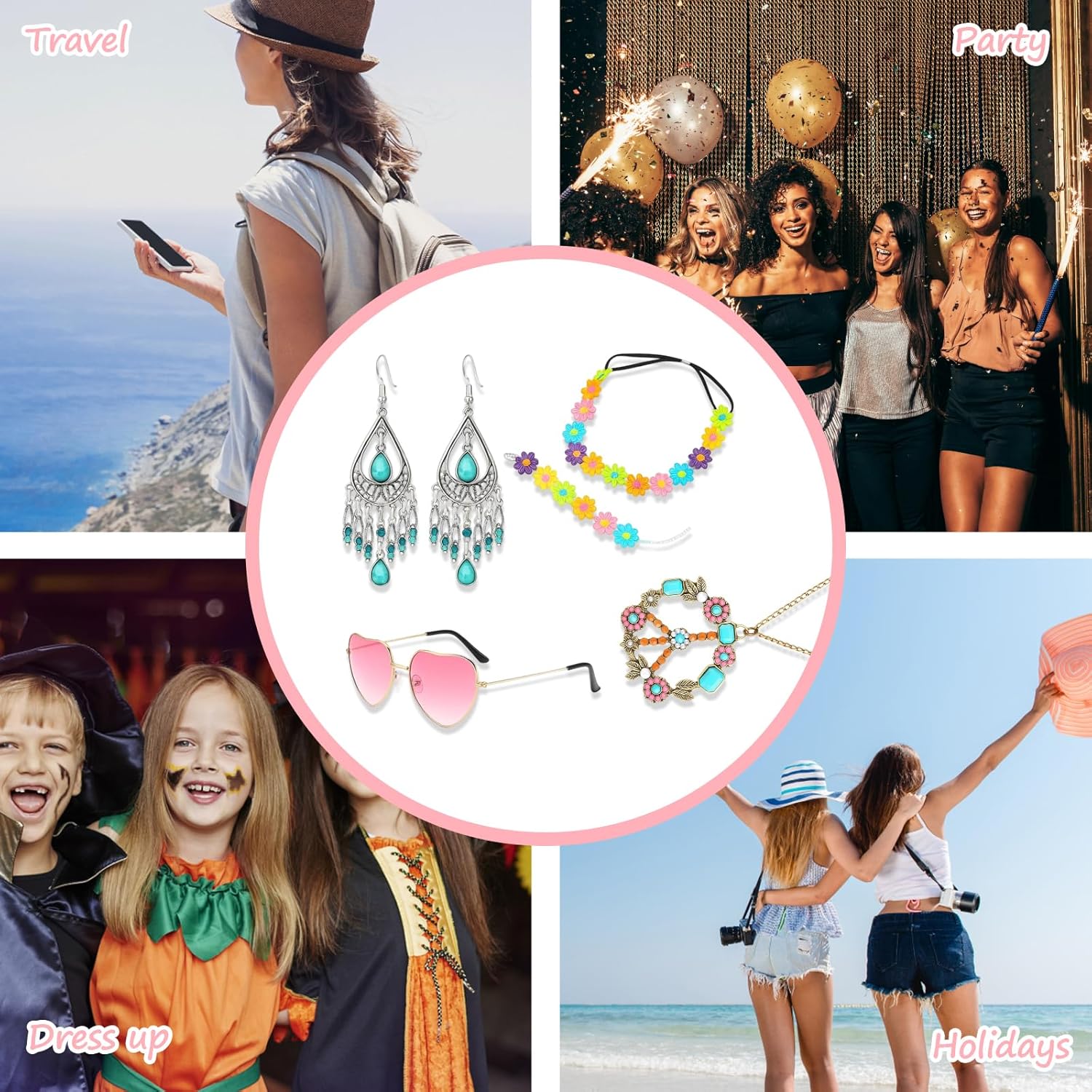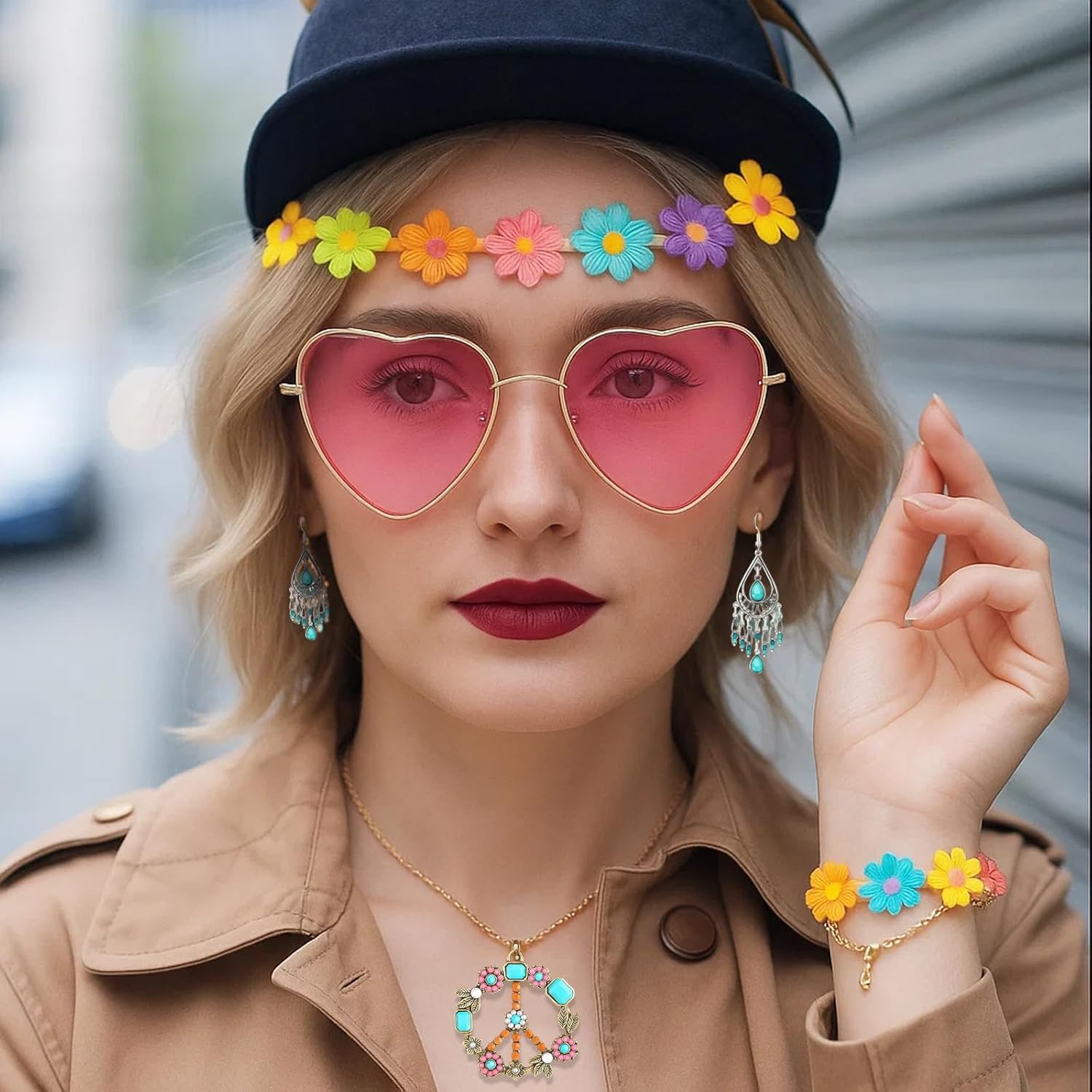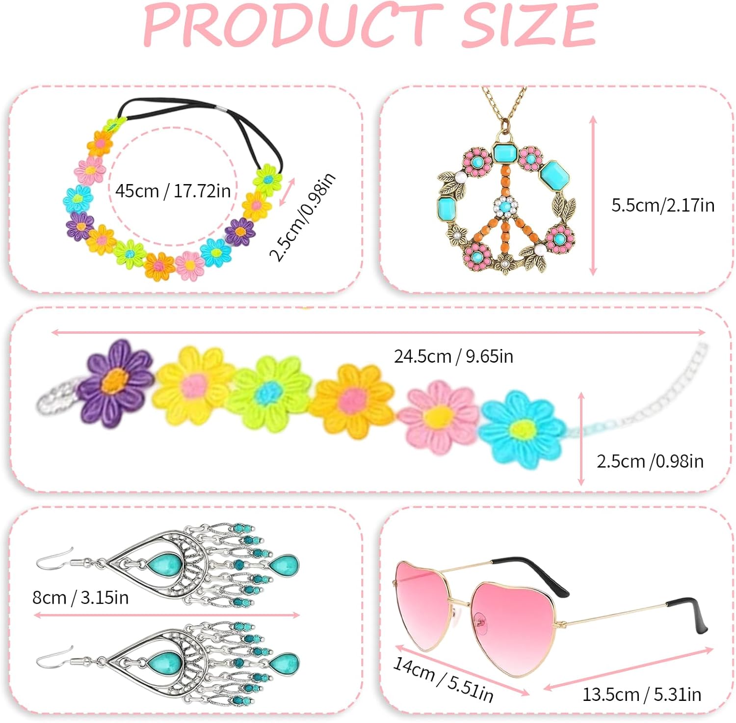 Set di accessori hippie: include 1 fascia a margherita, 1 braccialetto, 1 collana, 1 paio di occhiali da sole e 1 paio di orecchini; perfetto per abbigliamento da donna e hippie anni '70 Stile anni '70: la fascia e gli occhiali da sole con margherite conferiscono al vostro outfit un autentico look hippie; ideale per feste di battuta ed eventi retrò 【Lavorazione di alta qualità】: ogni accessorio è accuratamente realizzato per garantire resistenza e comfort; gli occhiali da sole offrono protezione dai raggi UV 【Combinazione versatile】: gli accessori possono essere indossati singolarmente o come set; perfetti per feste a tema, stile retrò quotidiano o feste di vacanza 【Design elegante】: la collana e il bracciale completano qualsiasi outfit hippie; facile da abbinare a diversi abiti per un look inconfondibile