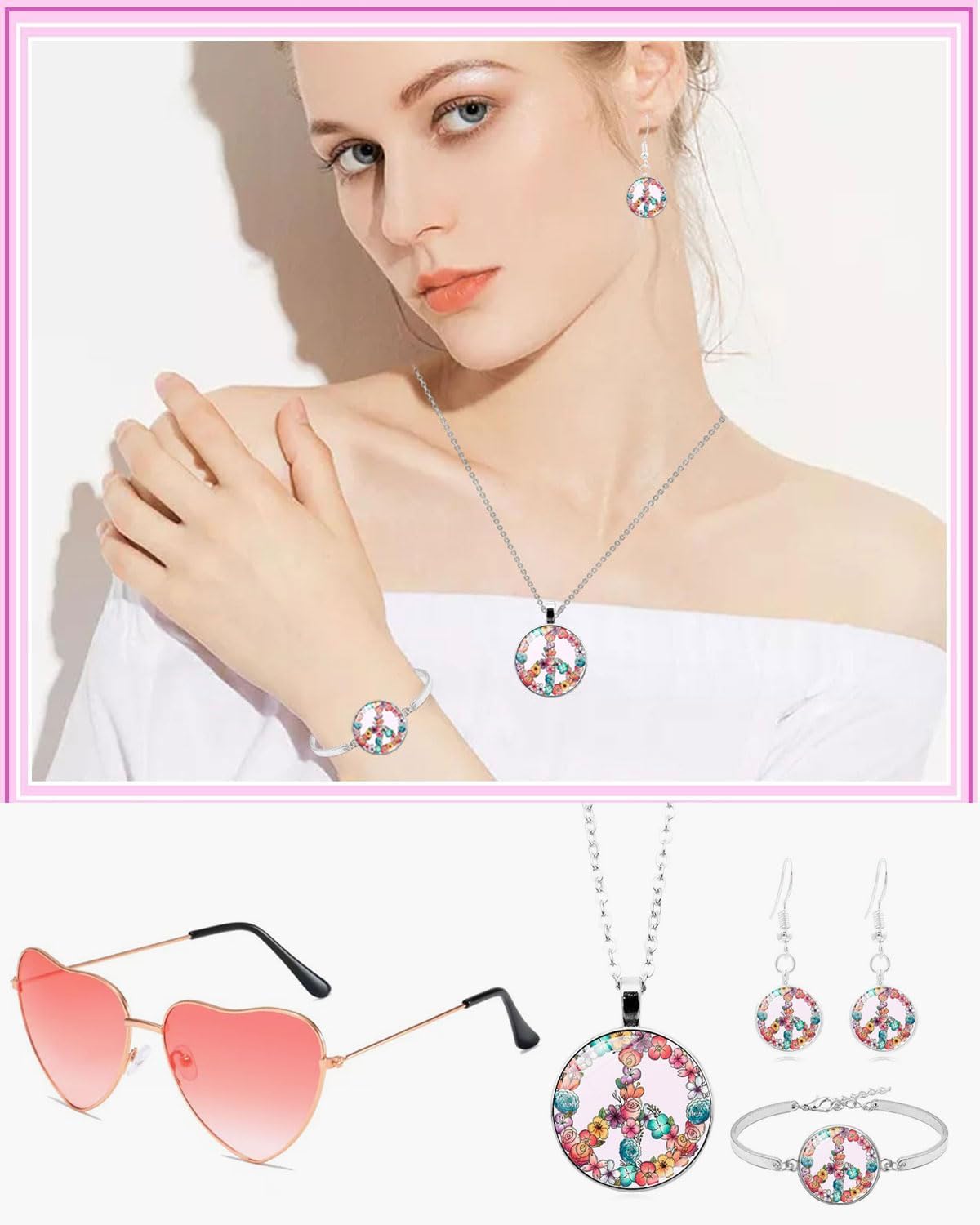 Contenuto Del Set: ogni set contiene 4 accessori per costumi hippie, tra cui un paio di occhiali da sole a forma di cuore e una collana, un braccialetto e degli orecchini hippie con il simbolo della pace, con uno stile retrò anni '60 e '70, perfetti per le feste estive in spiaggia e per Halloween Stile Hippie: questo set hippie è un accessorio indispensabile per l'abbigliamento in stile anni '60 o '70, adatto sia per uomini che per donne, simboleggia la speranza, la pace, lo stile hippie e la bellezza nella vita, adatto per accessori quotidiani e feste estive in spiaggia Set Di Segni Di Pace: I nostri accessori di abbigliamento hippie includono collane, orecchini e bracciali con il simbolo della pace, simbolo di pace e amore, che si abbinano perfettamente a qualsiasi outfit. Possono essere abbinati a camicie tie-dye, pantaloni larghi e abbigliamento hippie Ampia Gamma Di Usi: Adatto a feste bohémien, feste retrò anni '60 o '70 e feste di Halloween. Con questi accessori hippie, puoi divertirti con il gioco di ruolo con il tuo partner, amici, familiari, colleghi o altri, rendendo la tua festa più interessante Garanzia Di Qualità: in caso di problemi durante l'acquisto del nostro set di accessori per abbigliamento hippie, non esitate a contattarci. Vi risponderemo in tempo utile per garantirvi un'esperienza di acquisto soddisfacente. Vi auguriamo un felice shopping