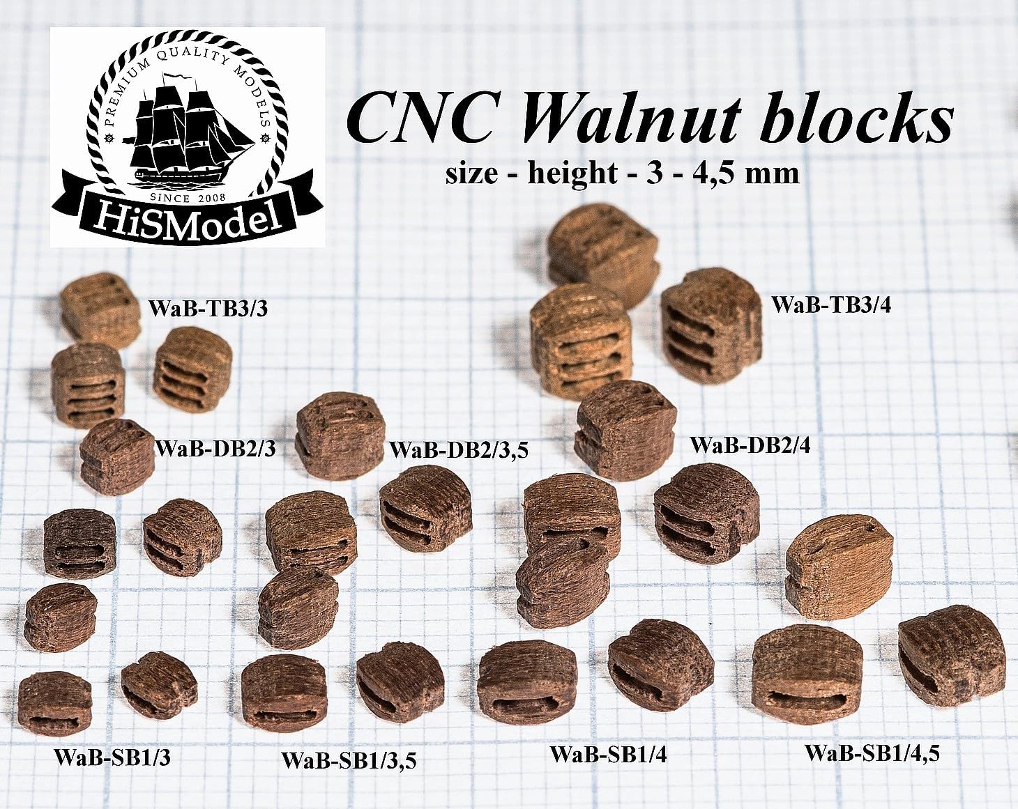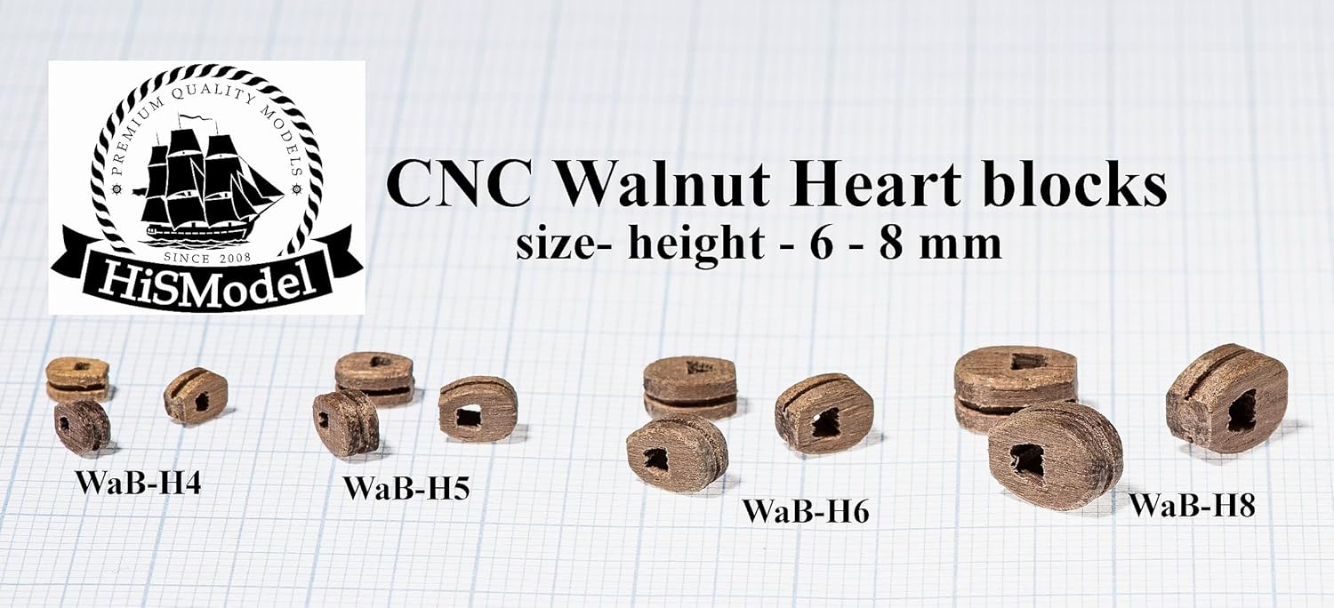 Un set di pulegge fisse in legno di noce per una nave modello. Pulegge per modello: USS Kearsarge Produttore del modello: Revell Scala: 1:96 Numero di pulegge nel set: 200