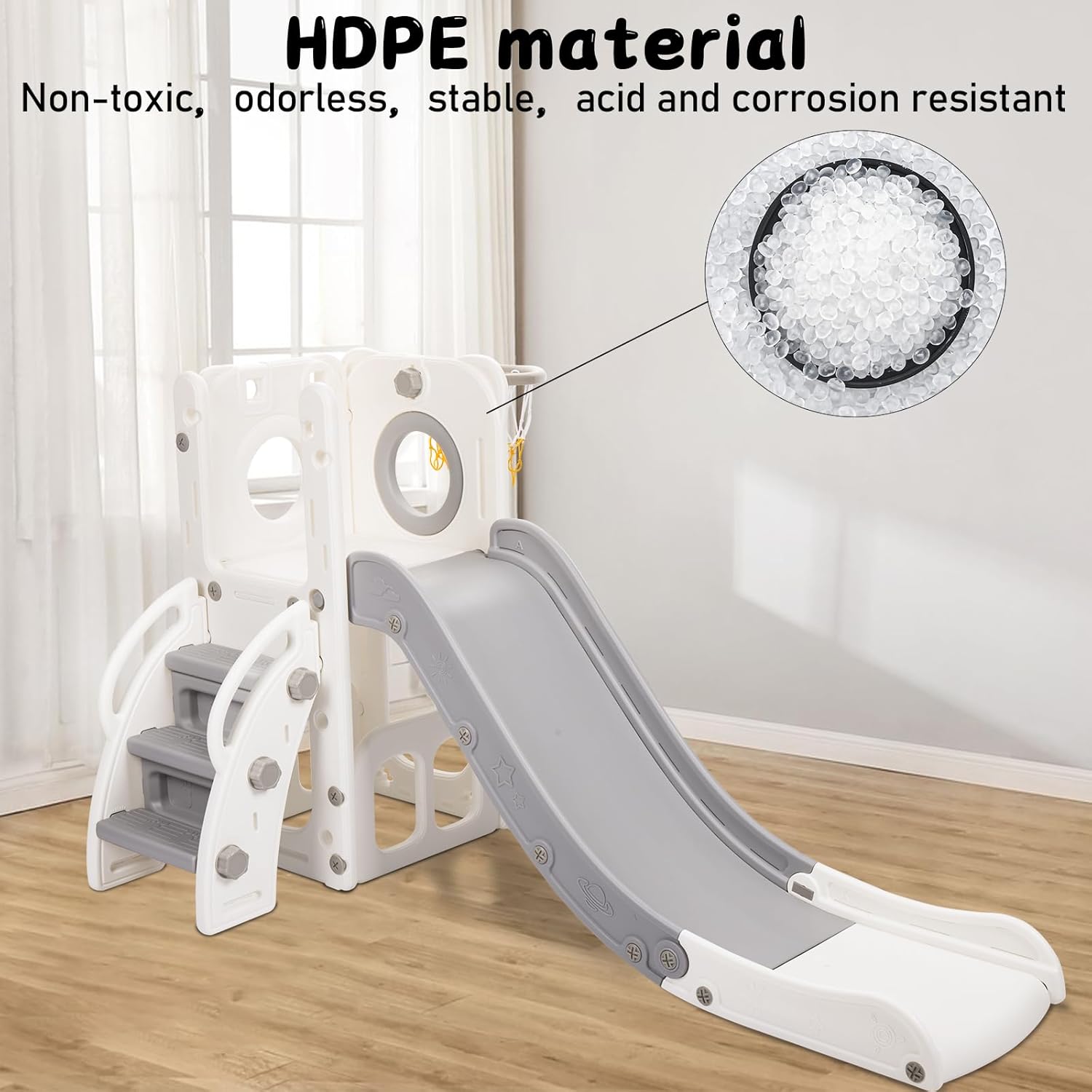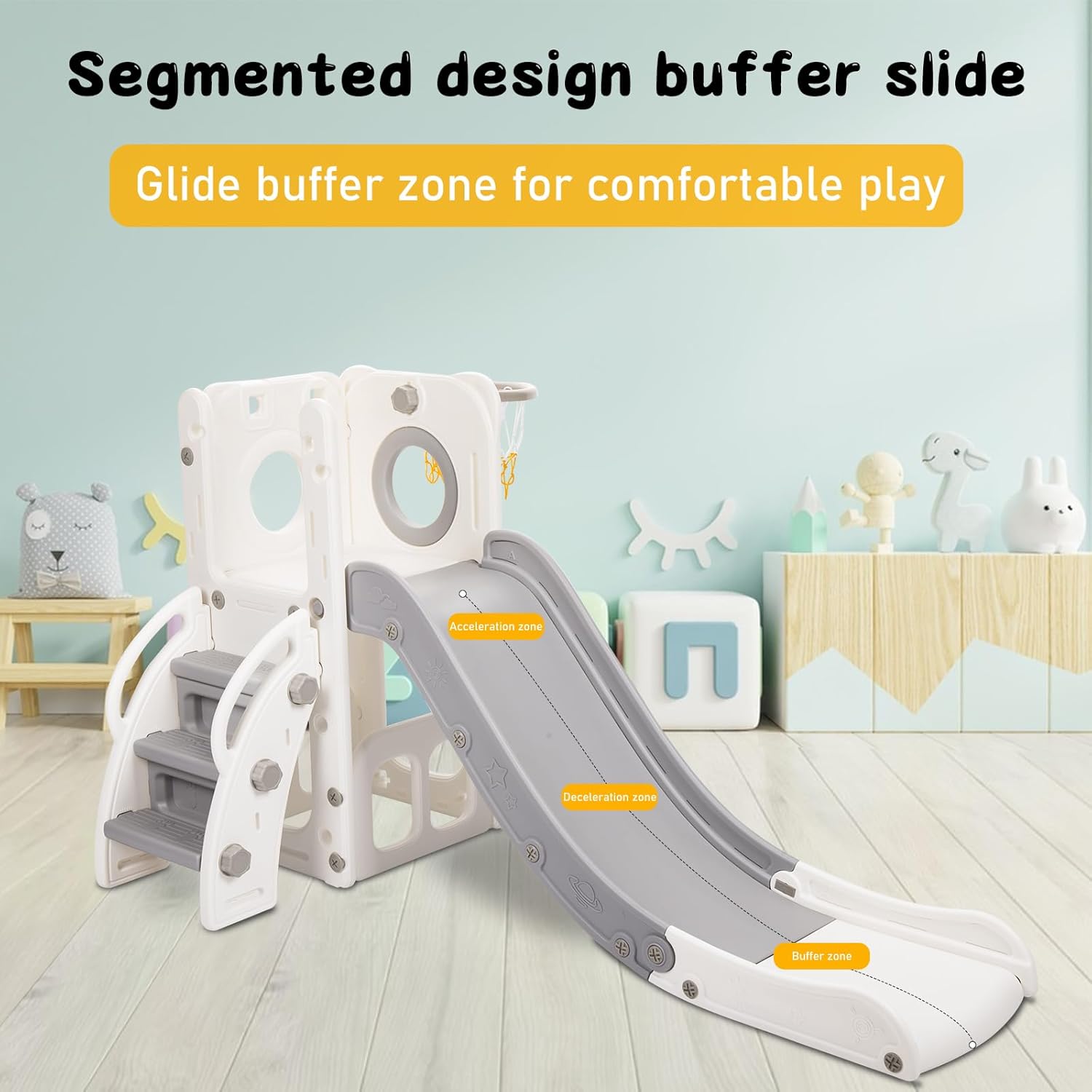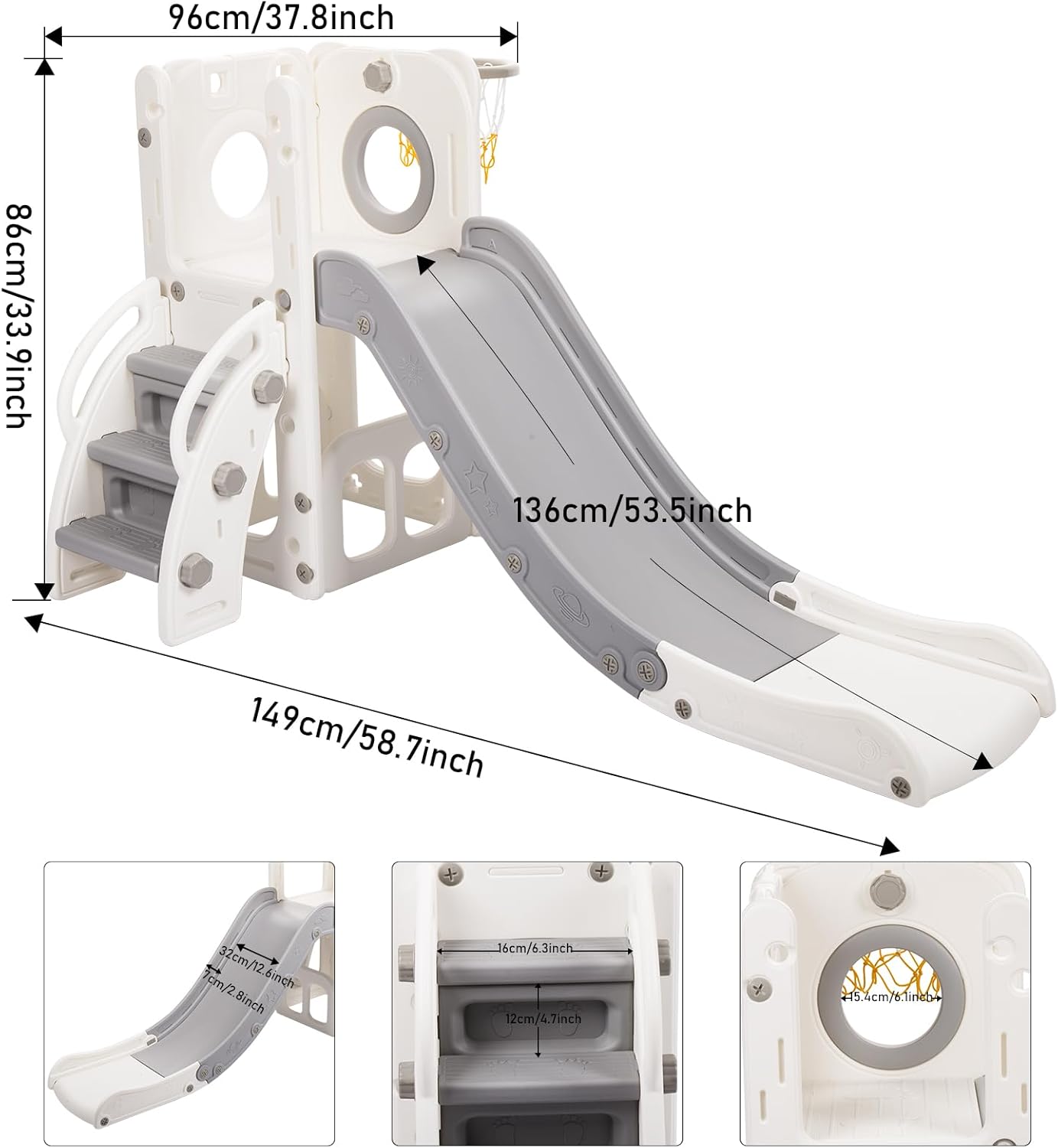 【Area ricreativa completa】4 in 1 scivolo per bambini da casa interno Impostatoset Include comprende gradini per arrampicarsi, uno scivolo, un canestro da basket e uno spazio di archiviazione. I bambini possono usare gli scivoli per svolgere attività di scivolamento, arrampicata e tiro che promuovono la coordinazione, lo spirito d'avventura e le capacità motorie. Regala ai bambini un divertimento senza fine. 【Materiale adatto ai bambini】Scivolo bambini realizzato in HDPE ecologico e pannelli robusti. Corrimano rotondi per facilitare la salita. Utilizziamo bulloni di plastica più sicuri anziché di ferro per evitare che i bambini li lecchino. La superficie dello scivolo per bambini è lucidata e non graffia la pelle del bambino 【Scivolo per bambini piccoli fluido e sicuro】 Lo scivolo allargato ed esteso è scientificamente progettato con zona di accelerazione, zona di decelerazione e zona cuscinetto, consentendo ai bambini di scivolare dolcemente e atterrare in sicurezza. L'ampio scivolo offre al tuo bambino uno spazio illimitato. Inoltre, i corrimano rinforzati su entrambi i lati aggiungono ulteriore sicurezza 【Uso interno ed esterno】Lo scivolo per bambini da interno ed esterno è adatto per uso interno ed esterno. Le sue dimensioni sono 149x96x86 cm, il che lo rende perfetto per qualsiasi spazio. Sia all'interno che all'esterno, i nostri scivoli garantiscono ai vostri bambini un gioco felice e sicuro. Pulisci il set da gioco per bambini prima dell'uso per rimuovere la polvere che potrebbe essersi accumulata durante lo stoccaggio e il trasporto. 【Facile da installare in poche ore】Lo scivolo per bambini da 1 a 5 anni è facile da installare. L'assemblaggio consiste semplicemente nel fissare insieme le parti. L'installazione può essere completata in genere in poche ore. Nota bene: si consiglia di serrare saldamente ogni vite e di controllare settimanalmente la stabilità delle guide di scorrimento per garantire un utilizzo sicuro da parte dei bambini.