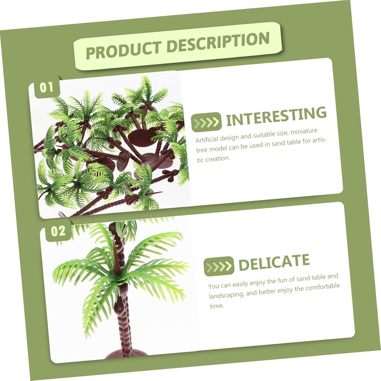 Miniatura albero cocco da tavolo sabbia - realizzato in pvc che offre stabilità e durevolezza, molto duro e liscio per un duraturo, alberi per case delle bambole Mini decorazione per albero: ha dimensioni giuste, non occupa troppo spazio ed è facile da trasportare dove serve, modello albero da tavolo sabbia Mini alberi cocco: mini oggetti scena creativi per paesaggio, adatti per decorare tavoli sabbia, piccoli o micro paesaggi, decorazioni cocco per tavolo Modello in miniatura: con lavorazione raffinata e dimensioni ragionevoli, questi modelli alberi sono leggeri, facili da trasportare e riporre, simulazione albero cocco Modello albero da tavolo sabbia: modello albero finto può essere applicato al paesaggio del tavolo sabbia e diventa più divertente e facile da usare fai da te, artigianato alberi