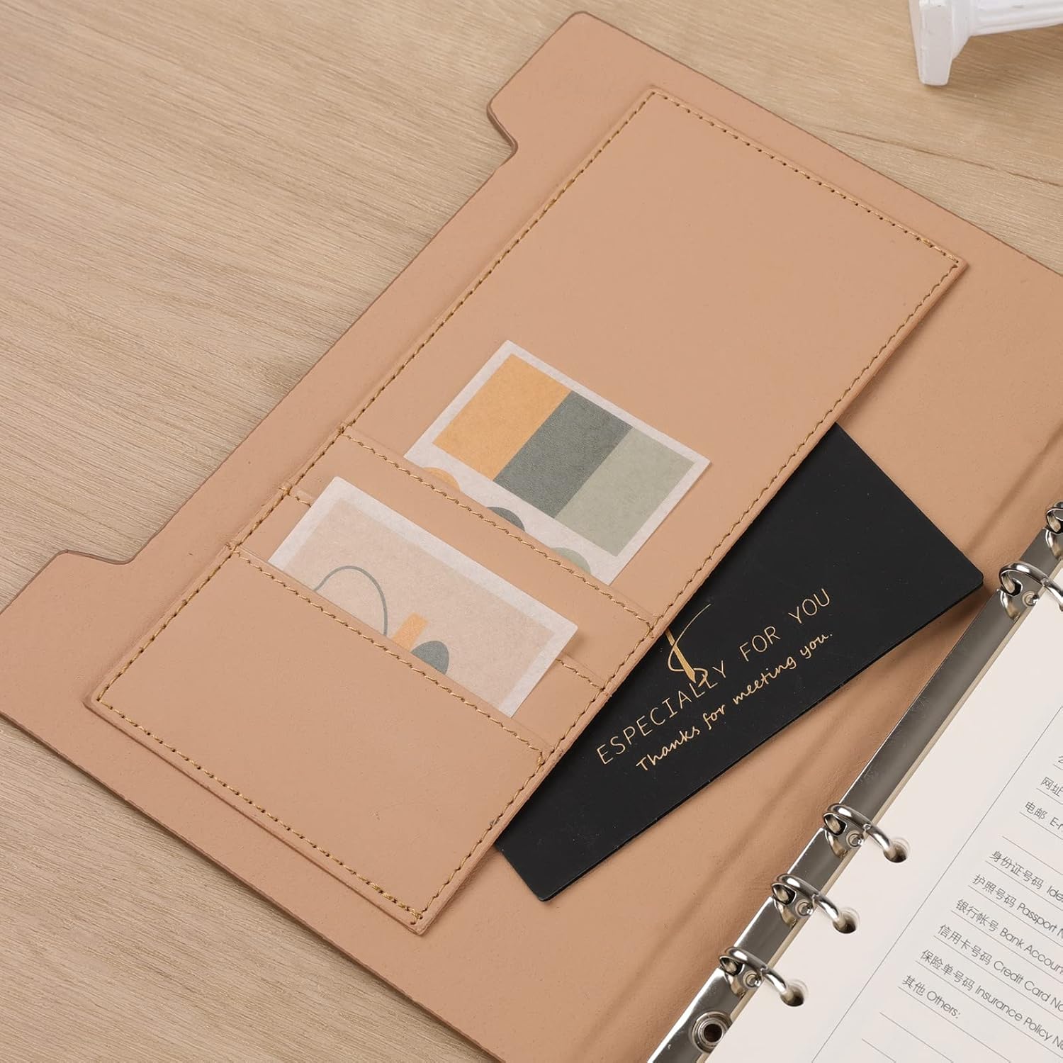 Design elegante e qualità suprema: copertina in pelle PU con tasche, portapenne e penna, 6 anelli neri flessibili consentono di rimuovere o aggiungere pagine facilmente, carta spessa premium da 100 g/m² adatta alla maggior parte delle penne per una scrittura fluida senza sbavature o sbavature di inchiostro. Goditi un'esperienza di scrittura confortevole. Tutti i design eleganti e umanizzati lo rendono una buona scelta per prendere appunti, riunioni, scrivere elenchi di cose da fare, appunti di studio, piani e sentimenti in ufficio, a scuola, a casa e in viaggio. La migliore scelta di regali: ideale come regalo per i tuoi amici, familiari, insegnanti e te stesso. Il quaderno da scrittura è perfetto come regalo di Natale, regalo di compleanno, regalo di nozze, regalo di rientro a scuola, ecc. Multifunzione: questo quaderno in pelle PU può essere utilizzato come quaderno aziendale, organizer personale, quaderno di studio, diario di viaggio, diario, quasi può essere utilizzato in tutte le occasioni. Diario di viaggio: A5.23.2 x 18 cm, formato portatile per diverse tasche che puoi portare ovunque. Il taccuino è dotato di penna, portapenne, tasca e portacarte. Puoi inserire la penna e aggiungere il tuo biglietto da visita, carta di credito, biglietto, ecc. Molto pratico per l'uso quotidiano o in viaggio. Diario in pelle ricaricabile: puoi aggiungere pagine o eliminare pagine senza danneggiare il diario. Lo schedario è realizzato in metallo in modo che possa resistere all'uso regolare. Un piccolo raccoglitore non ti disturba quando scrivi. Pelle PU premium: avendo una maggiore resistenza all'abrasione e ai graffi, più morbida ed elastica, può preservare la tua memoria per molti anni. Rendi il tuo diario attraente.