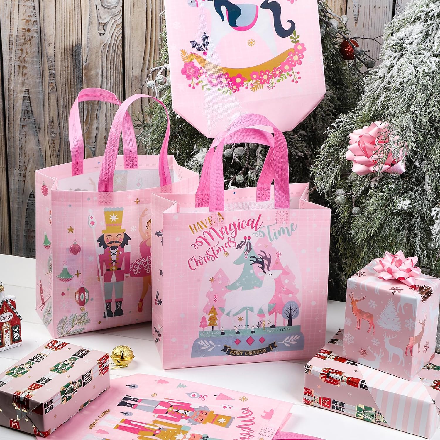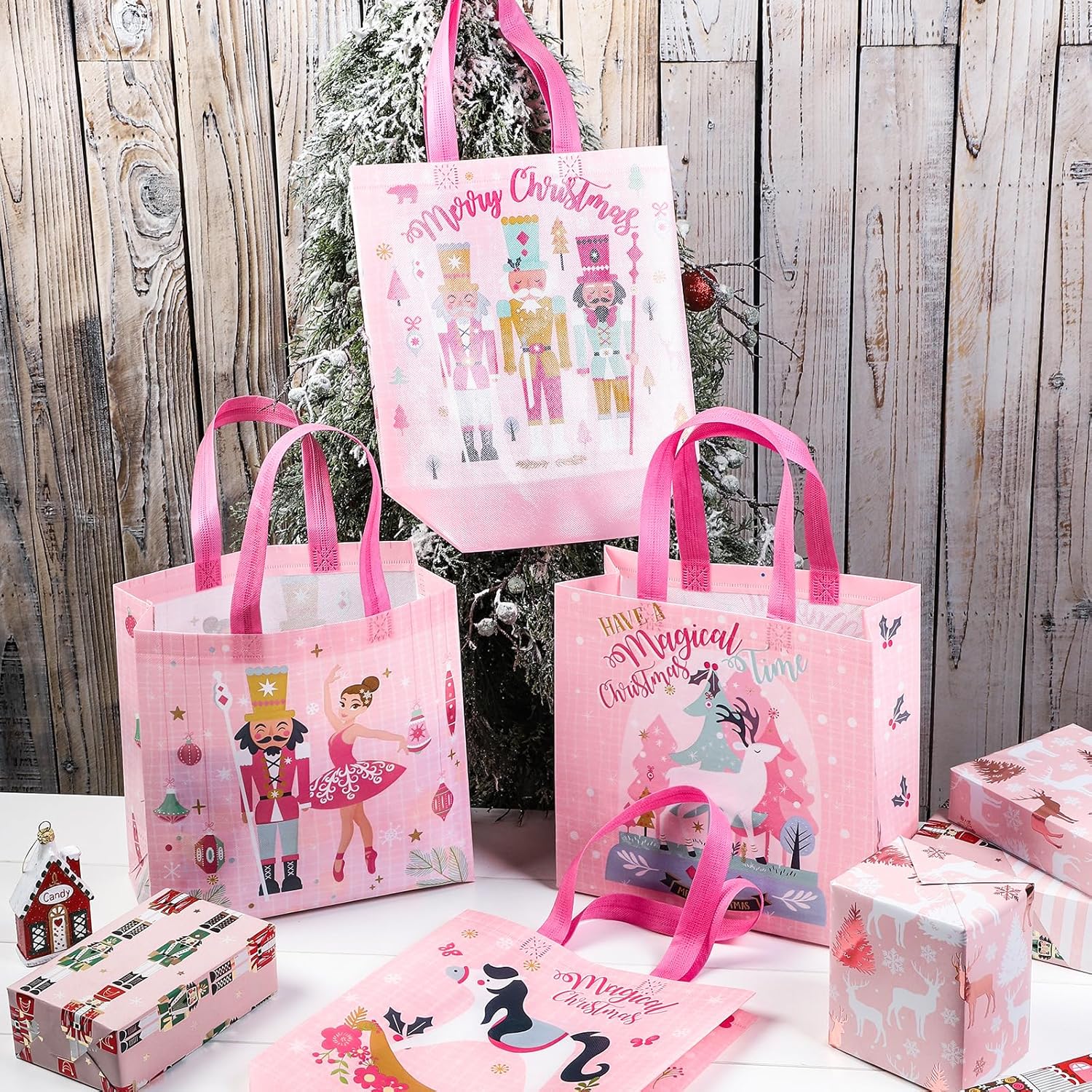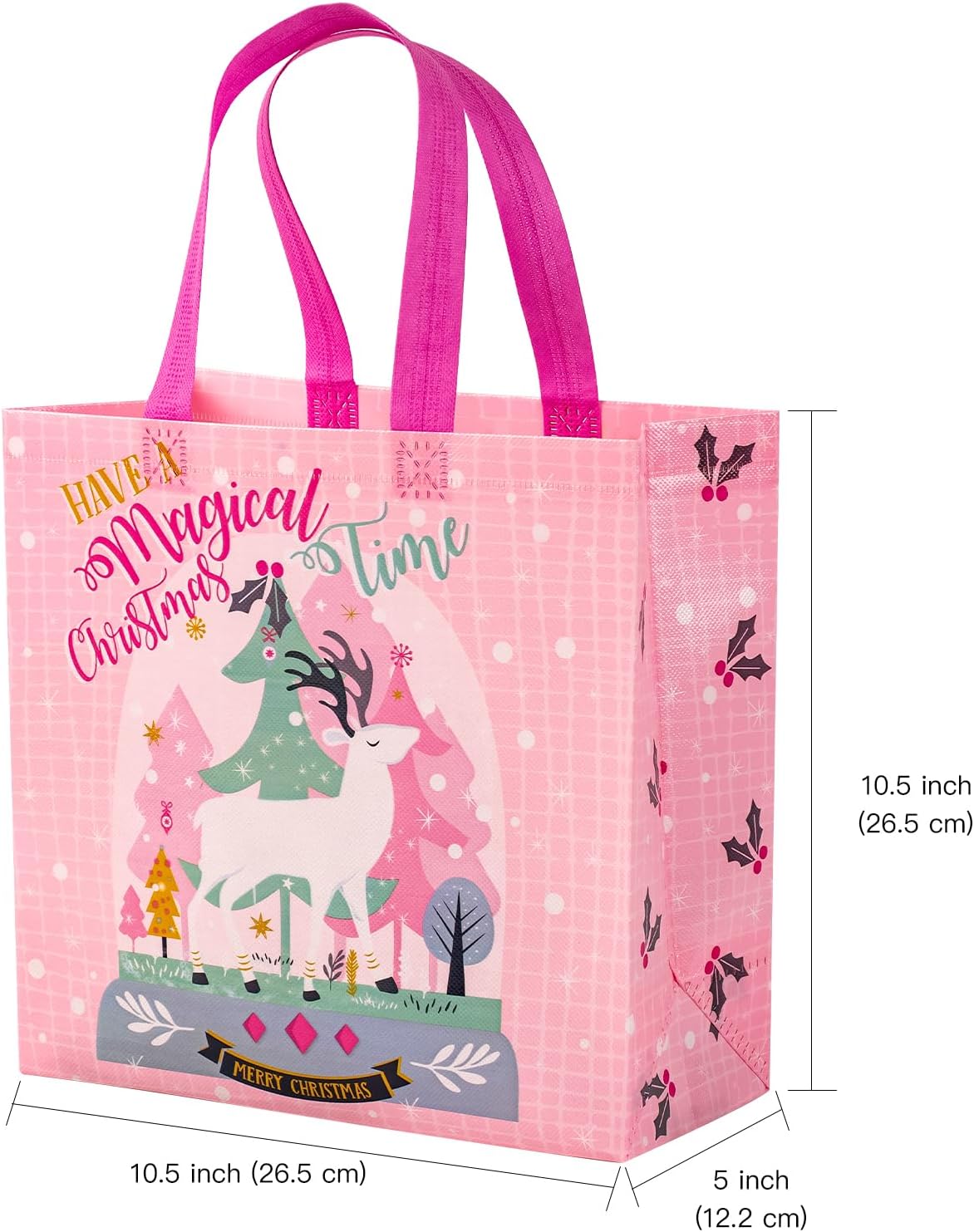 8 COUNT: riceverai 8 sacchetti per feste in 4 modelli diversi, ciascun modello in 2 pezzi. I sacchetti sono larghi 26,5 cm (10,5"), alti 26,5 cm (10,5") e profondi 12,2 cm (5"), il che li rende della dimensione perfetta per una varietà di dolcetti tra cui caramelle, biscotti, dessert, orsetti gommosi, cioccolato e giocattoli. DESIGN CREATIVO: i sacchetti per le feste di Natale sono dotati di 4 diversi fantastici motivi natalizi rosa, come schiaccianoci, cavallo, ballerina e renna, ecc. I colori vivaci e i motivi natalizi li rendono accattivanti, molto adatto per confezioni regalo e contenitori di caramelle, abbastanza squisito per creare scatole regalo che piacciono a bambine e bambini, o simpatiche decorazioni per feste a tema natalizio. ROBUSTO: il sacchetto regalo è realizzato in tessuto non tessuto di alta qualità e ha due manici per una lunga durata. La struttura robusta garantisce che durerà a lungo e può resistere all'uso quotidiano. Sostituisci le borse della spesa: le borse natalizie sono adatte per feste di Natale, camper, campeggio, feste, scambi di classe, carnevali, scuola domenicale o anche un evento in cui vengono distribuiti piccoli oggetti, ecc. ti fa risparmiare tempo quando incarti i regali e le borse sono riutilizzabili. ECOLOGICHE E RIUTILIZZABILI: Le nostre borse sono realizzate con l'80% di bottiglie di plastica riciclata, il che le rende un'opzione ecologica e riutilizzabile. I motivi colorati e interessanti le rendono una buona scelta per ogni occasione.