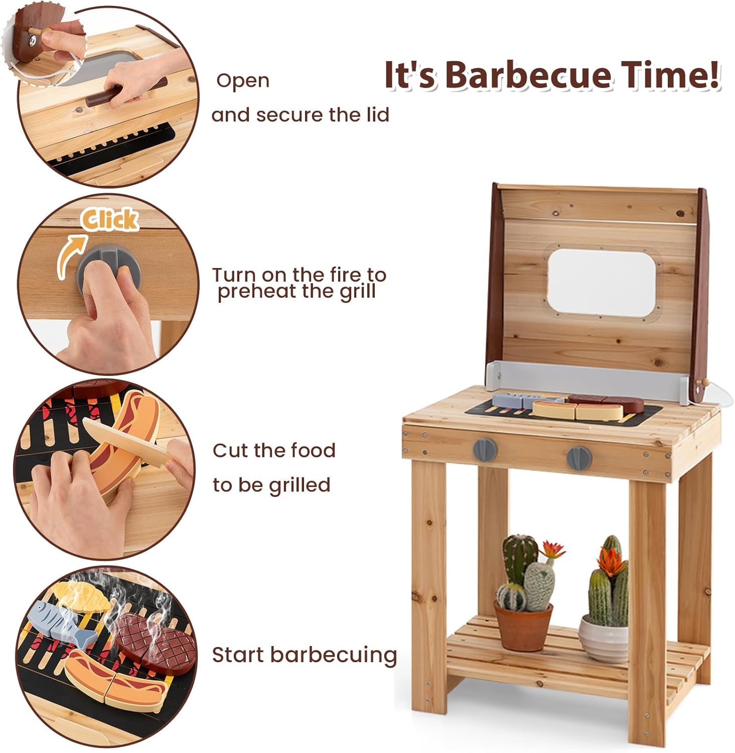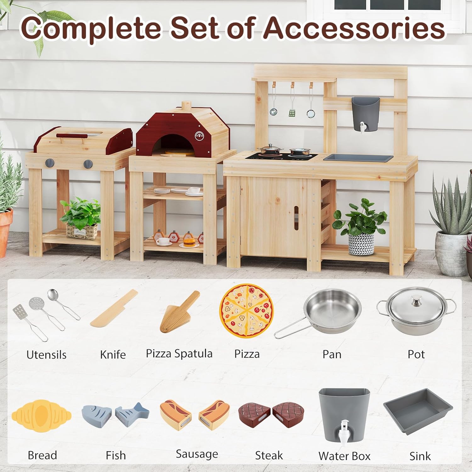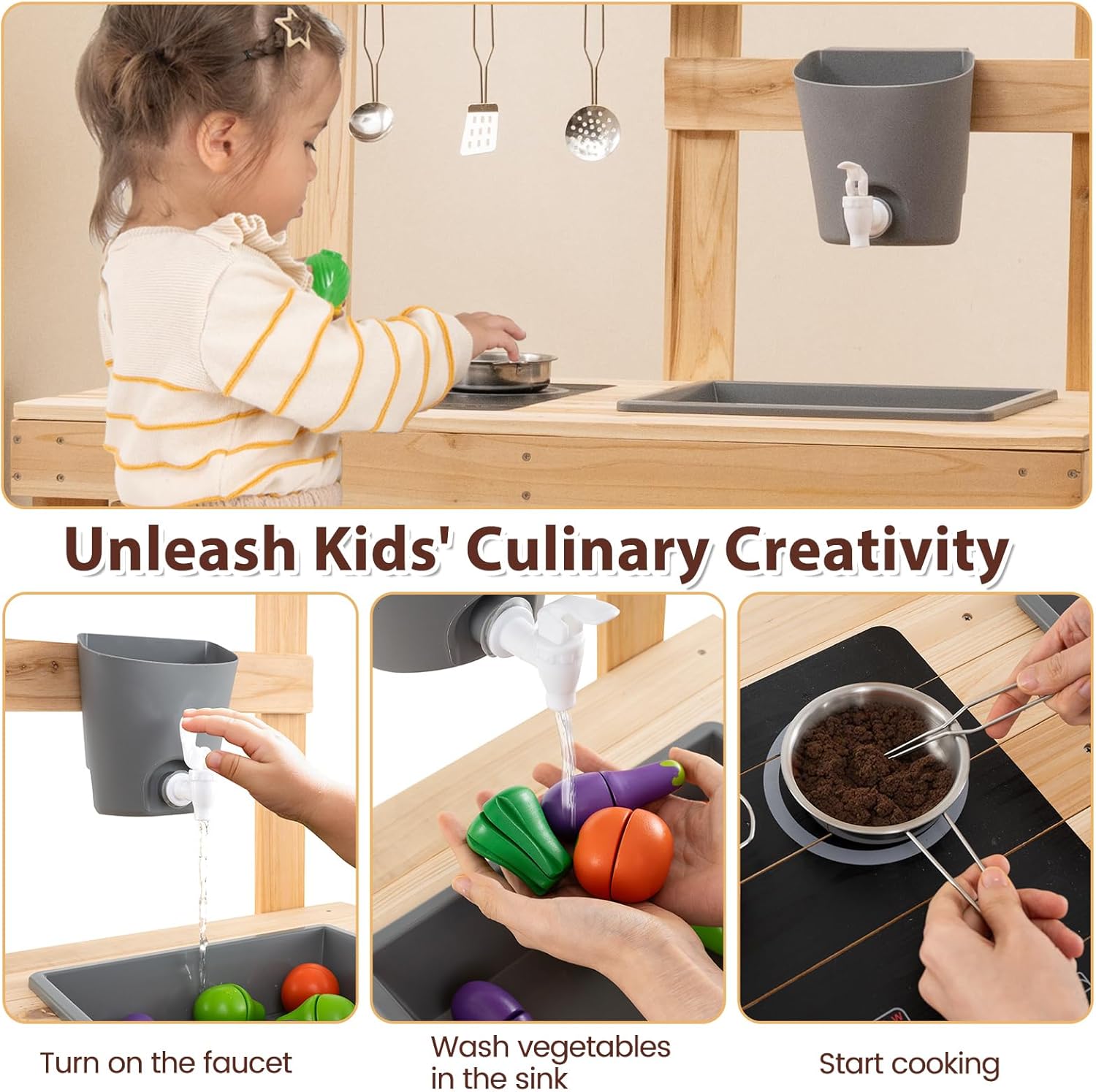 ESPERIENZA REALE DI CUCINA ALL'APERTO: Questo set di cucina giocattolo per bambini ha utensili da cucina molto realistici, pentole in acciaio inossidabile con ingredienti alimentari in legno, che emettono un suono "dandan" quando si mescolano. Le tre combinazioni in uno hanno diverse funzioni, il forno per barbecue simula la grigliata, il forno per pizza finta di fare la pizza, l'area cucina per lavare verdure e preparare gli ingredienti, si adatta perfettamente al contesto esterno, permettendo ai bambini di godersi la cucina COMBINAZIONI DIVERTENTI: Questo set di cucina legno per bambini è sfalsato e può essere diviso in combinazioni libere, consentendo ai bambini di abbinare diverse scenografie per aumentare il divertimento. Ha un serbatoio dell'acqua e un rubinetto, con un suono di flusso d'acqua realistico, il lavandino facilita la pulizia degli ingredienti alimentari dei giocattoli, e permette ai bambini di sviluppare la coordinazione motoria MATERIALI SICURI E DUREVOLI: Questo set di cucina per bambini in legno è realizzato con legno di alta qualità e pentole in acciaio inossidabile 201, solide, durevoli e resistenti alle sollecitazioni. Le dimensioni delle parti sono adatte e facili da impugnare, gli angoli sono arrotondati per evitare urti durante il gioco SPAZIO DI ARCHIVIAZIONE MULTIFUNZIONALE: Questo set di cucinetta per bambini ha un ripiano appendiutensili per appendere piccoli utensili da cucina, e ogni area può conservare ingredienti alimentari e pentole, permettendo ai bambini di riporre in modo ordinato e sviluppando l'abitudine all'organizzazione, rendendo anche più facile prendere e usare gli oggetti SVILUPPO DELLE CAPACITÀ: I bambini che giocano con questo set di giocattoli da cucina montessori possono imitare la cucina all'aperto, invitare amici a collaborare per condividere i "pasti", stimolando la creatività, migliorando le capacità sociali e comunicative, e crescendo continuamente mentre giocano
