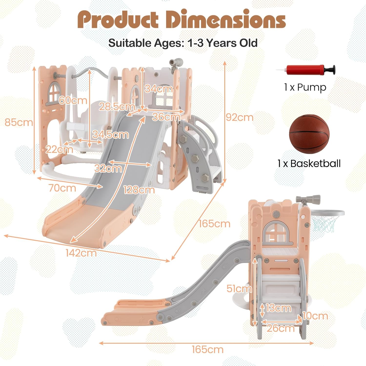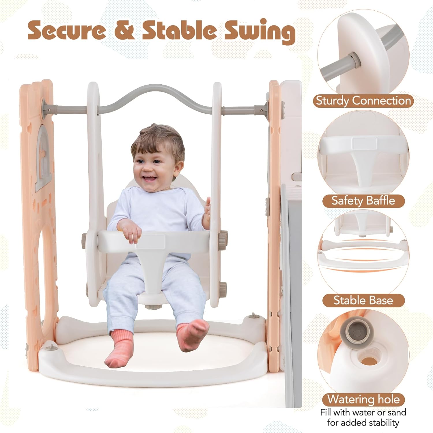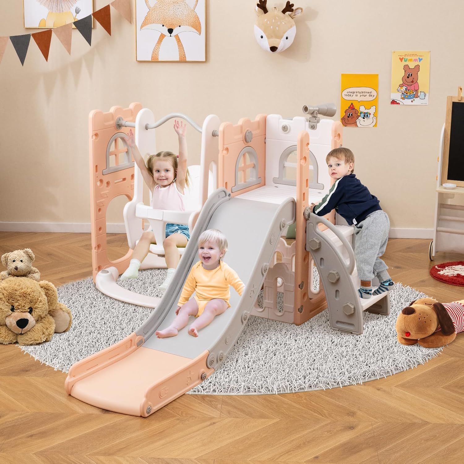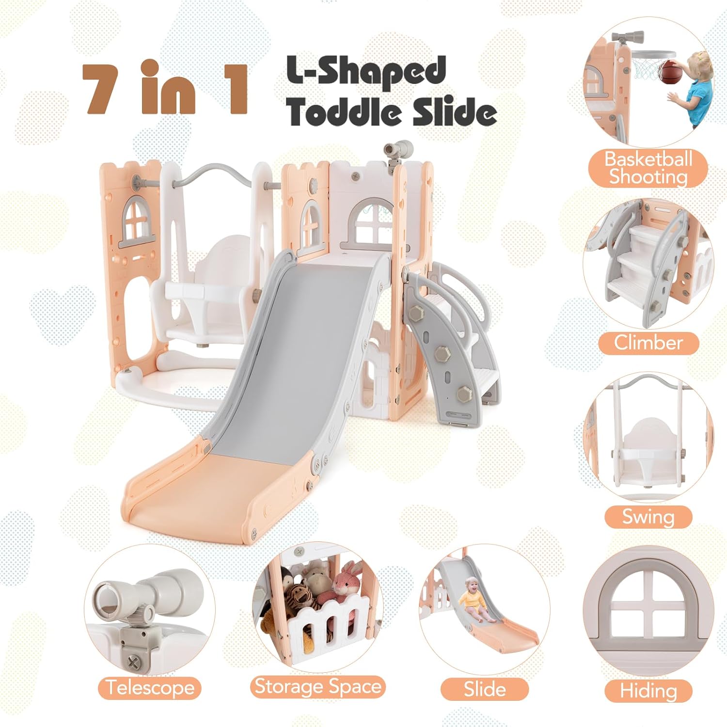 GIOCO MULTIFUNZIONALE 7 IN 1: Questo set include scivolo, altalena, scala, canestro da basket, telescopio, finestre e spazio di stoccaggio, offrendo ai bambini un'esperienza di gioco a 360 gradi. Arricchisce la varietà di giochi e stimola il loro interesse per l'attività fisica SCIVOLO SICOURE DIVISO IN SEZIONI: Suddiviso in zone di accelerazione, scivolata e ammortizzazione, lo scivolo per bambini garantisce una discesa sicura e confortevole. Il corrimano rialzato di 6,5 cm protegge i bambini, che atterrano in sicurezza mentre si divertono a scivolare ALTALENA STABILE E SICURA: L’altalena è dotata di una barriera di sicurezza. La base può essere riempita con acqua o sabbia per regolare il peso e aumentare la stabilità, proteggendo i bambini durante il gioco SCALA CON SICUREZZA OTTIMIZZATA: Le scale hanno corrimano comodi su entrambi i lati (presa stabile per salire) e gradini decorati con motivi a forma di piede — utili sia per rendere il gioco divertente sia per prevenire scivolamenti SVILUPPO LUDICO DELLE COMPETENZE: Attraverso diversi giochi, i bambini allenano le loro capacità motorie, cognitive e la coordinazione occhio-mano. Ideale per i bambini da 1 a 3 anni, questo set di parco giochi è il loro compagno di gioco ideale, aiutandoli a imparare e crescere divertendosi