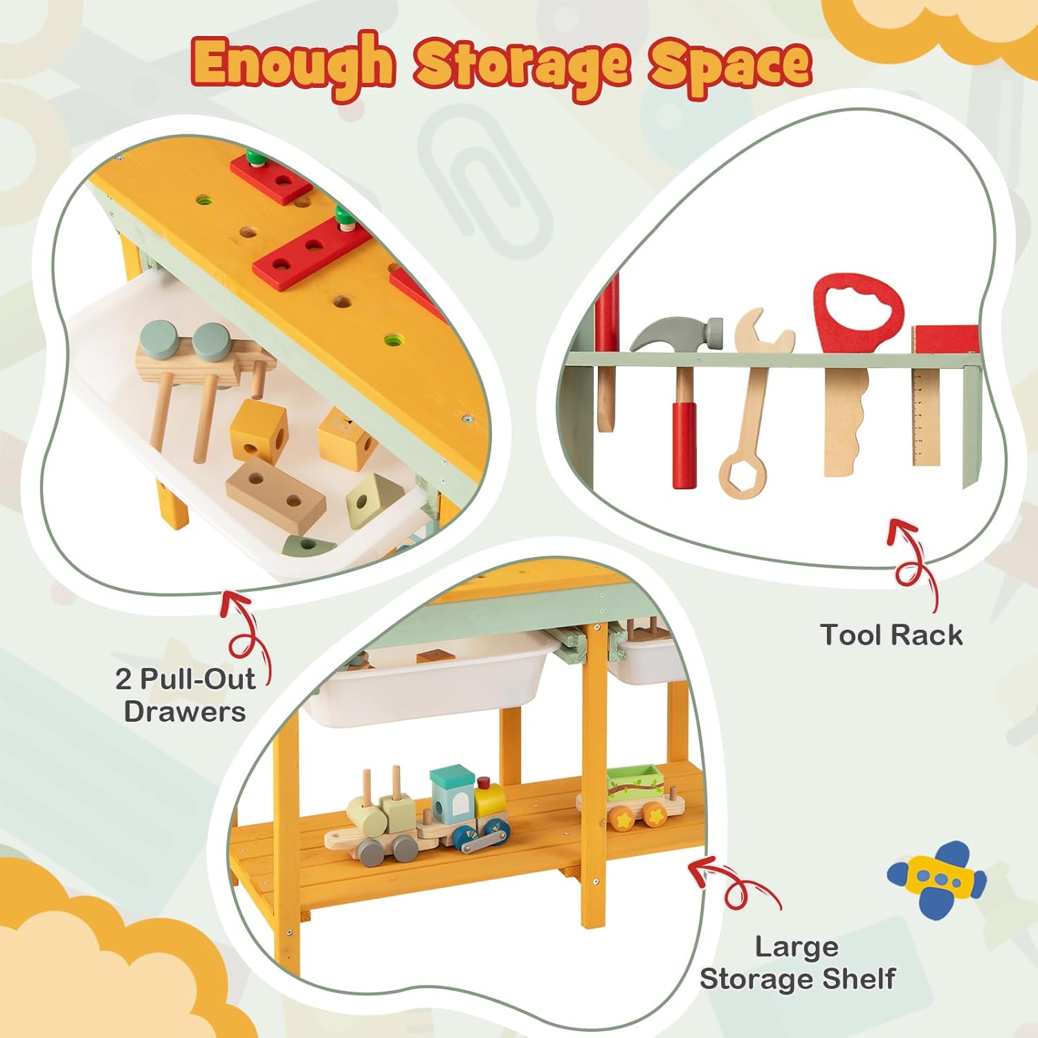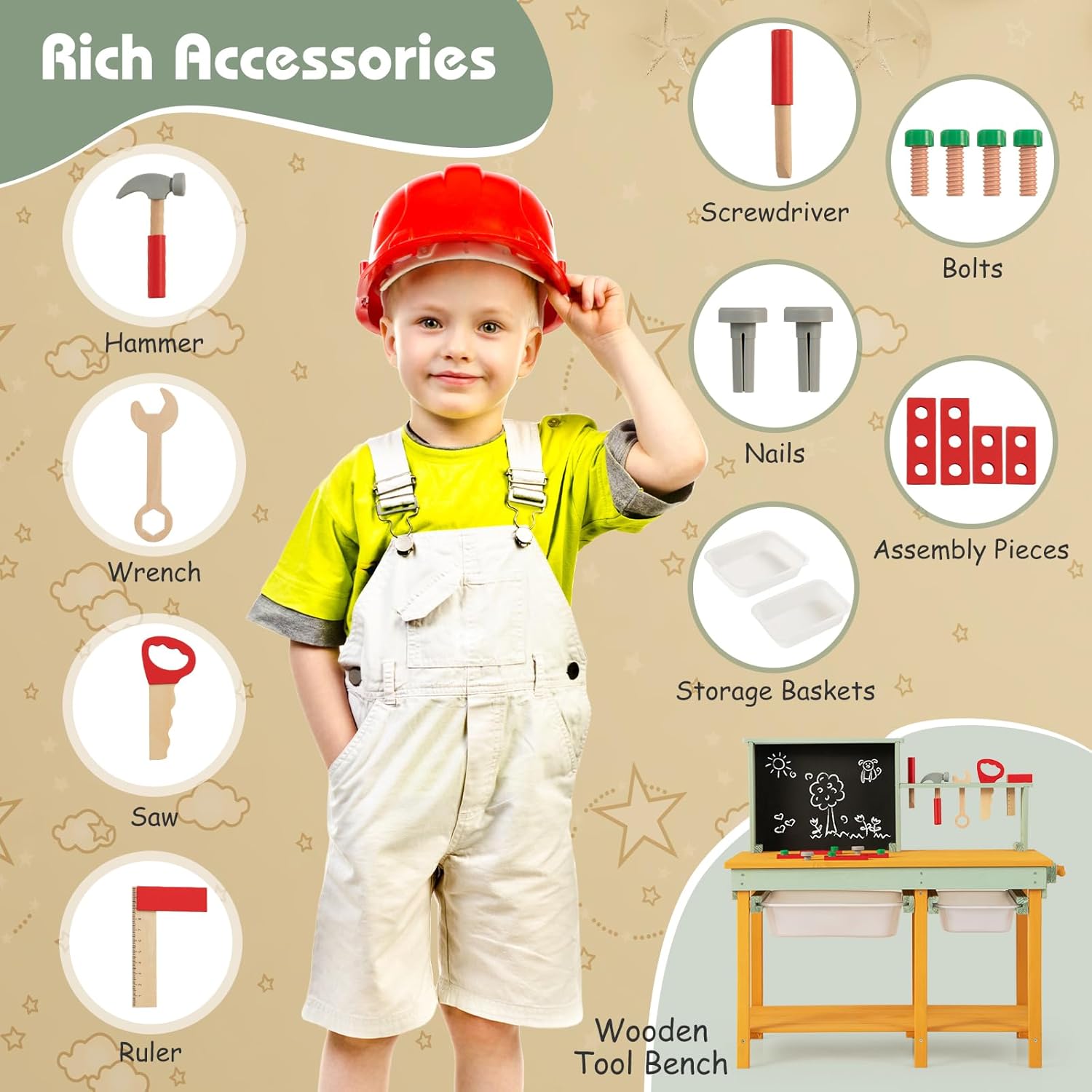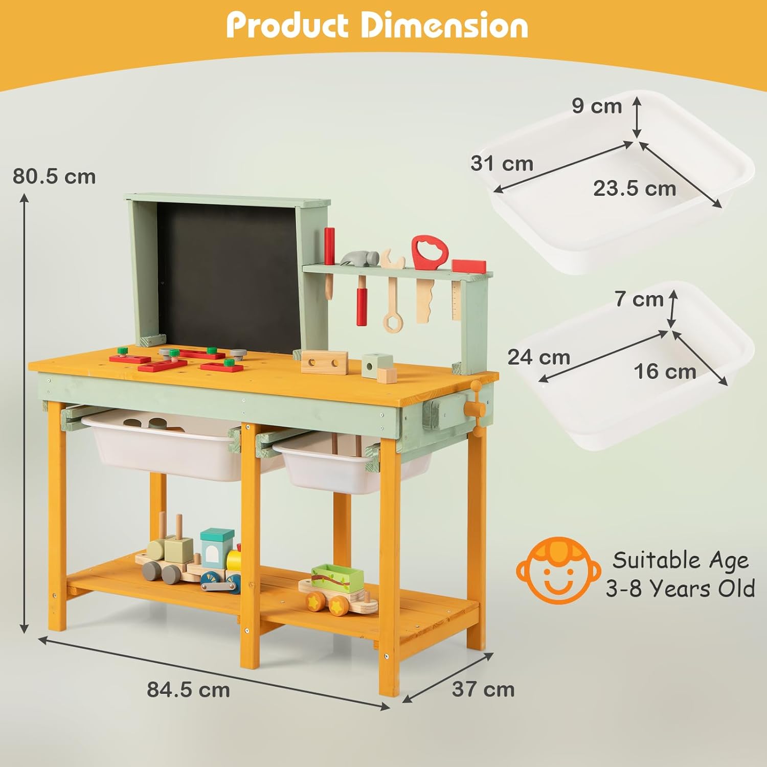🥳~Accessori multifunzionali~ Questo banco da lavoro per bambini viene fornito con 16 accessori che permettono ai bambini di sperimentare molteplici operazioni durante ore di divertimento. Inoltre, i bambini possono disegnare sul tavolo, inserire blocchi e usare la loro infinita immaginazione. 🥳~Design con ampio spazio di archiviazione~ Il tavolo da lavoro bambini in legno è dotato di un vassoio per attrezzi, ceste di archiviazione estraibili e un ampio scaffale inferiore, che fornisce ampio spazio di archiviazione, aiuta a sviluppare le abitudini organizzative dei tuoi figli e assicura che i piccoli giocattoli non vadano persi. 🥳~Telaio stabile e sicuro~ Il banchetto da lavoro bambini è realizzato in legno di abete di alta qualità per una struttura stabile e resistente. Tutte le parti e gli attrezzi sono attentamente progettati per non avere schegge di legno e i bordi sono arrotondati per garantire la sicurezza dei tuoi figli e evitare lesioni accidentali. 🥳~Divertimento educativo con il banco da lavoro~ Questo banco da lavoro bambino da esterno non è solo divertente, ma anche educativo. Riconoscendo e utilizzando gli attrezzi, sviluppa le abilità pratiche, l'immaginazione, il pensiero e la cooperazione dei bambini, permettendo loro di imparare e crescere mentre si divertono. 🥳~Per anni di utilizzo~ Questo gioco per bambini da esterno è adatto per bambini dai 3 agli 8 anni, e l'altezza è ottimizzata per facilitare il gioco dei bambini. Come opzione regalo per compleanni, Natale e altre festività, offre ai bambini un'esperienza di gioco di lusso, ispira il loro amore per la costruzione e crea infinite opportunità per il gioco immaginativo!