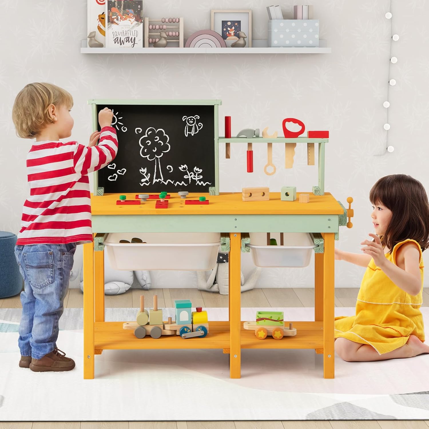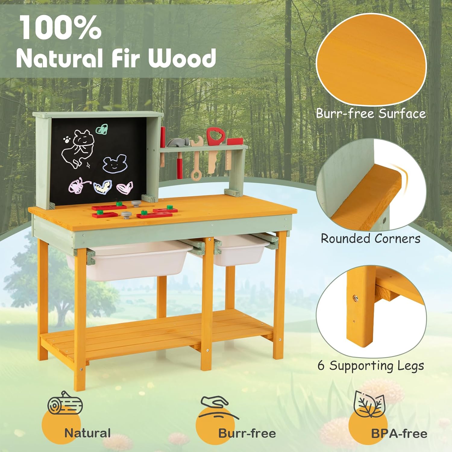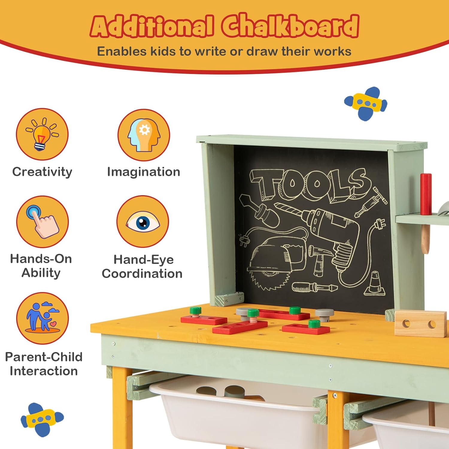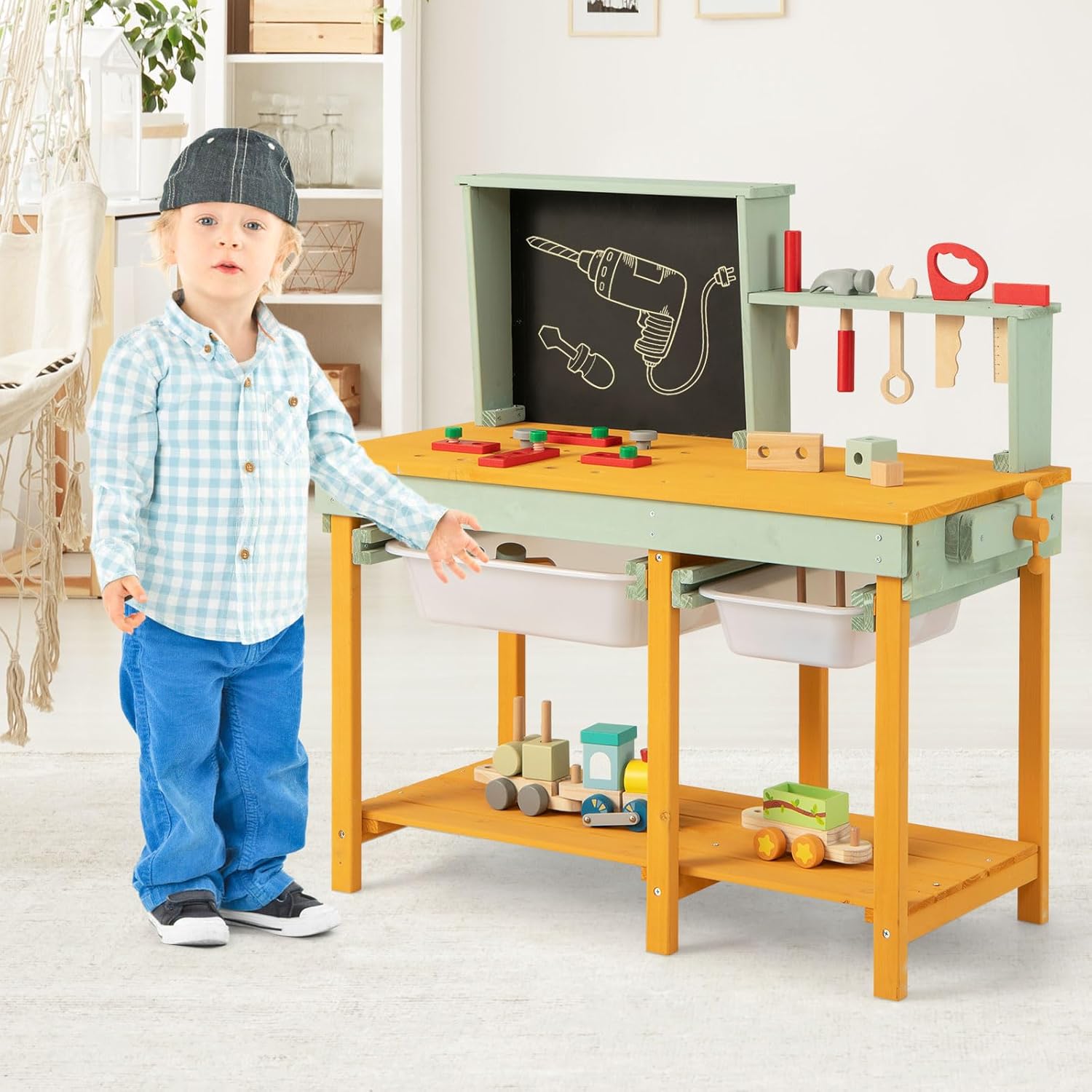 🥳~Accessori multifunzionali~ Questo banco da lavoro per bambini viene fornito con 16 accessori che permettono ai bambini di sperimentare molteplici operazioni durante ore di divertimento. Inoltre, i bambini possono disegnare sul tavolo, inserire blocchi e usare la loro infinita immaginazione. 🥳~Design con ampio spazio di archiviazione~ Il tavolo da lavoro bambini in legno è dotato di un vassoio per attrezzi, ceste di archiviazione estraibili e un ampio scaffale inferiore, che fornisce ampio spazio di archiviazione, aiuta a sviluppare le abitudini organizzative dei tuoi figli e assicura che i piccoli giocattoli non vadano persi. 🥳~Telaio stabile e sicuro~ Il banchetto da lavoro bambini è realizzato in legno di abete di alta qualità per una struttura stabile e resistente. Tutte le parti e gli attrezzi sono attentamente progettati per non avere schegge di legno e i bordi sono arrotondati per garantire la sicurezza dei tuoi figli e evitare lesioni accidentali. 🥳~Divertimento educativo con il banco da lavoro~ Questo banco da lavoro bambino da esterno non è solo divertente, ma anche educativo. Riconoscendo e utilizzando gli attrezzi, sviluppa le abilità pratiche, l'immaginazione, il pensiero e la cooperazione dei bambini, permettendo loro di imparare e crescere mentre si divertono. 🥳~Per anni di utilizzo~ Questo gioco per bambini da esterno è adatto per bambini dai 3 agli 8 anni, e l'altezza è ottimizzata per facilitare il gioco dei bambini. Come opzione regalo per compleanni, Natale e altre festività, offre ai bambini un'esperienza di gioco di lusso, ispira il loro amore per la costruzione e crea infinite opportunità per il gioco immaginativo!