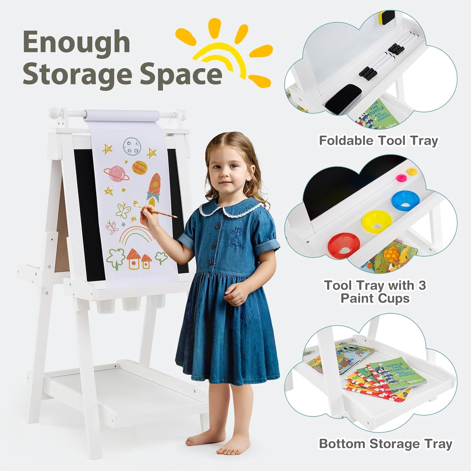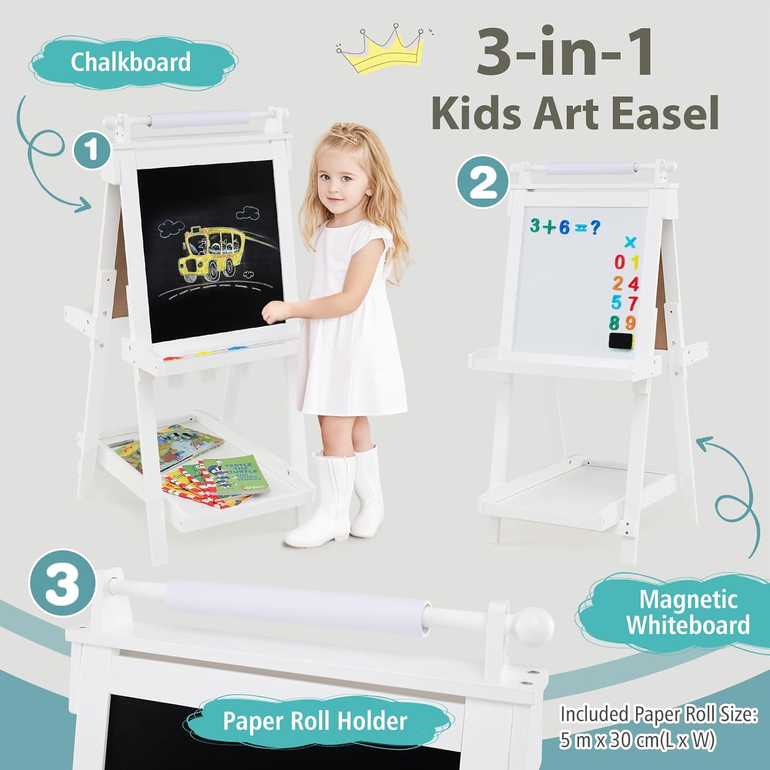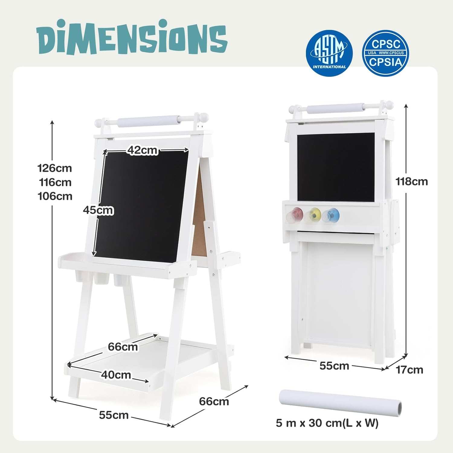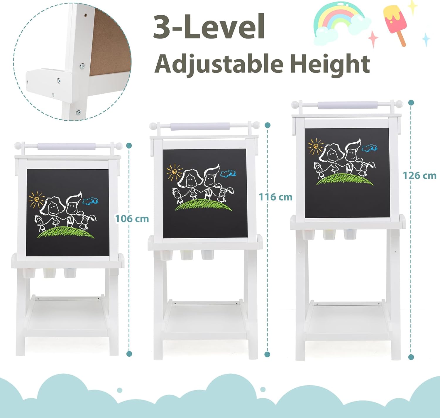 REGOLAZIONE ALTEZZA VERSATILE: Il cavalletto pittura bambini dispone di tre opzioni di altezza (106 cm, 116 cm e 126 cm), adattandosi facilmente ai bambini di diverse età. Ideale per l'uso dalla scuola materna alle prime classi, accompagnando la crescita dei più piccoli e garantendo durata nel tempo DESIGN MULTIUSO: La lavagna per bambini offre due superfici; una per disegnare con gessetti e un'altra per matite acquerellabili. Passate da una all'altra per stimolare la creatività dei bambini, raddoppiando il divertimento nella pittura e soddisfacendo in modo versatile le esigenze artistiche ARCHIVIAZIONE PRATICA: Dotato di vassoi nella parte centrale e inferiore, questo cavalletto per dipingere bambini offre spazio per riporre pennelli, gessetti e altri accessori. Inoltre, tre bicchieri esclusivi consentono di organizzare la pittura, promuovendo abitudini ordinate e mantenendo un ambiente creativo e pulito PIEGATURA SEMPLICE: Il design pieghevole di questo cavalletto per bambini lo rende facile da riporre senza occupare troppo spazio in casa. Leggero e pratico, è la scelta perfetta per famiglie piccole, consentendo ai bambini di godersi la pittura in qualsiasi momento senza complicazioni PULIZIA FACILE: La superficie della lavagna con cavalletto è facile da cancellare, eliminando facilmente residui di gessetto e pennarelli ad acqua. Il rotolo di carta integrato facilita la creatività dei bambini e può essere sostituito rapidamente una volta che hanno finito di disegnare, mantenendo il divertimento senza preoccupazioni