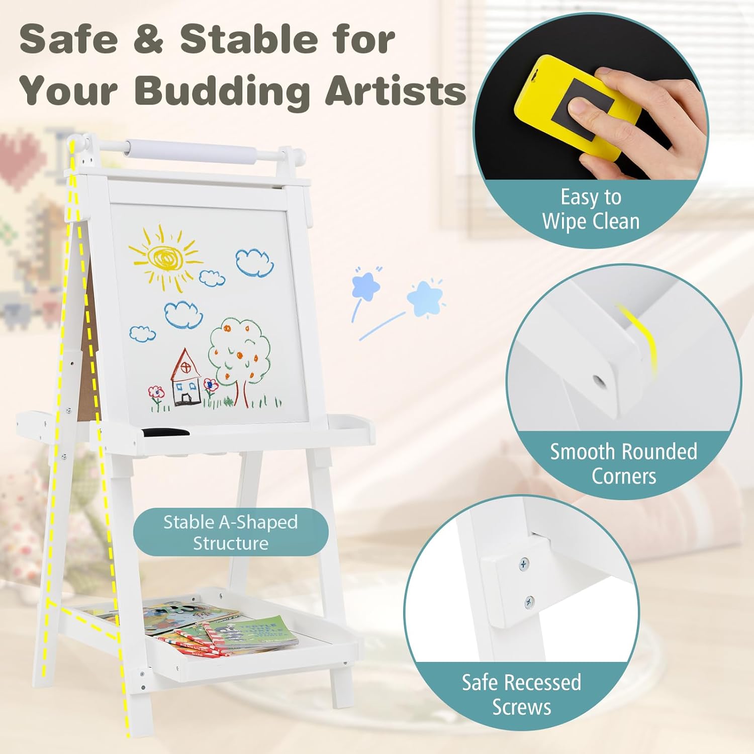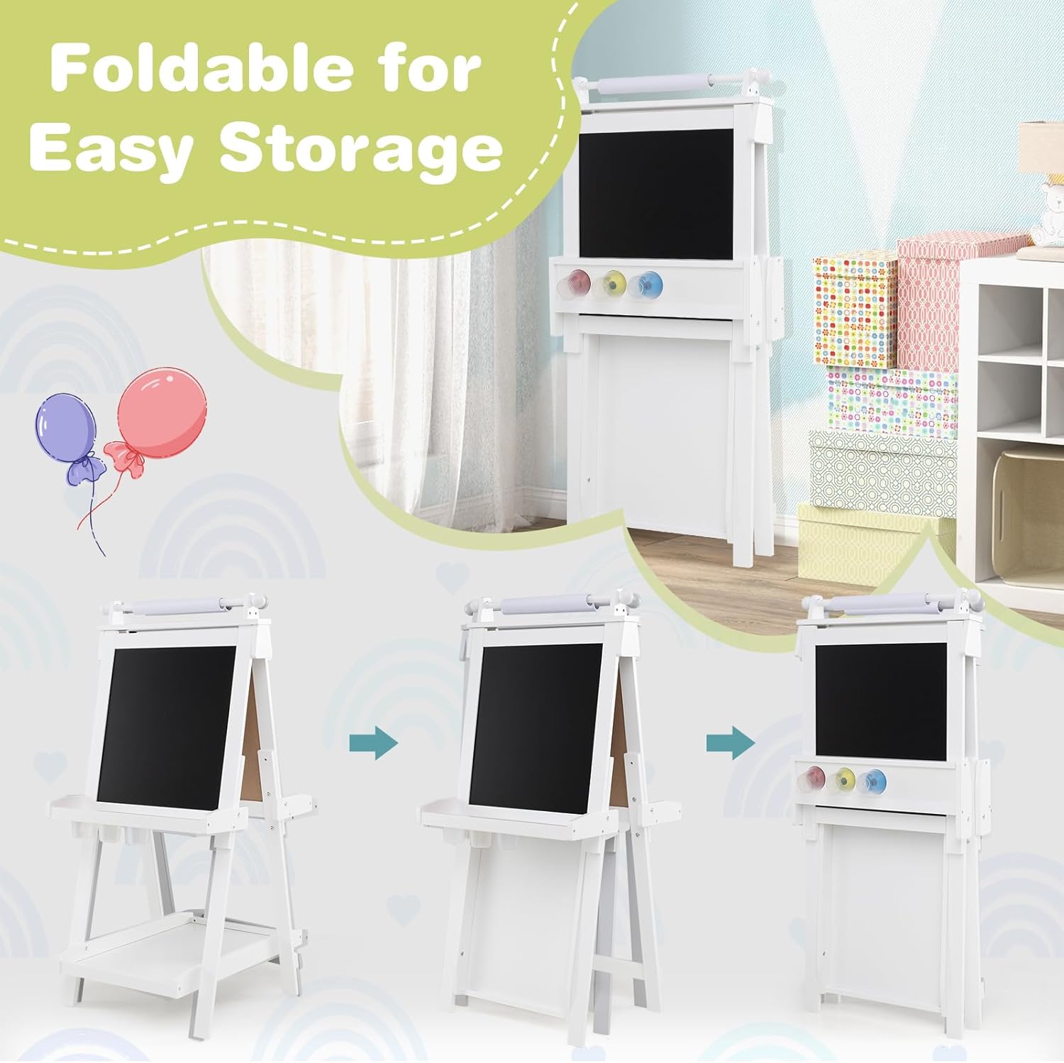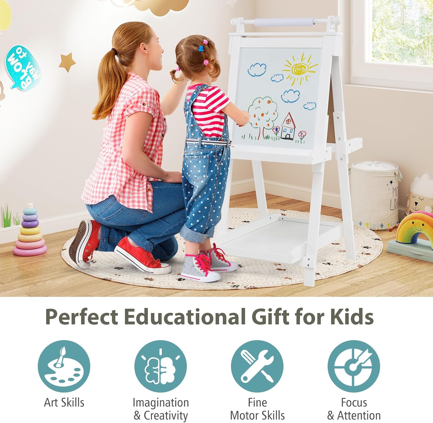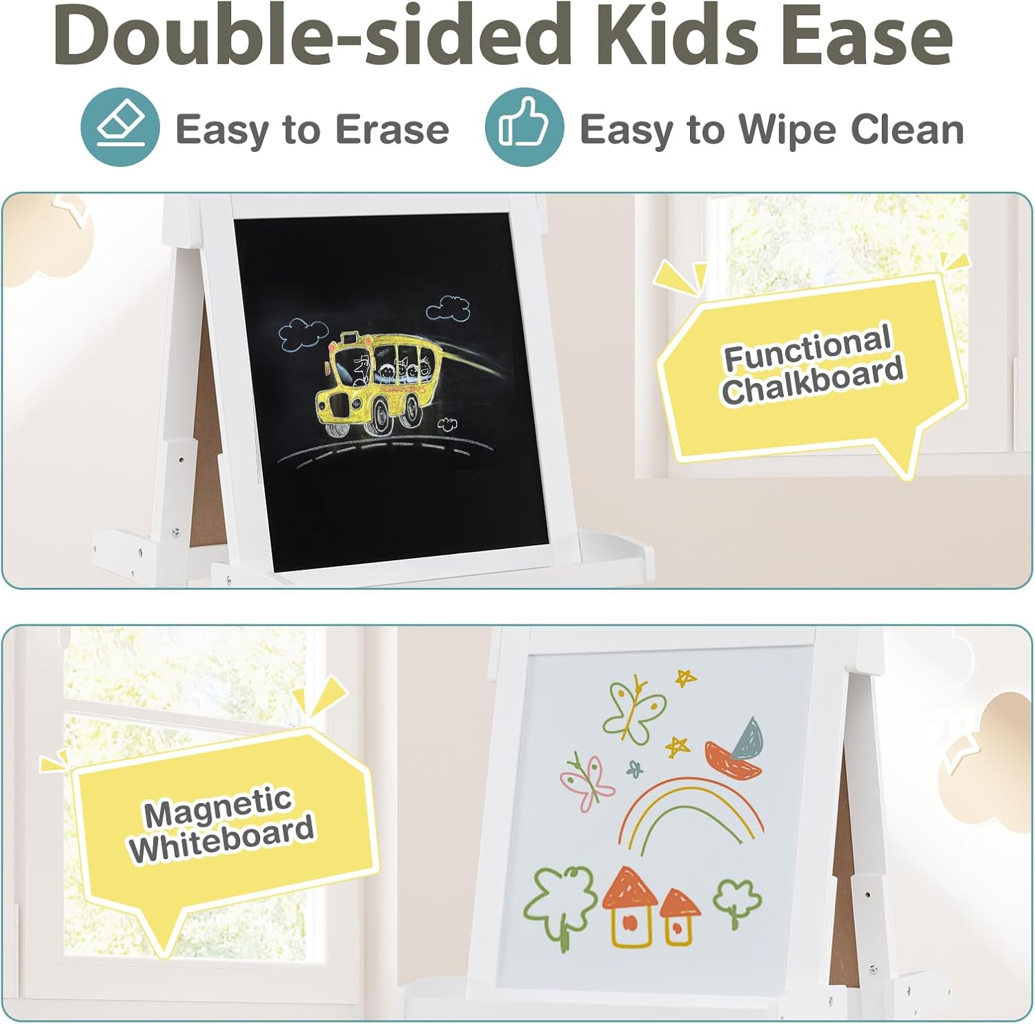 REGOLAZIONE ALTEZZA VERSATILE: Il cavalletto pittura bambini dispone di tre opzioni di altezza (106 cm, 116 cm e 126 cm), adattandosi facilmente ai bambini di diverse età. Ideale per l'uso dalla scuola materna alle prime classi, accompagnando la crescita dei più piccoli e garantendo durata nel tempo DESIGN MULTIUSO: La lavagna per bambini offre due superfici; una per disegnare con gessetti e un'altra per matite acquerellabili. Passate da una all'altra per stimolare la creatività dei bambini, raddoppiando il divertimento nella pittura e soddisfacendo in modo versatile le esigenze artistiche ARCHIVIAZIONE PRATICA: Dotato di vassoi nella parte centrale e inferiore, questo cavalletto per dipingere bambini offre spazio per riporre pennelli, gessetti e altri accessori. Inoltre, tre bicchieri esclusivi consentono di organizzare la pittura, promuovendo abitudini ordinate e mantenendo un ambiente creativo e pulito PIEGATURA SEMPLICE: Il design pieghevole di questo cavalletto per bambini lo rende facile da riporre senza occupare troppo spazio in casa. Leggero e pratico, è la scelta perfetta per famiglie piccole, consentendo ai bambini di godersi la pittura in qualsiasi momento senza complicazioni PULIZIA FACILE: La superficie della lavagna con cavalletto è facile da cancellare, eliminando facilmente residui di gessetto e pennarelli ad acqua. Il rotolo di carta integrato facilita la creatività dei bambini e può essere sostituito rapidamente una volta che hanno finito di disegnare, mantenendo il divertimento senza preoccupazioni