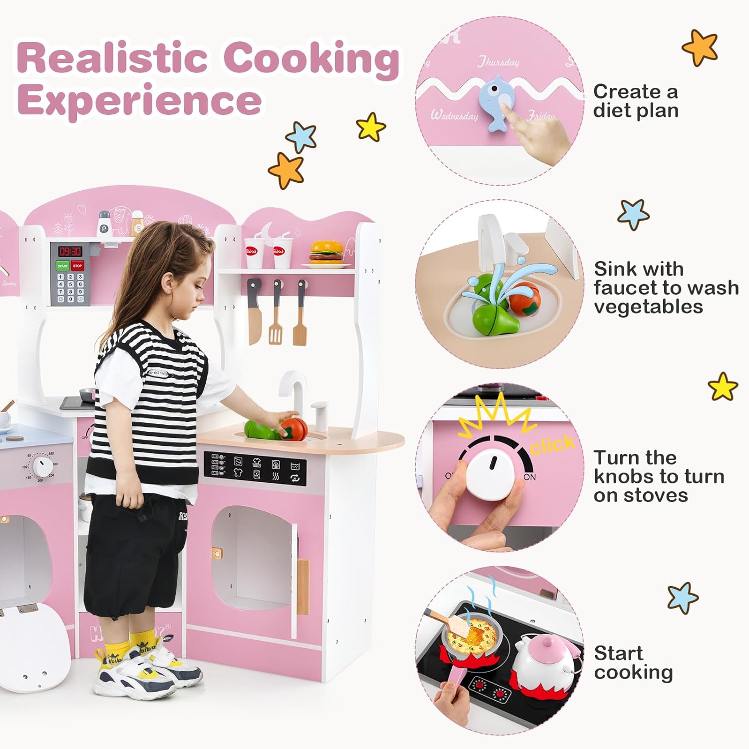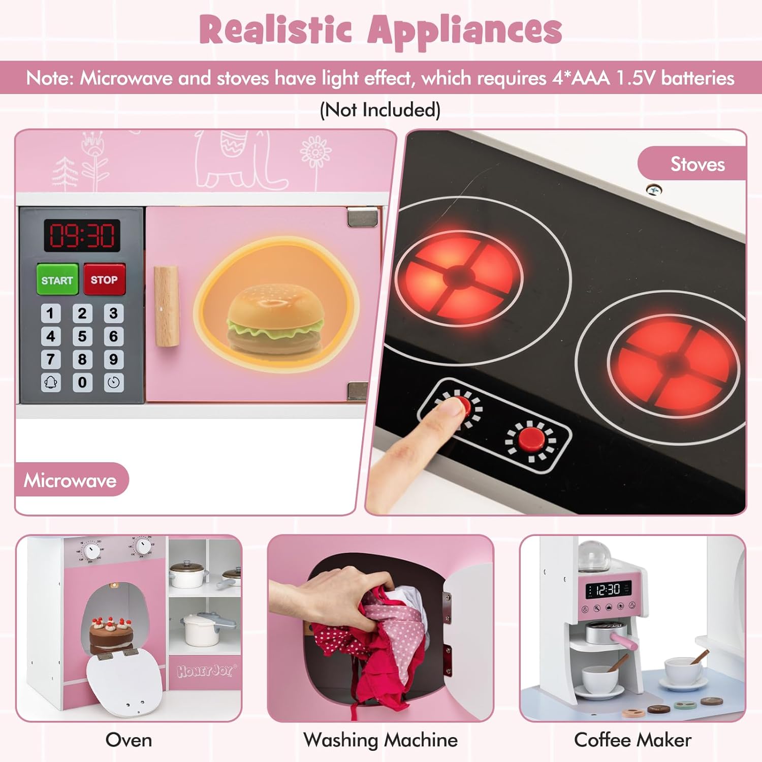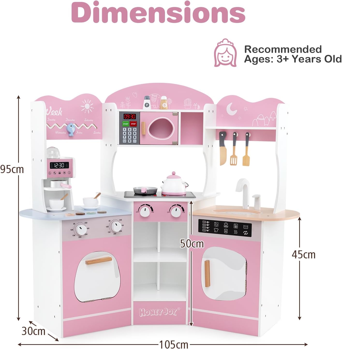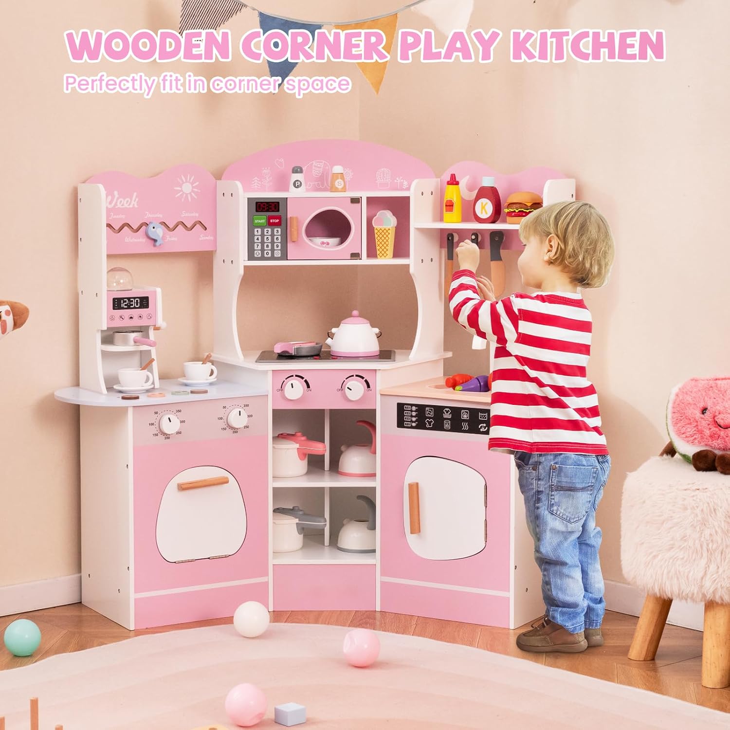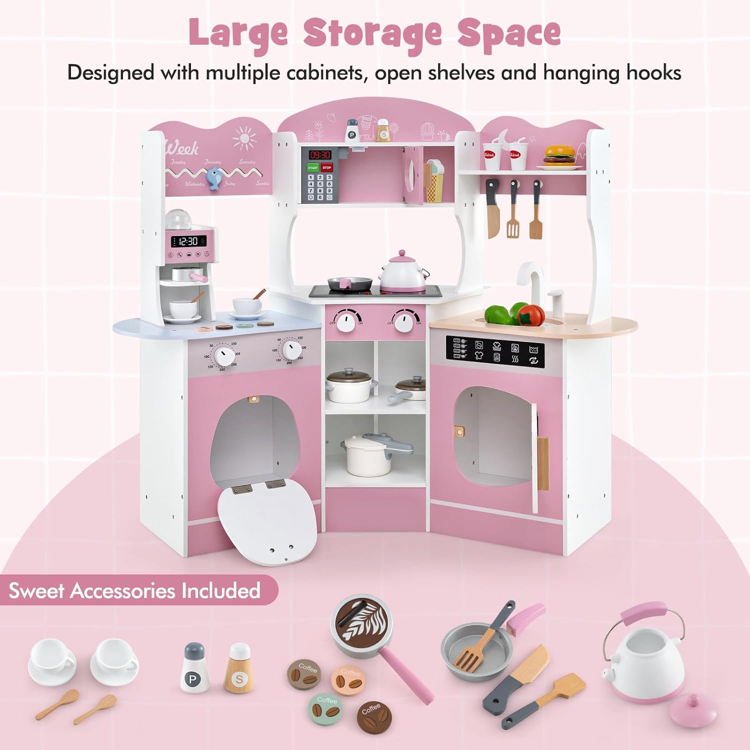 GIOCO DA CUCINA PER BAMBINI REALISTICO: Questa cucina legno per bambini include elementi da cucina realistici come una piastra di cottura elettronica, un forno a microonde elettronico, una macchina per il caffè, una lavatrice, un forno, ecc., tutti dotati di luci e effetti sonori, in modo che il vostro bambino possa sentirsi come se fosse nel mondo reale della cucina PICCOLA ANGOLO DEL CAFFÈ: Il set di giocattoli da cucina giocattolo legno include una macchina per il caffè realistica che simula il processo di preparazione del caffè. I bambini possono scegliere i chicchi di caffè, macinarli e farli bollire. Girare la manopola che emette un "clic" non solo attira l'attenzione dei bambini, ma promuove anche la loro creatività e abilità pratiche durante il gioco ABBONDANTE ACCESSORI DA GIOCO: La cucina giocattolo è dotata di una varietà di accessori, tra cui set di tazze da caffè, coltelli, spatole, pentola, manopole, bollitore, filtro per il caffè, caffè, bottiglia di spezie ecc., che offrono ai bambini più opportunità di gioco e più aree di gioco nel gioco della cucina STOCCAGGIO EXTRA: La cucina d'angolo è astutamente progettata con diversi armadietti, ripiani aperti e ganci per offrire abbondante spazio di archiviazione. I bambini possono tenere in ordine e organizzare i loro accessori da gioco e sviluppare abitudini di organizzazione sin da piccoli. Il design d'angolo risparmia spazio e può essere collocato in ogni angolo, rendendo l'ambiente di gioco del vostro bambino più ordinato e spazioso MATERIALE SICURO: La cucinetta per bambini è realizzata in MDF con una superficie liscia senza schegge di legno e bordi arrotondati per evitare che il vostro bambino si faccia male durante il gioco. Inoltre, il piano di lavoro è di altezza moderata (45/50 cm), comodo da usare per i bambini, e più bambini possono giocare contemporaneamente e godersi un felice tempo in cucina