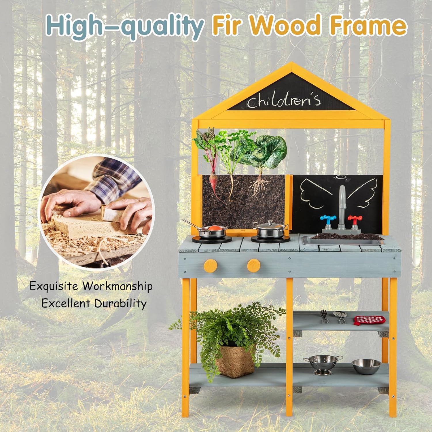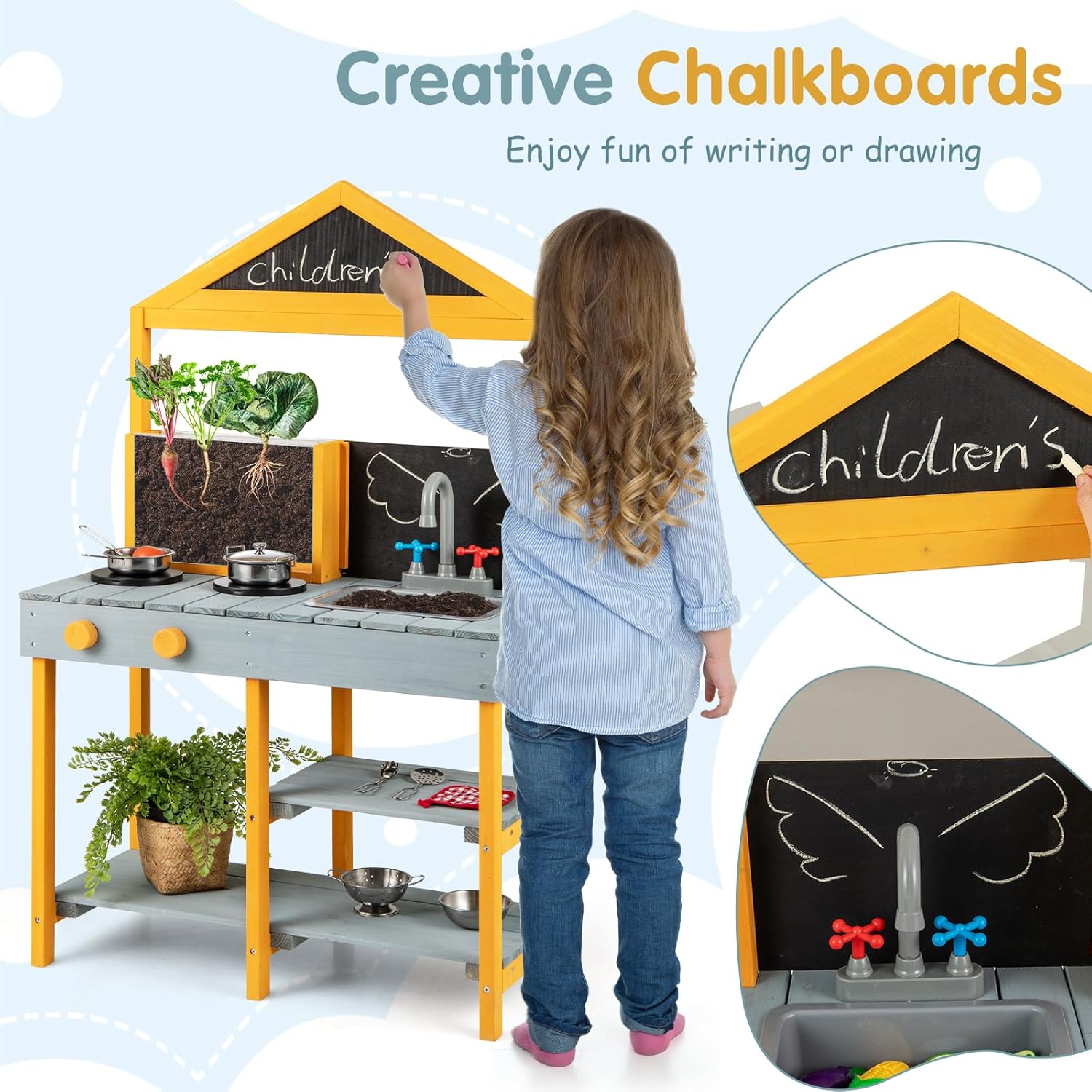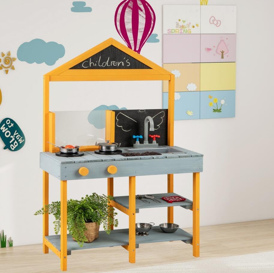 CUCINA MULTIFUNZIONALE PER BAMBINI DA ESTERNO: Questa cucina giocattolo per bambini da giardino non solo è dotata di 2 lavelli e rubinetti estraibili, ma anche di 2 lavagnette creative e ripiani aperti, che permettono ai bambini di giocare con la propria immaginazione, ma anche di sviluppare buoni hábiti di organizzazione e ordine GIOCATTOLI CREATIVI PER VASI DA PIANTARE: Oltre ai giocattoli da cucina come forni simulati e pentole e padelle, questo giocattolo da esterno per bambini è anche equipaggiato con vasi trasparenti per piantare con osservazione delle radici, che permettono ai piccoli giardinieri di osservare il processo di crescita delle piante mentre sperimentano il divertimento del piantare MATERIALE NATURALE IN ABETE: La nostra cucina da esterno per bambini è realizzata in abete naturale di alta qualità, abbastanza resistente e durevole da rimanere con i bambini per anni, offrendo loro uno spazio di gioco sicuro e affidabile MIGLIORA LE ABILITÀ PRATICHE: I bambini devono mescolare fango e acqua per cuocere e cucinare durante il gioco, perfezionando così le loro abilità pratiche e motorie fini, permettendo loro di imparare e crescere attraverso il gioco SCELTA REGALO PERFETTA: Questo giocattolo da cucina per bambini è un regalo ideale per il compleanno o le vacanze del tuo bambino, adatto ai bambini dai 3 anni in su, permettendo loro di divertirsi mentre incoraggia la loro creatività e immaginazione